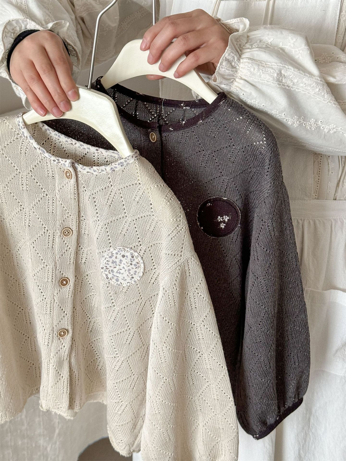 花柄のパッチワークデザインが魅力のニットカーディガンです。柔らかな肌触りの生地を使用し、快適な着心地を実現。カットアウトデザインがさりげない抜け感を演出し、シンプルながらも華やかさのある仕上がりになっています。ラウンドネック仕様で、カジュアルにもきれいめにも合わせやすいデザイン。軽やかなニット素材のため、季節の変わり目にぴったりの一着です。