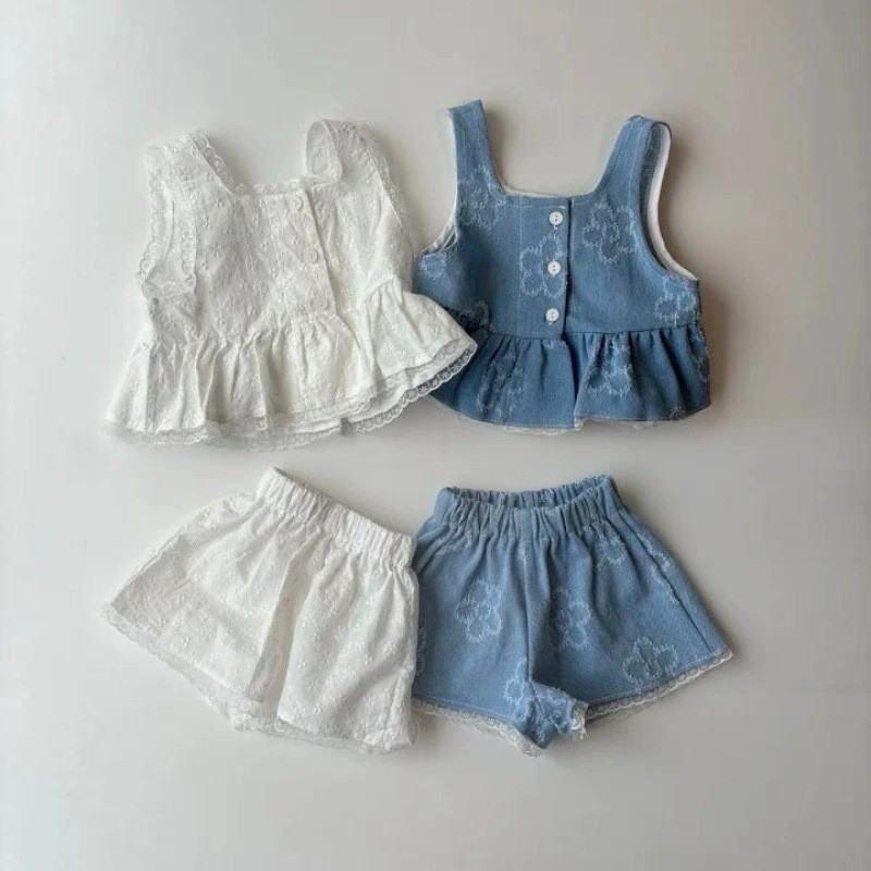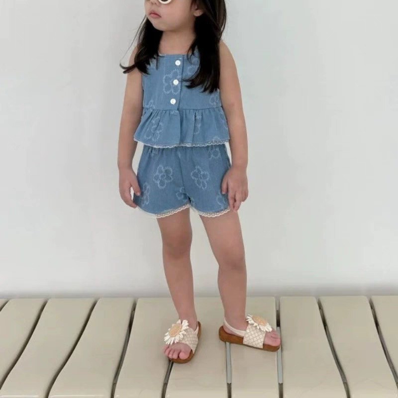 夏のおしゃれにぴったりの、フラワーデニムキャミソールトップスとショートパンツのセットアップです。カジュアルながらもトレンド感あふれる、女の子ベビーやキッズ向けの2点セット。