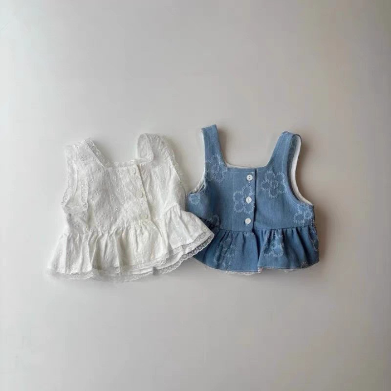トップスは、涼しげなデニム素材のキャミソール。全体に施されたフラワーモチーフの刺繍やアップリケが、甘さをプラスします。ボトムスは、動きやすいデニムショートパンツ。ウエストはゴム仕様で、お着替えも楽にできます。