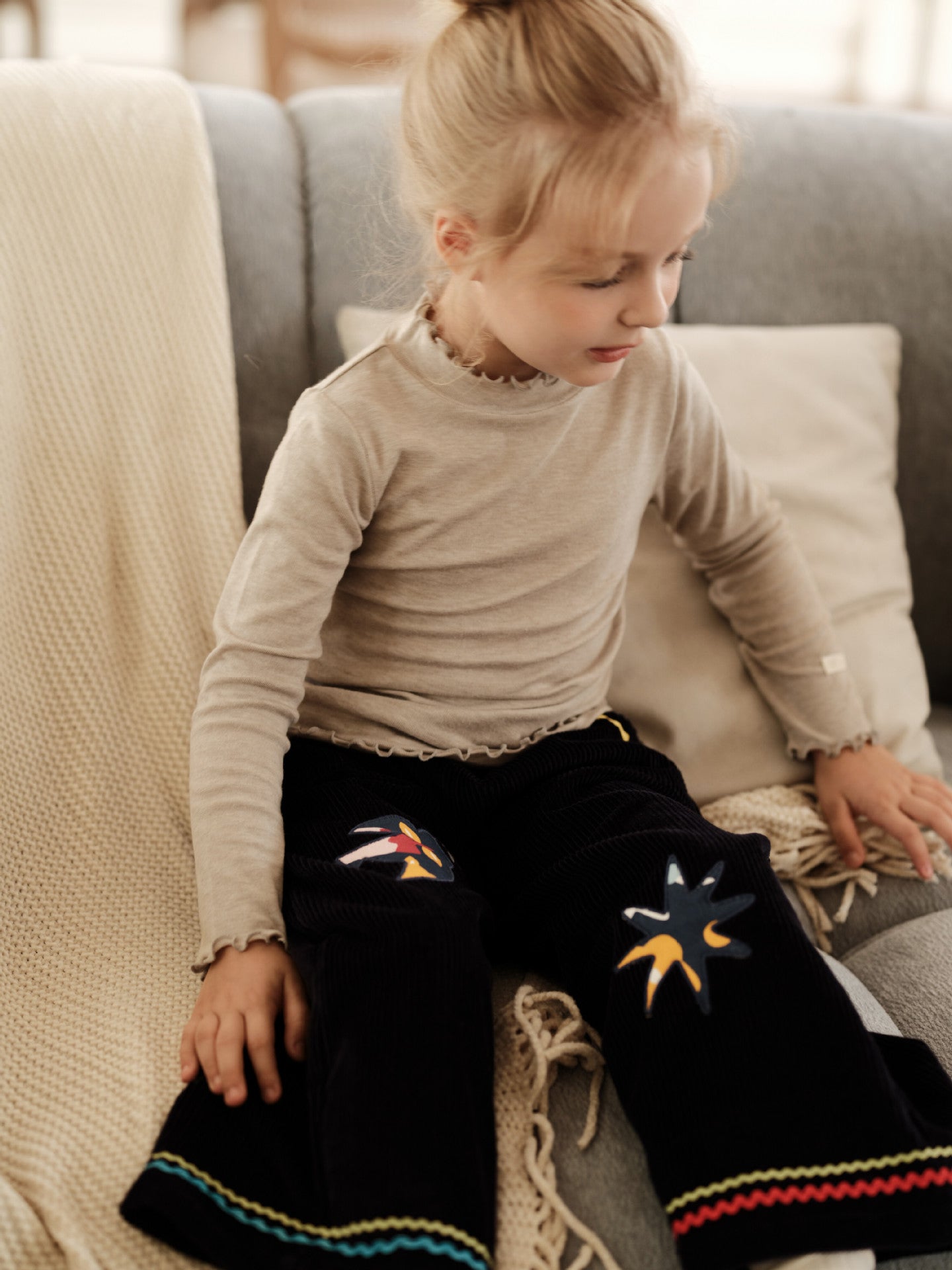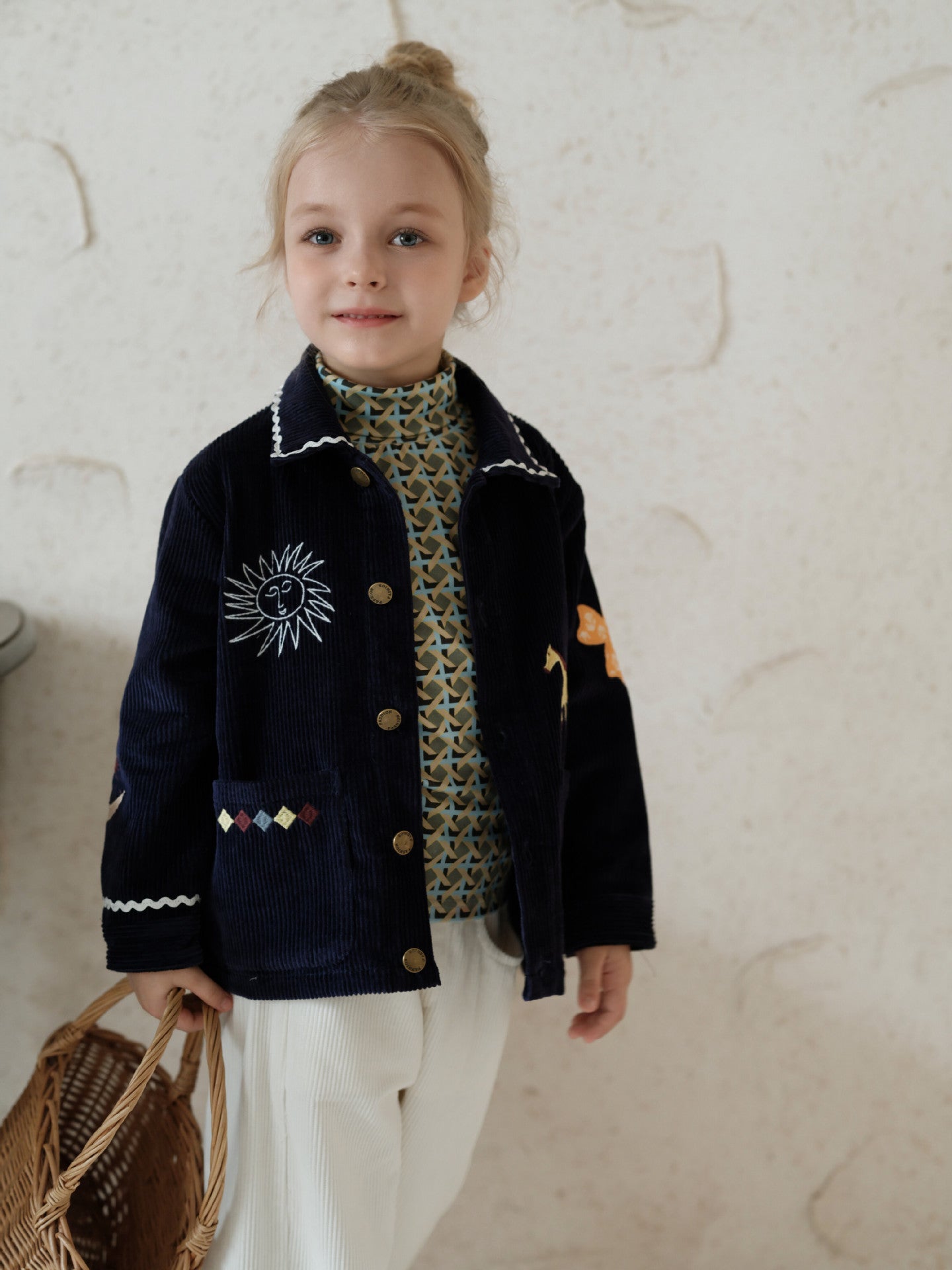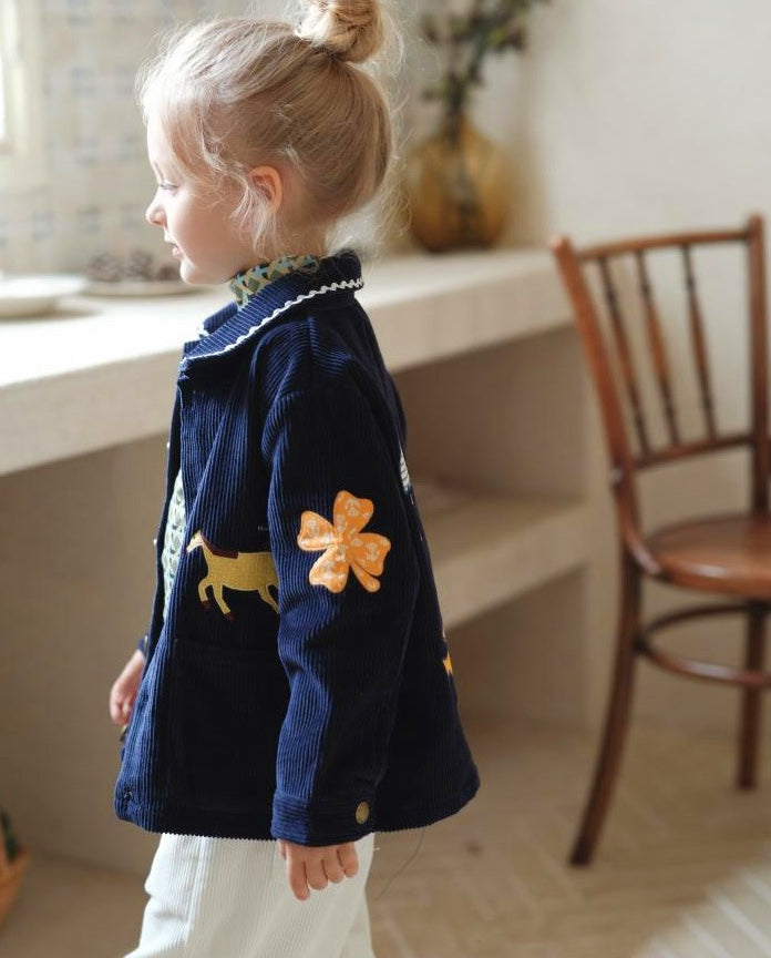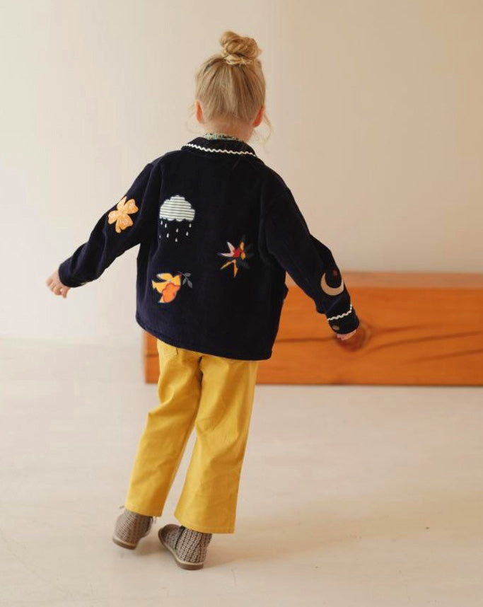 温かみのあるコーデュロイ素材に、遊び心のある刺繍を散りばめたキッズのジャケットとパンツのセットアップです。ゆったりとしたワイドシルエットが今どきのカジュアルスタイルを作り出し、動きやすさも抜群の子ども服です。羽織りやすいジャケットと、ウエストゴムのトラウザーは、それぞれ単品でも着回せる汎用性の高いデザインで、元気なベビーのデイリーユースを彩ります。