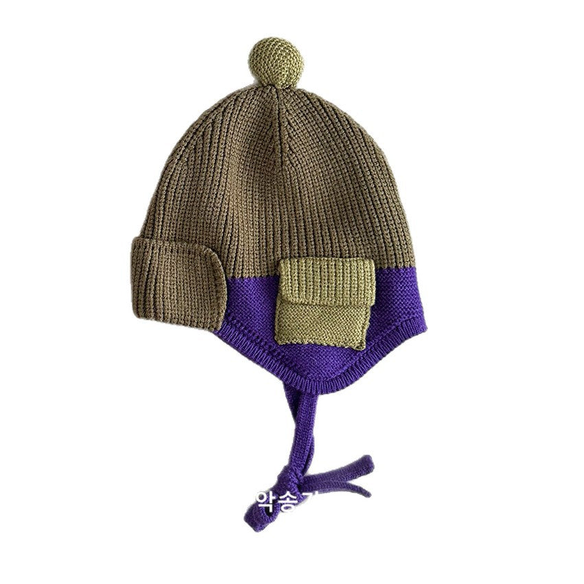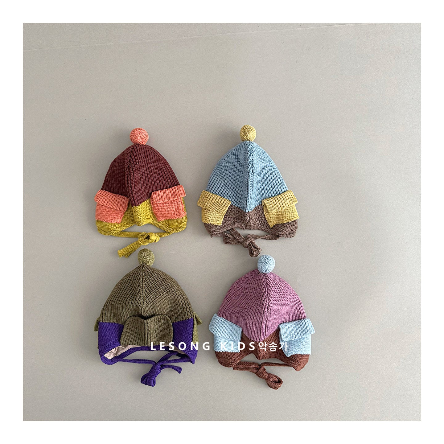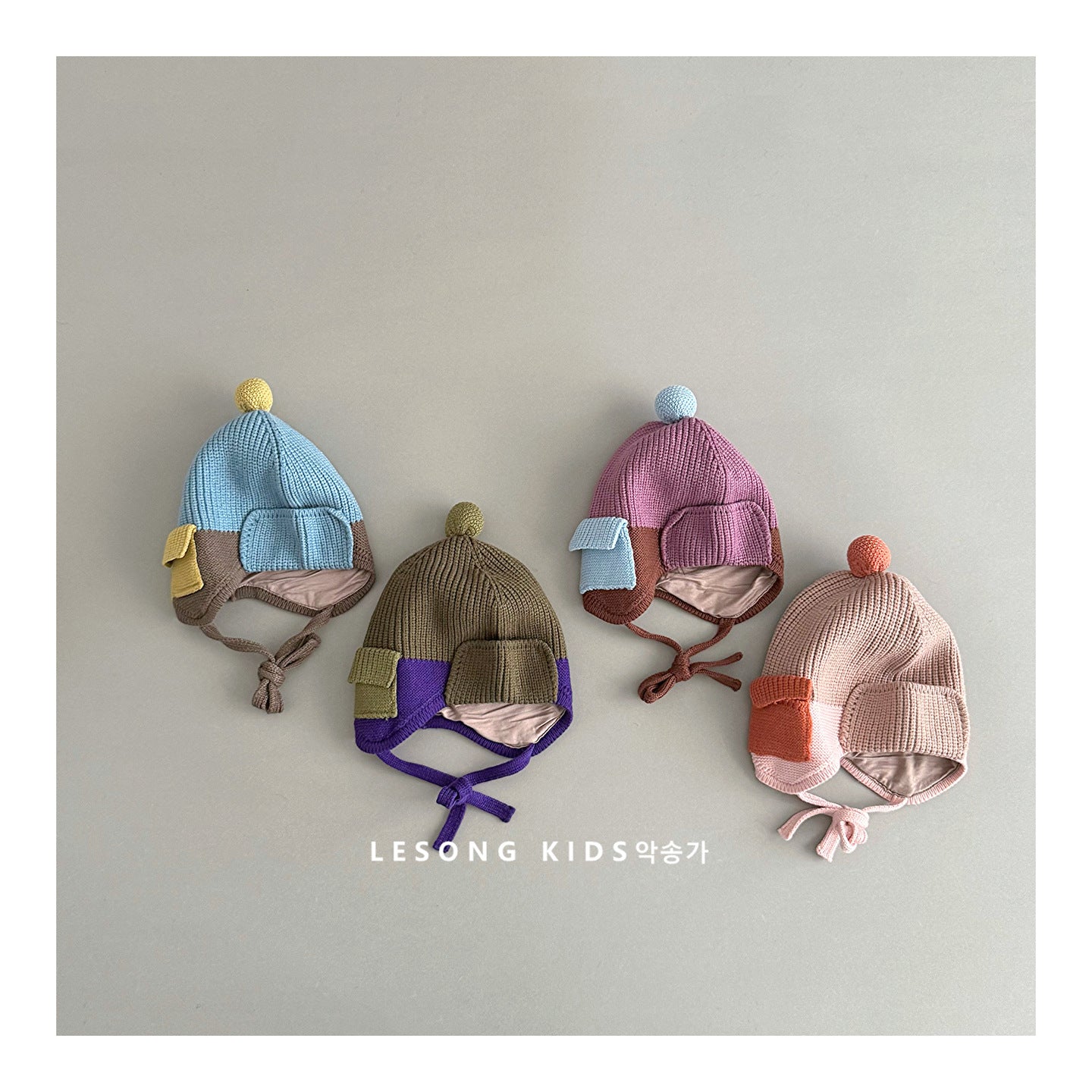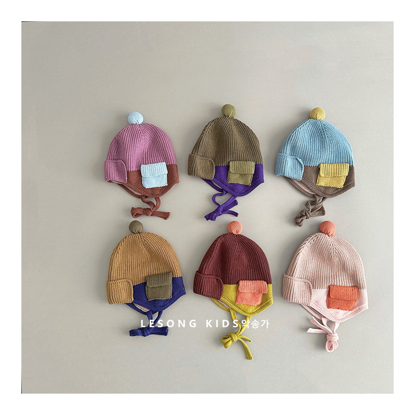 キッズ ニット帽 パッチワーク カラーブロック ポケット付き 耳当て 防寒【mh0011602】
