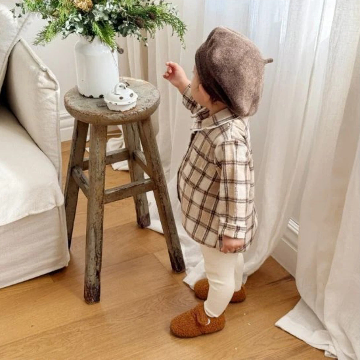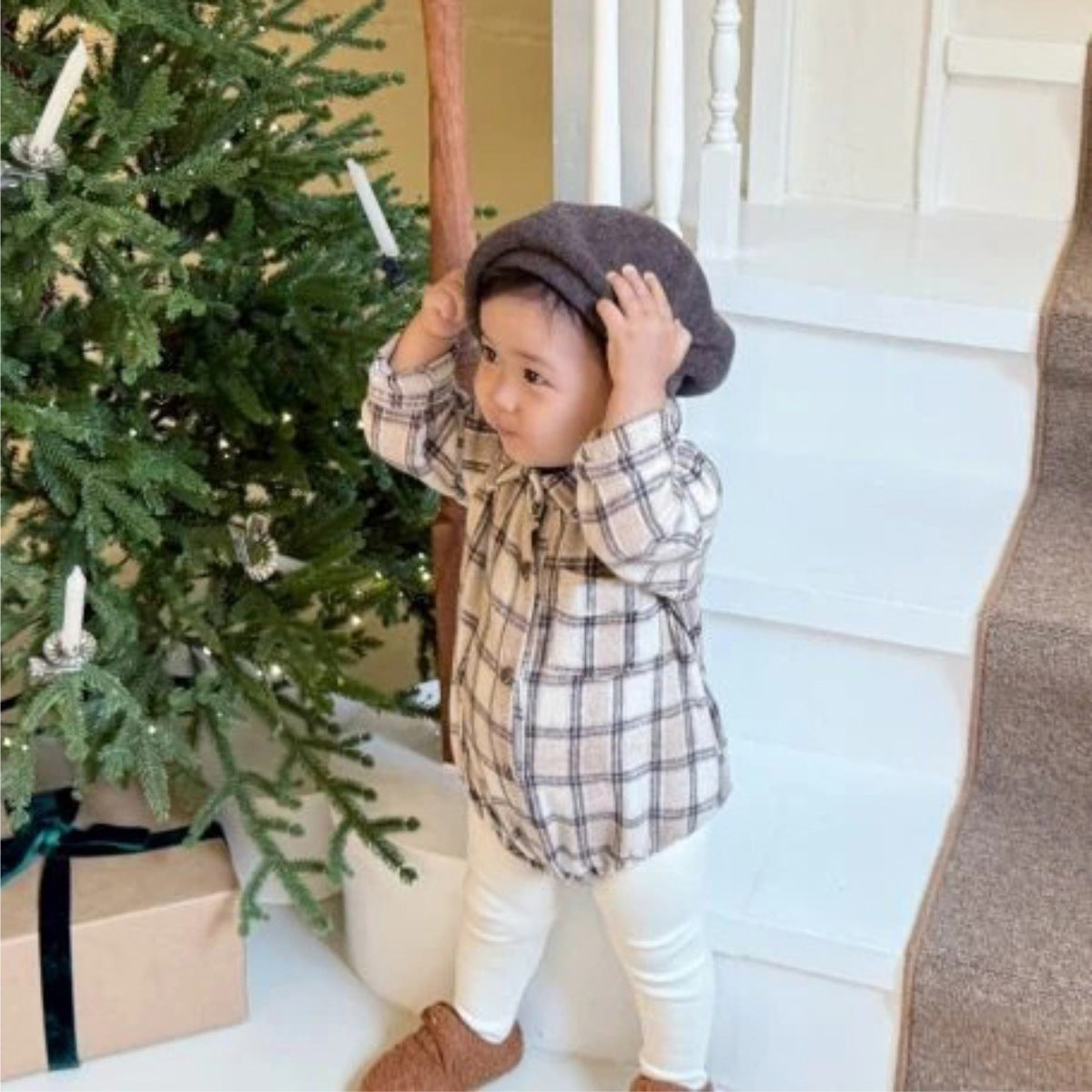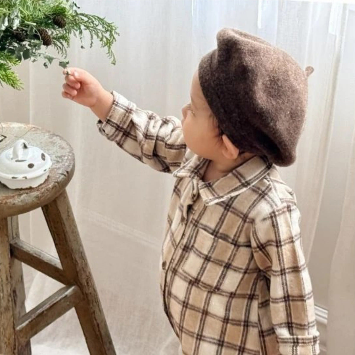 クラシカルなチェック柄が洗練されたムードを醸し出す、シャツ襟デザインの長袖ロンパース。一枚でコーディネートが完成する手軽さと、上品なルックスを両立させたベビー服です。柔らかな肌触りで快適な着心地を提供し、股下はスナップボタンで着脱やおむつ替えをサポートするボディスーツは、ベビーのデイリーウェアとして活躍するトライアングルクロールスーツです。