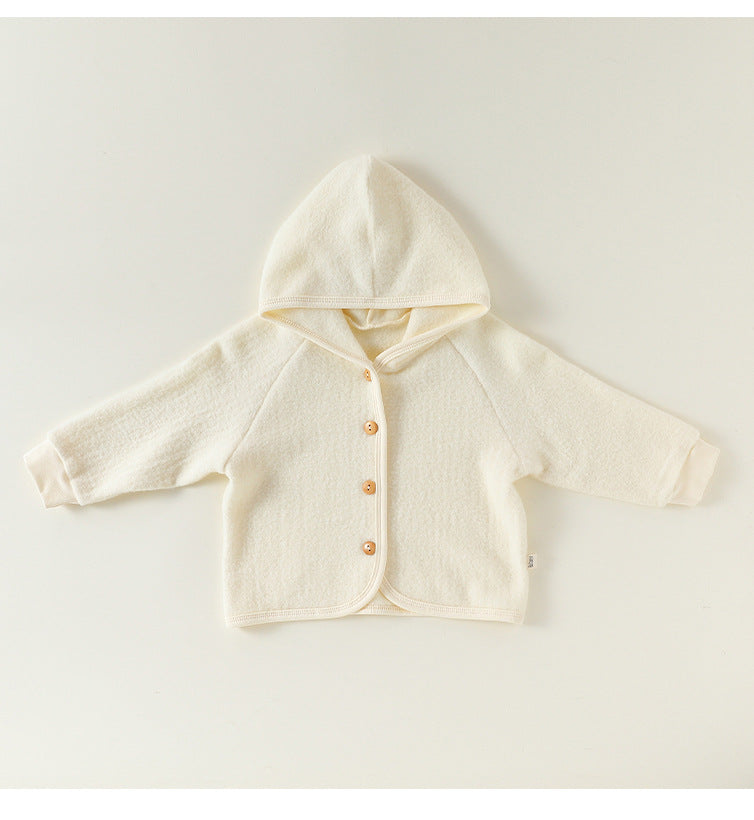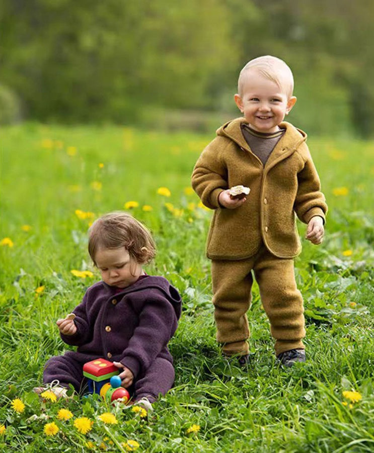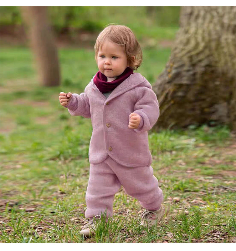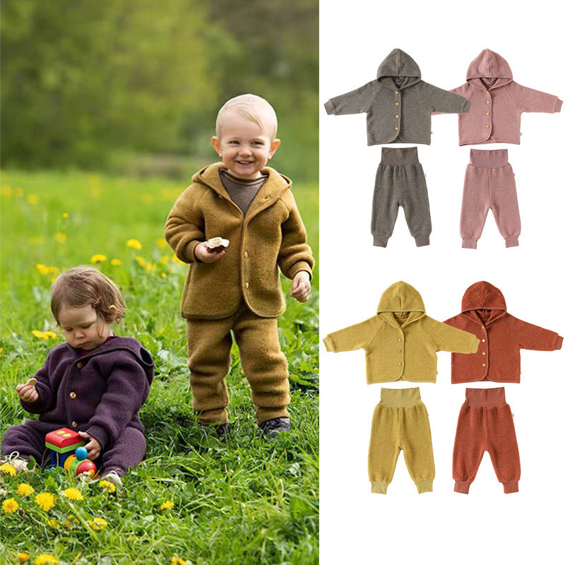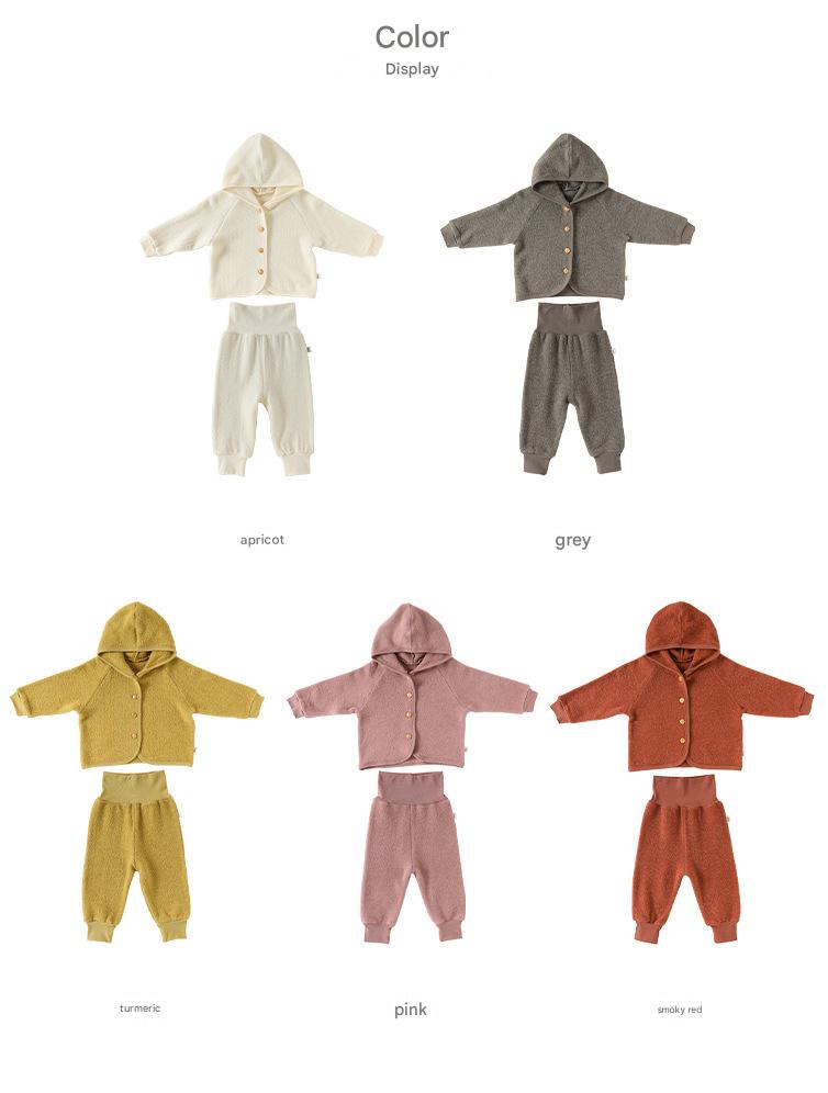 厚手で肌触りの良いスウェット素材を使用した、フード付きのキッズ用ジャケットとパンツのセットアップです。カジュアルながらも洗練されたデザインは、日常の様々なシーンで活躍する子ども服です。保温性に優れたカーディガンと動きやすいトラウザーは、それぞれ単品でも着回しやすく、ベビーのデイリーユースに快適さとスタイルをプラスします。