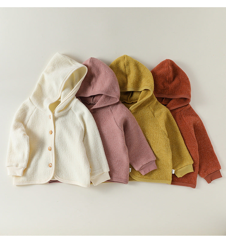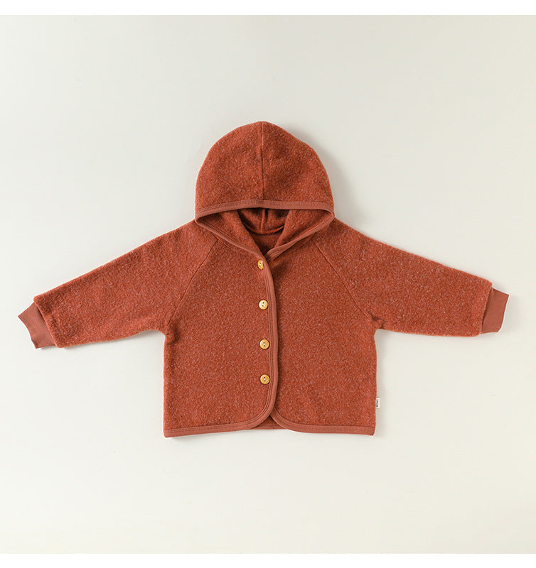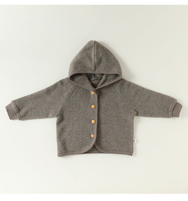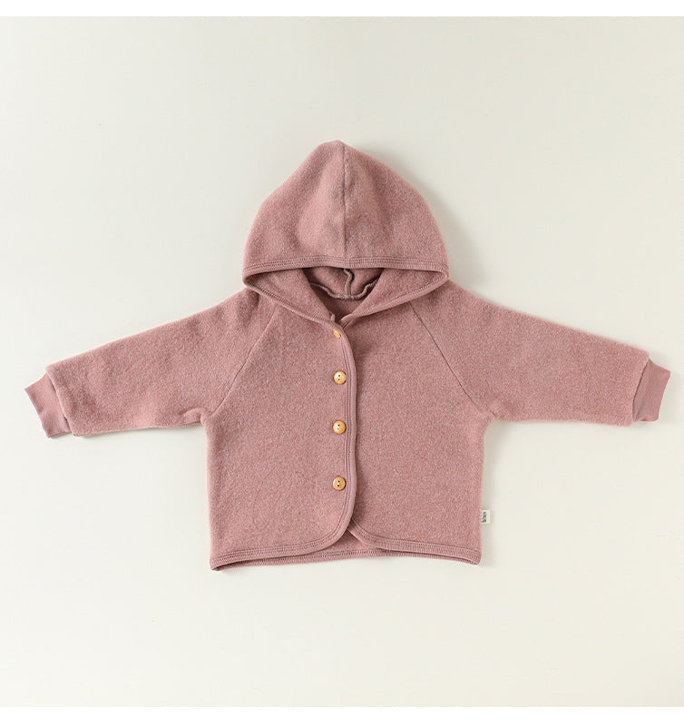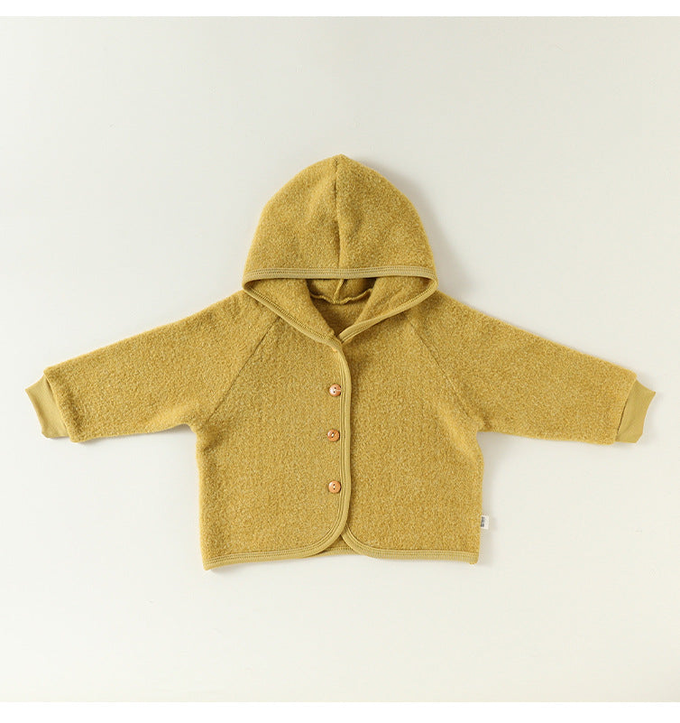 厚手で肌触りの良いスウェット素材を使用した、フード付きのキッズ用ジャケットとパンツのセットアップです。カジュアルながらも洗練されたデザインは、日常の様々なシーンで活躍する子ども服です。保温性に優れたカーディガンと動きやすいトラウザーは、それぞれ単品でも着回しやすく、ベビーのデイリーユースに快適さとスタイルをプラスします。