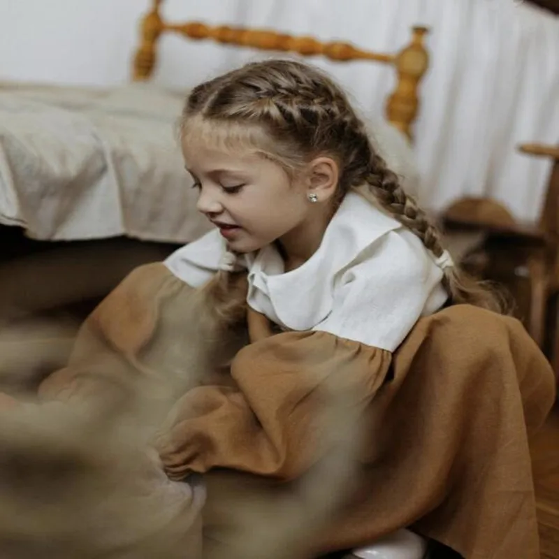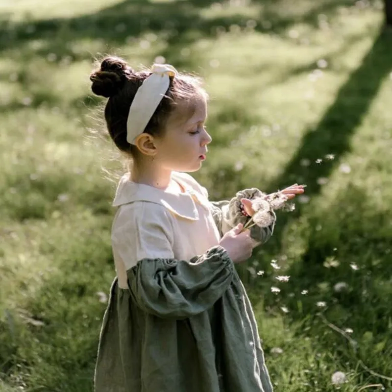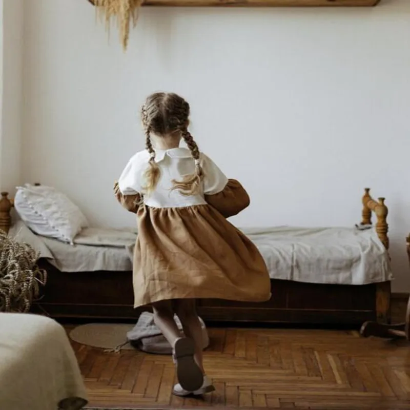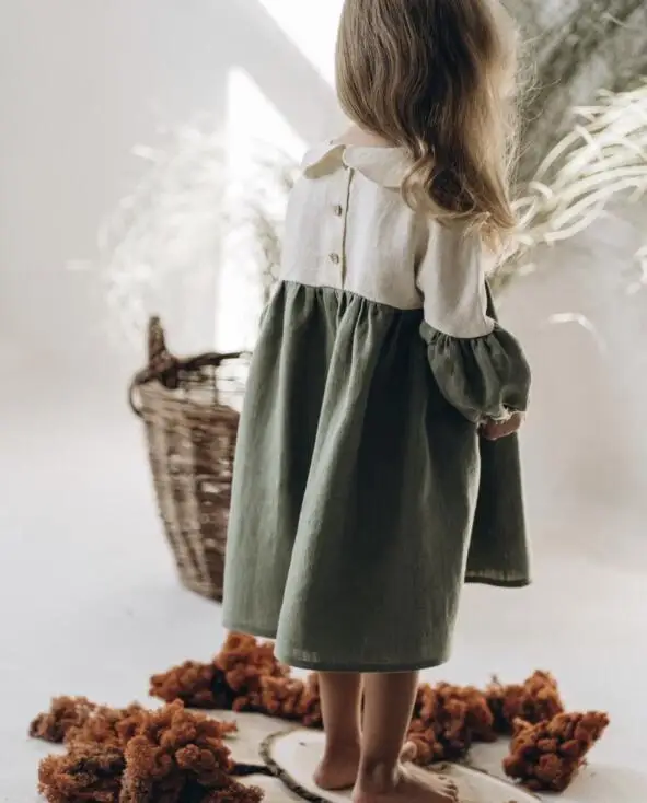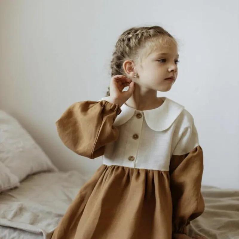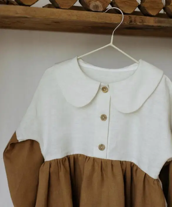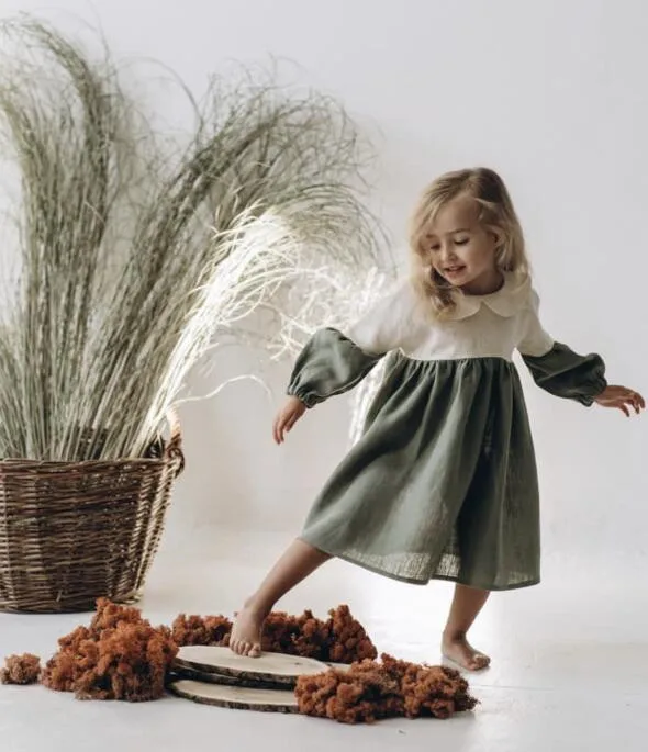 キッズワンピース 長袖切り替えワンピース 丸襟 ブラウン/グリーン/2カラー