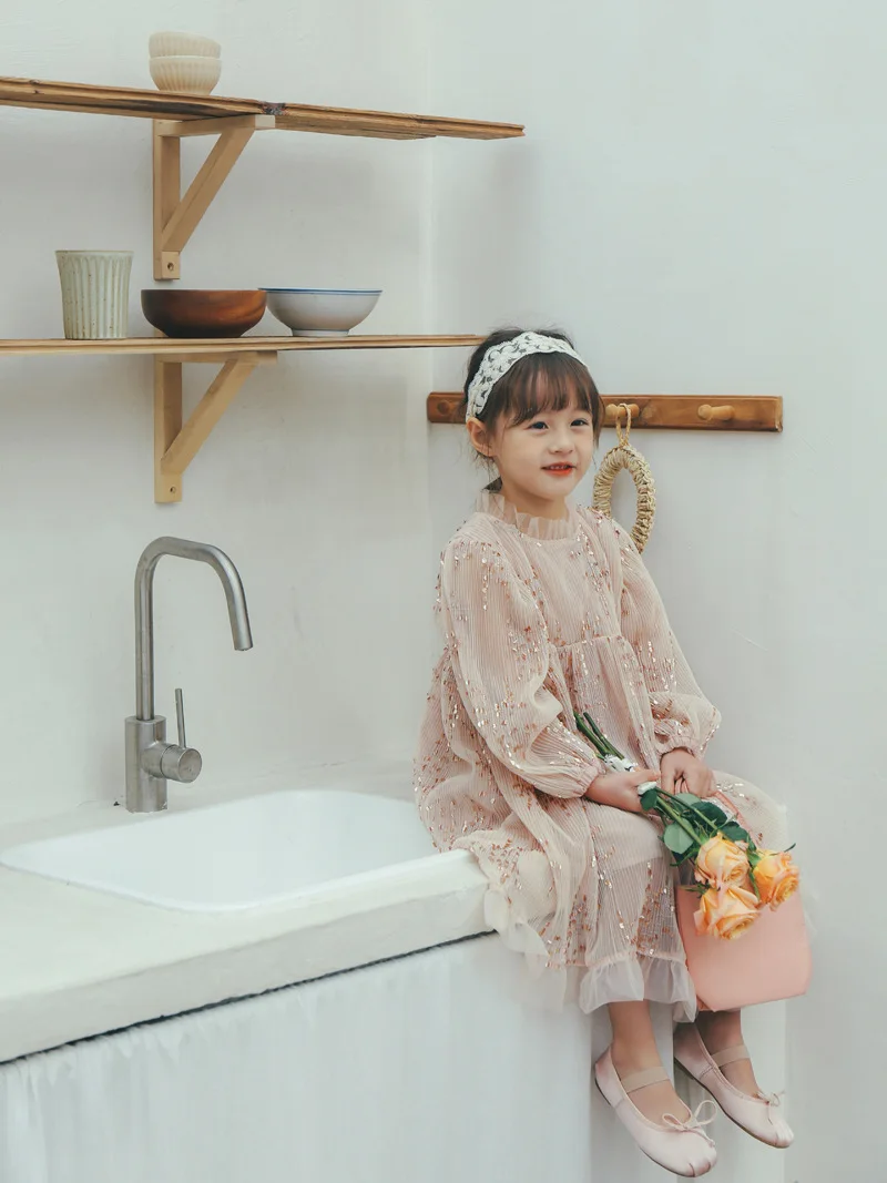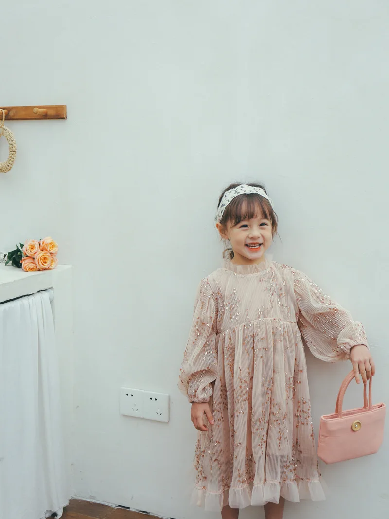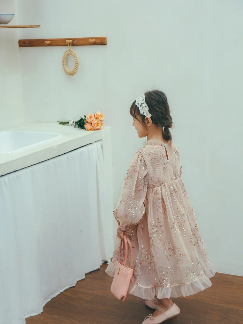 贅沢なスパンコールと華やかなシフォンが絶妙なハーモニーを奏でる、キッズ向けのドレスが登場しました。長袖パフスリーブが可愛らしいアクセントを添え、パーティーや特別な日にぴったりの一着です。上品で優雅なピンクの色合いは、お子様を一層輝かせます。