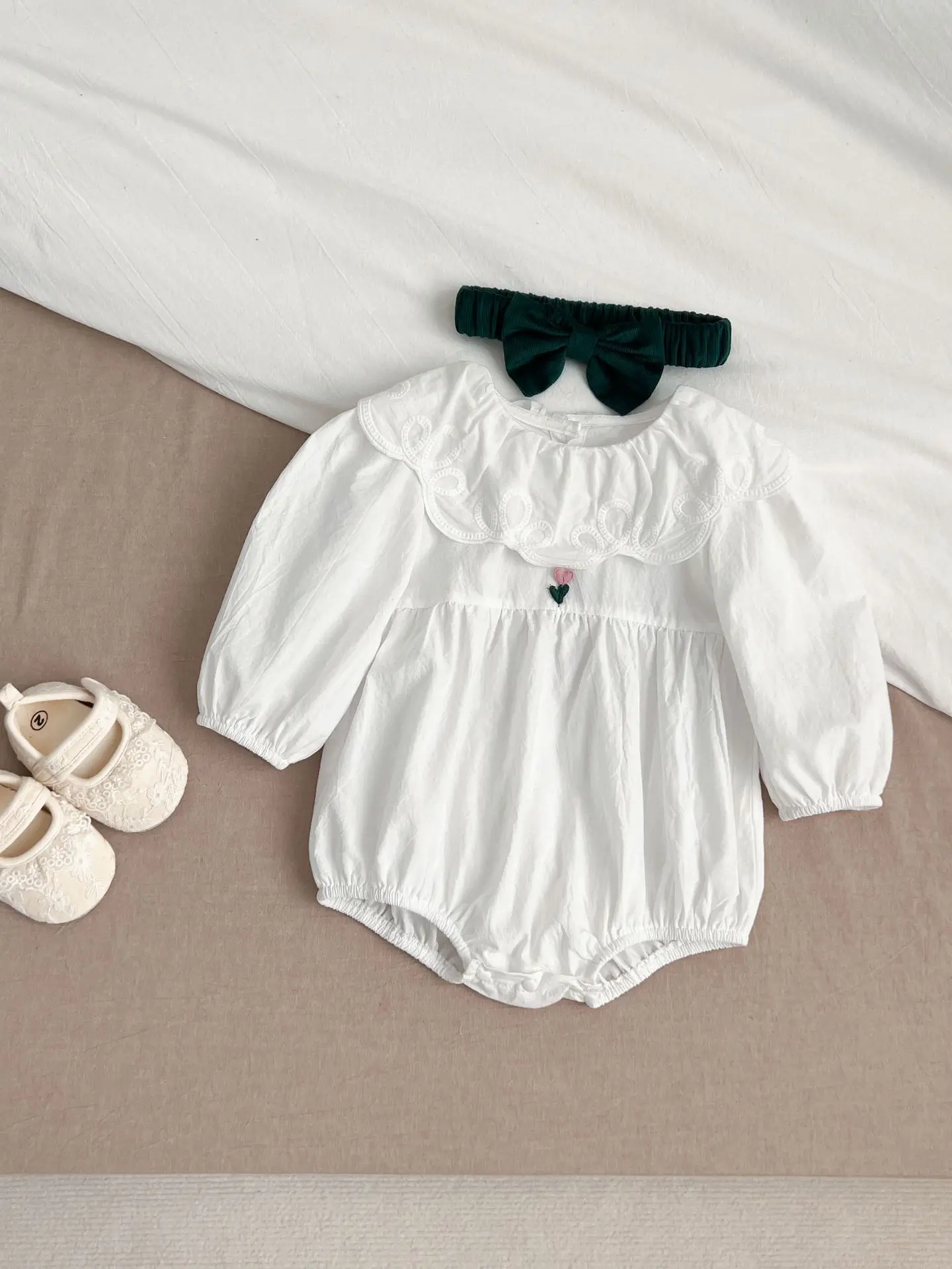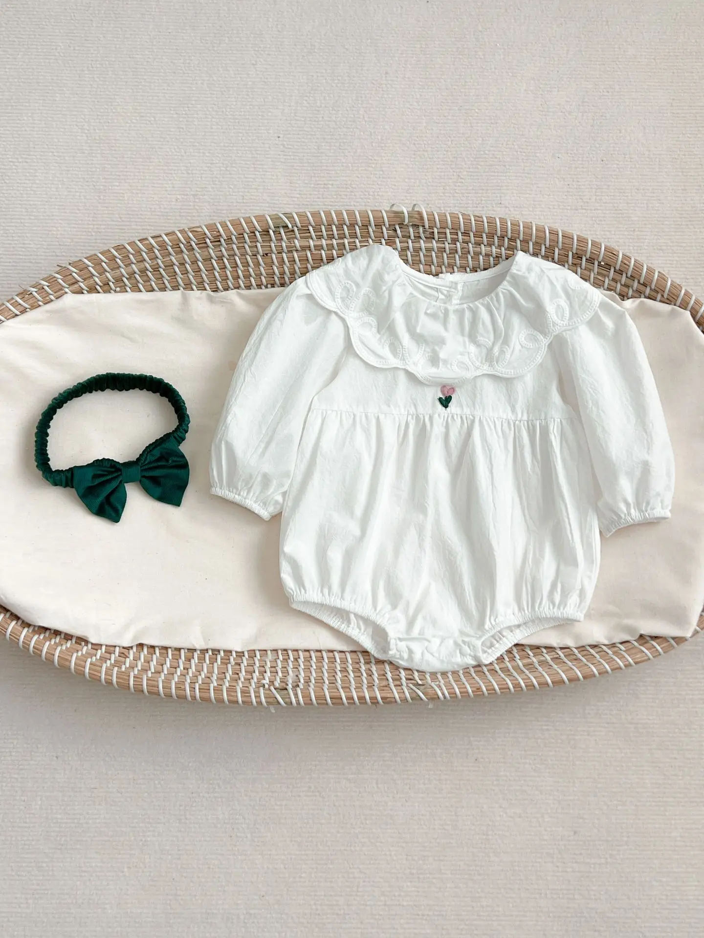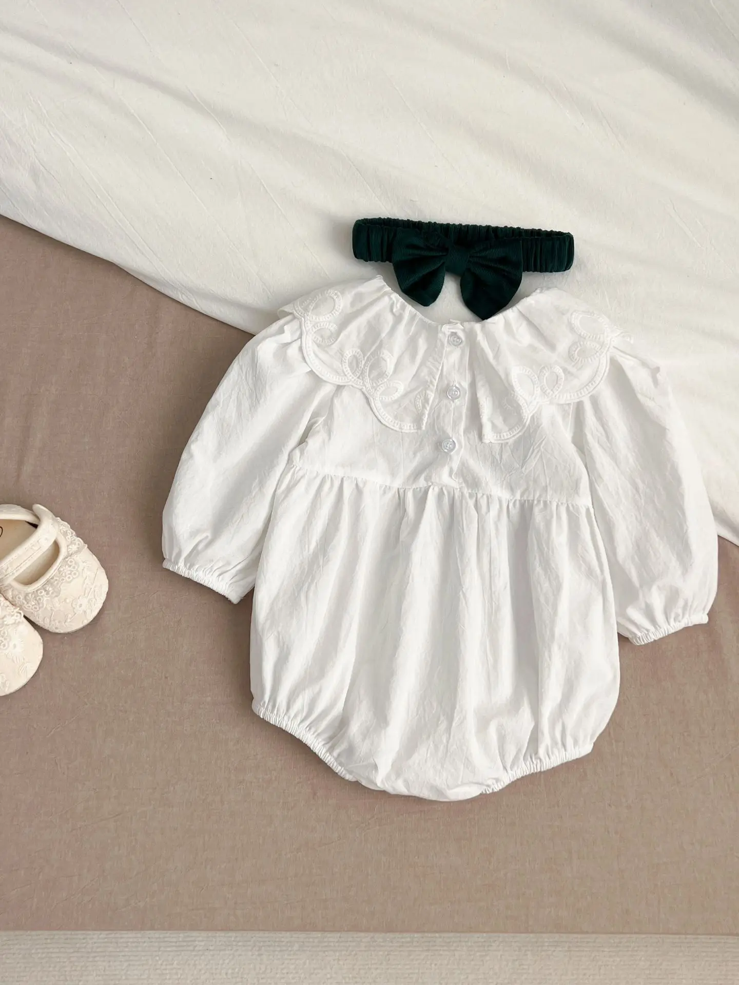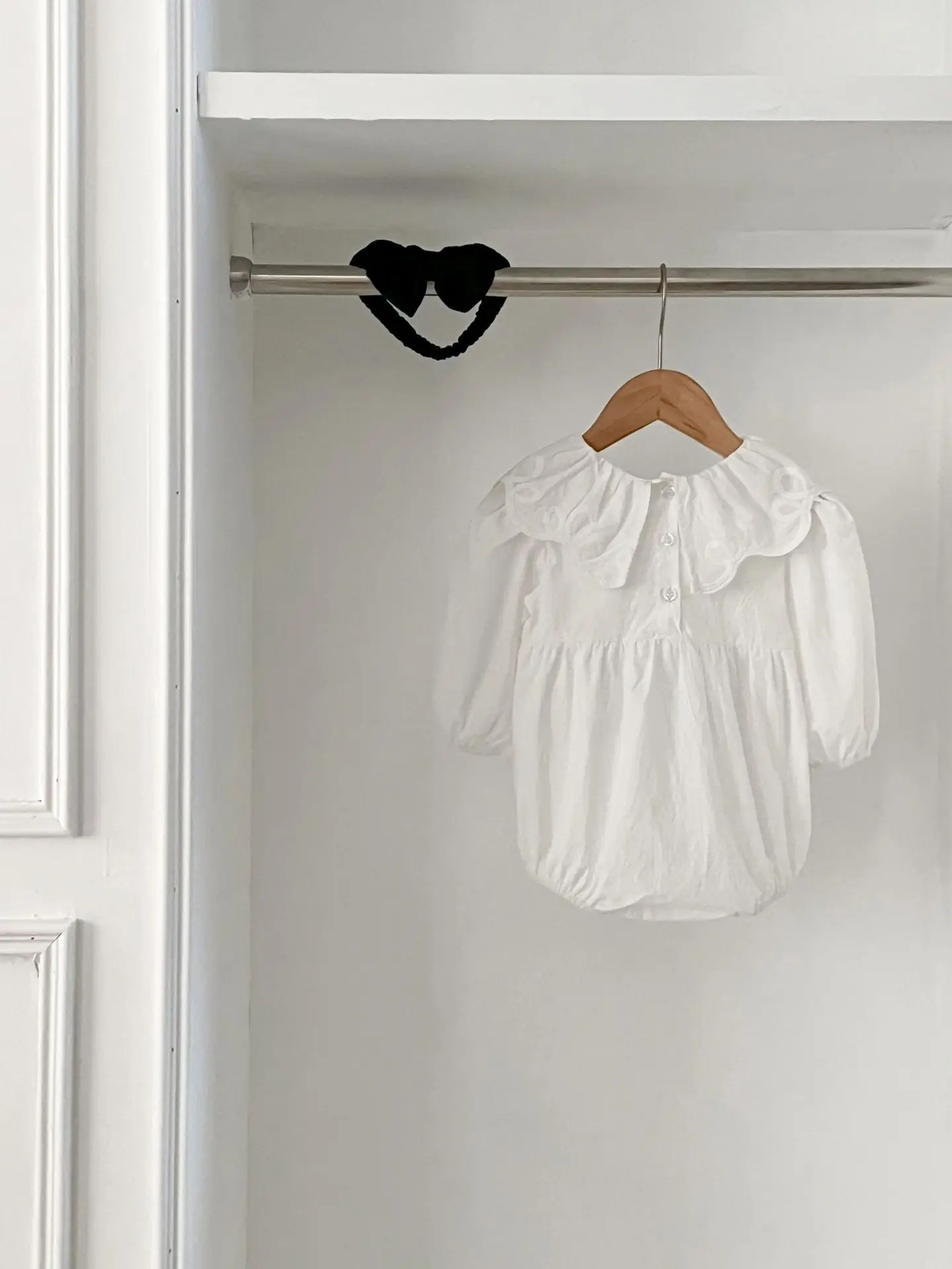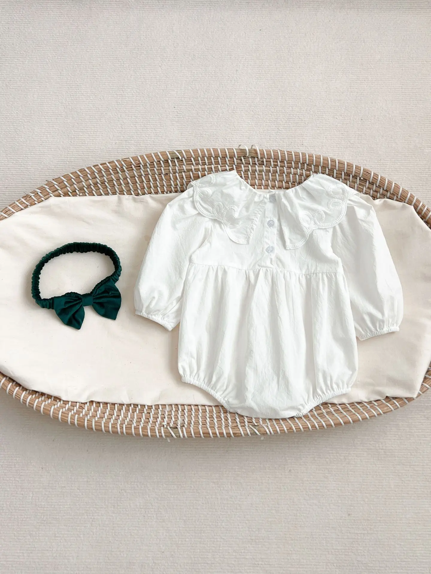 ベビーロンパース ヘアバンドセット 長袖サークル襟ボディスーツ+リボンヘアバンド ホワイト【mh0004697】