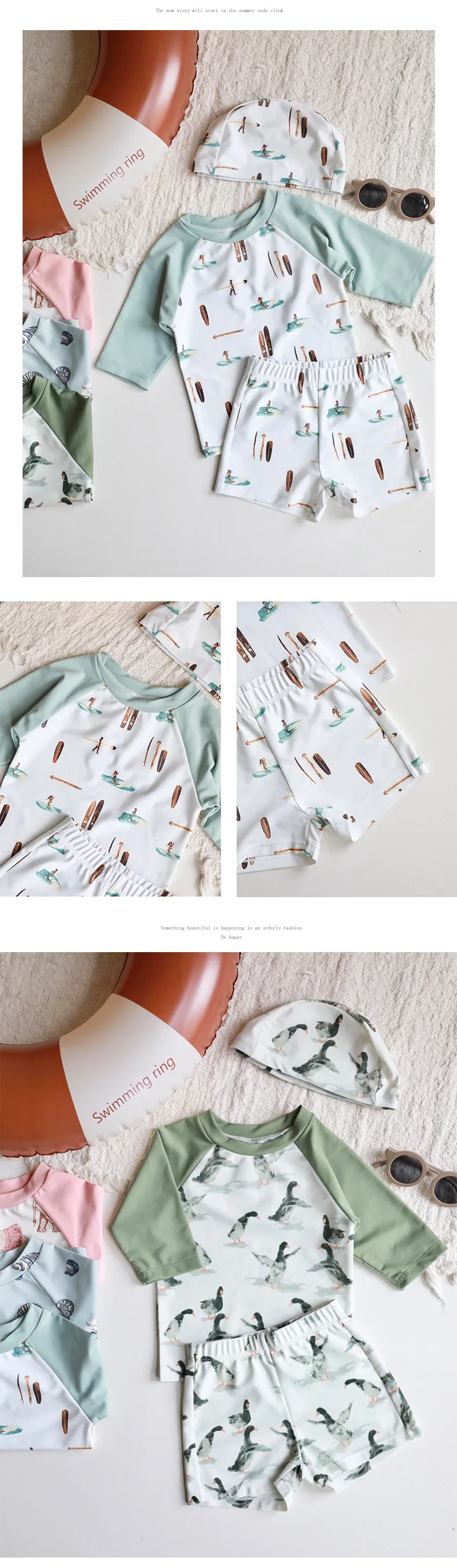 今年の夏、お子さまにぴったりの水着が登場しました。セパレートデザインの水着は、長袖のラッシュガードとマッチングの帽子がセットになっています。アニマルプリントがキュートなデザインで、ビーチやプールでの楽しい時間をより特別なものにします。高品質な素材で作られており、紫外線からお子さまの肌を守ります。さあ、この水着で夏の冒険を楽しもう!