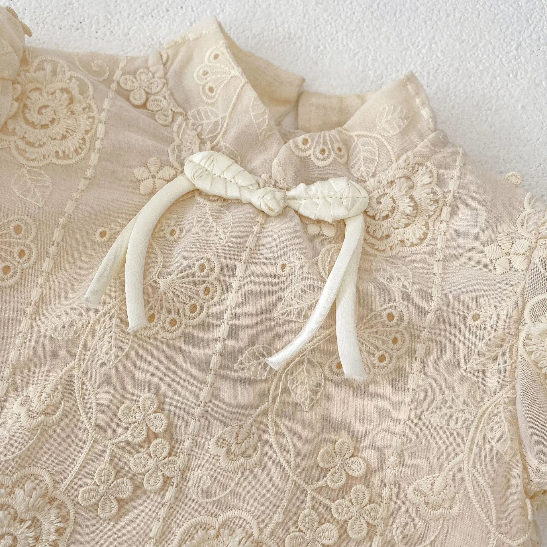 ベビーロンパース 半袖チャイナドレスボディスーツ フリルレース アプリコット【mh0005539】