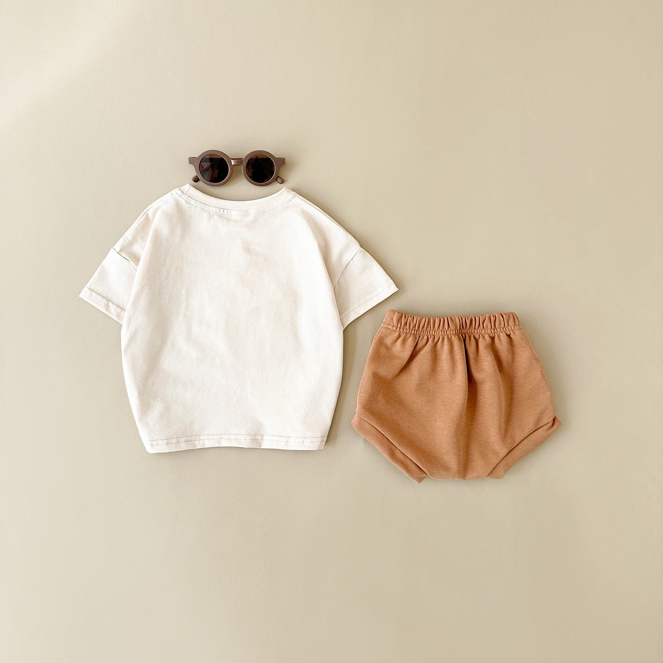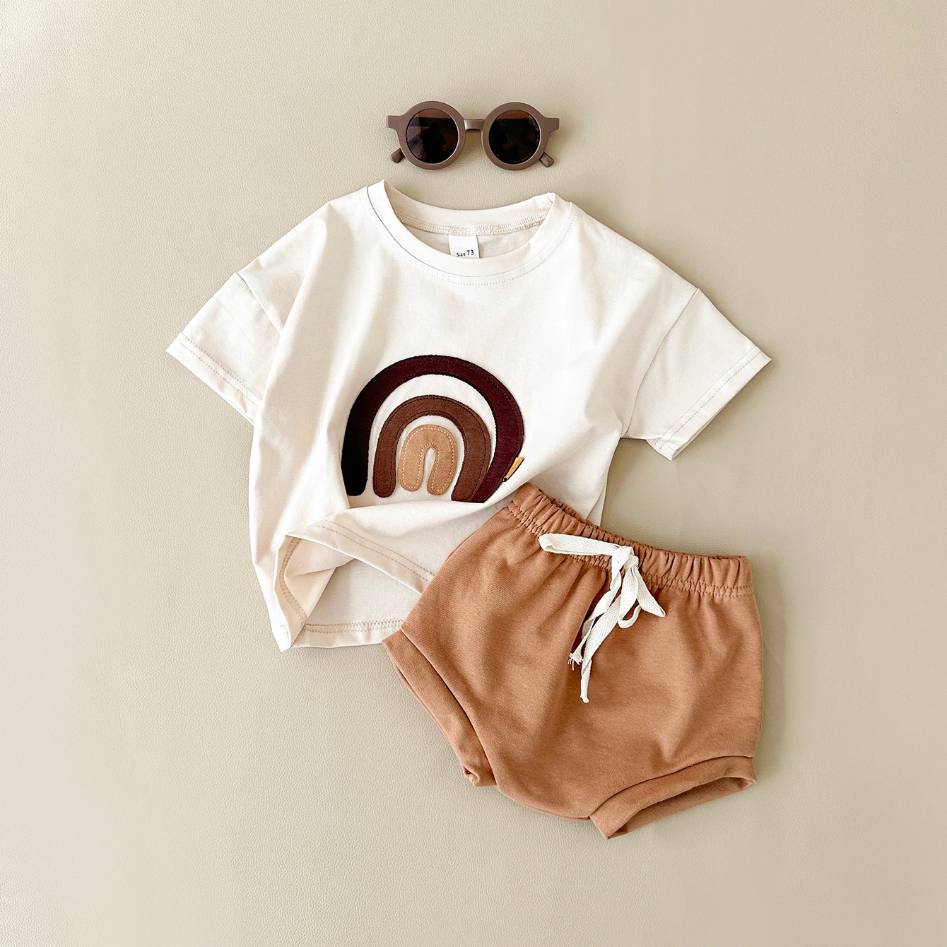この可愛い 2点セットは、夏にぴったり!カラフルな虹の刺繍が入った半袖Tシャツとブルマパンツのセットです。赤ちゃんのお洋服としてはもちろん、バケーションやカジュアルなお出かけにもぴったりです。柔らかくて涼しい素材で快適に過ごせます。