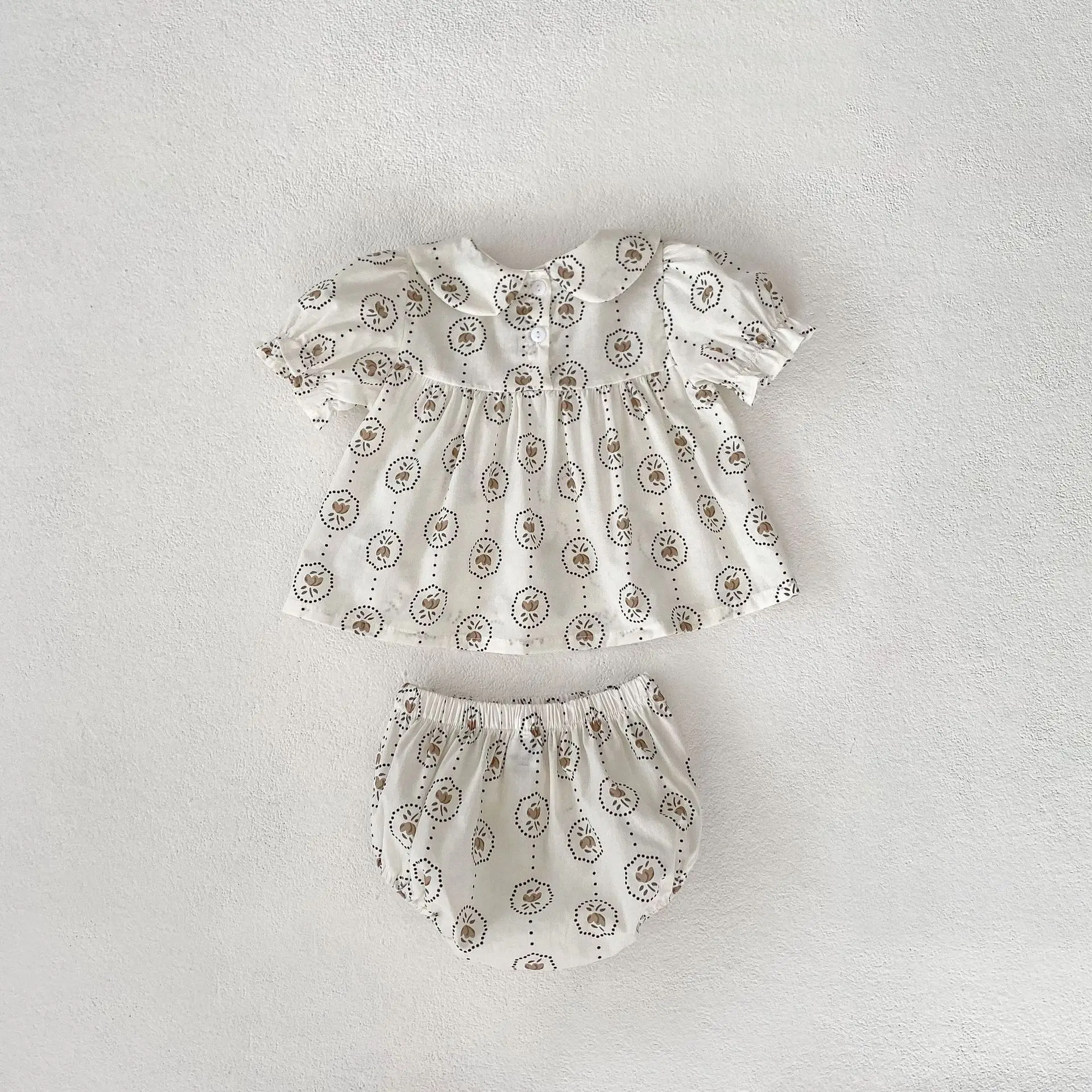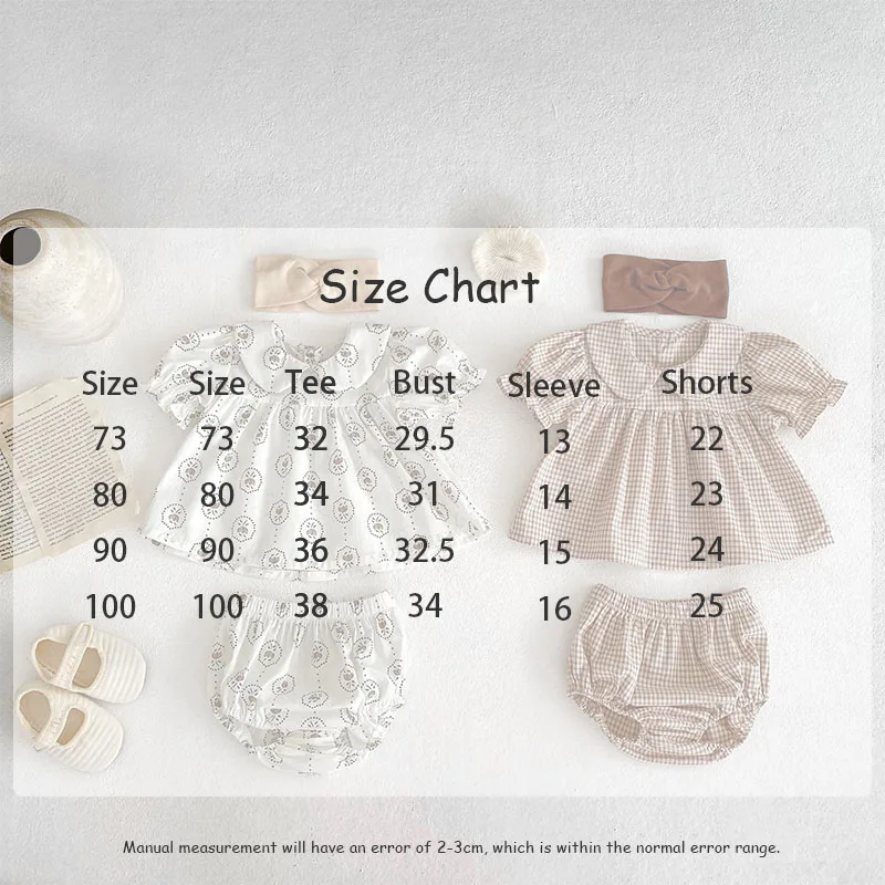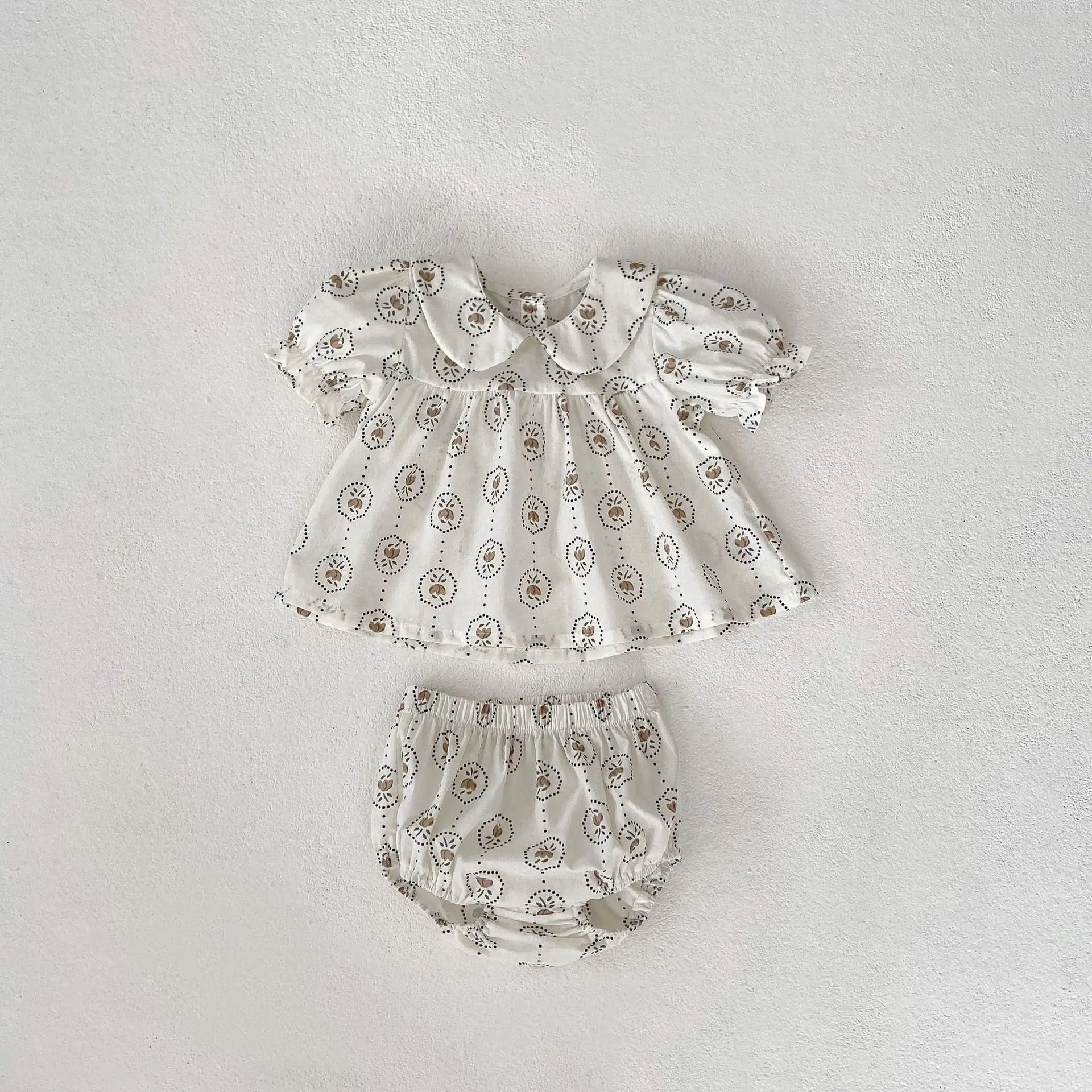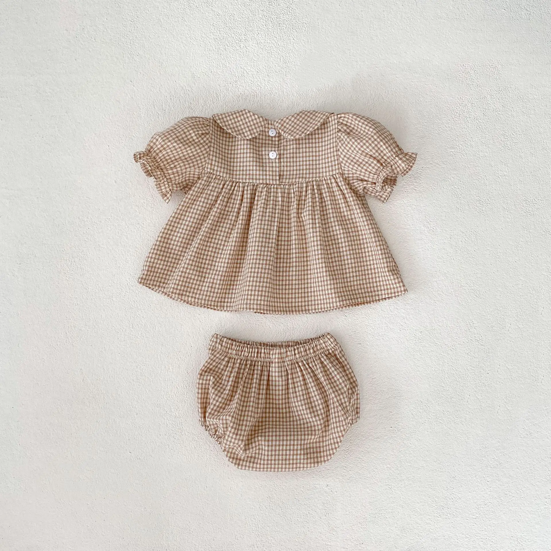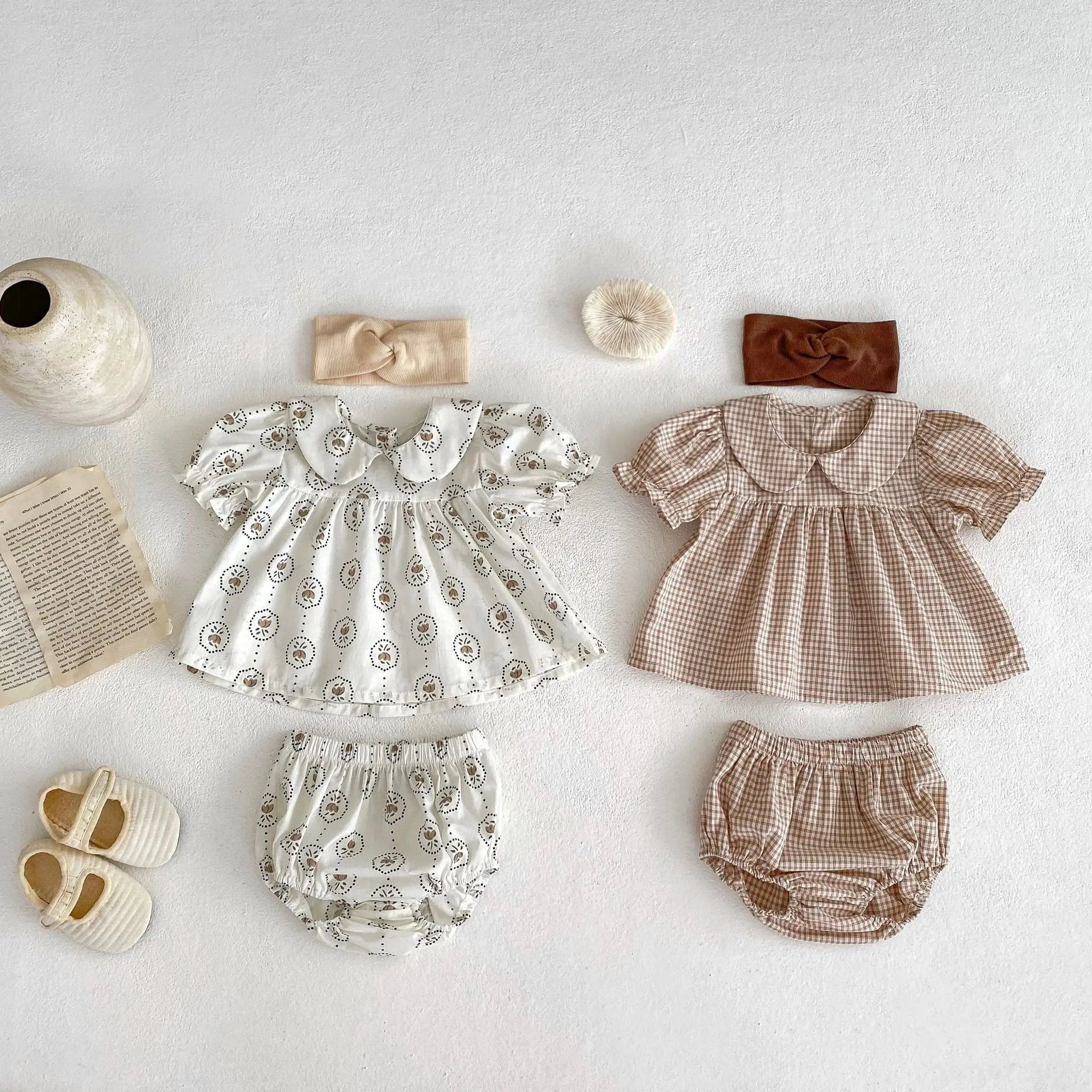 ベビーセットアップ 2点セット 半袖丸襟パプスリーブチュニックブラウス+ブルマパンツ フラワー花柄/チェックプリント【mh0005944】