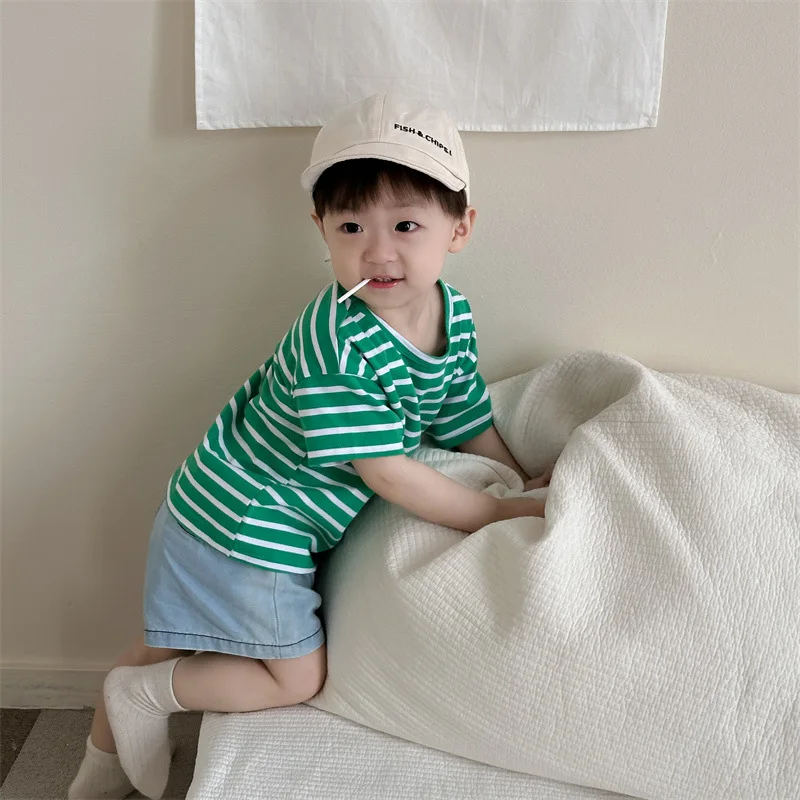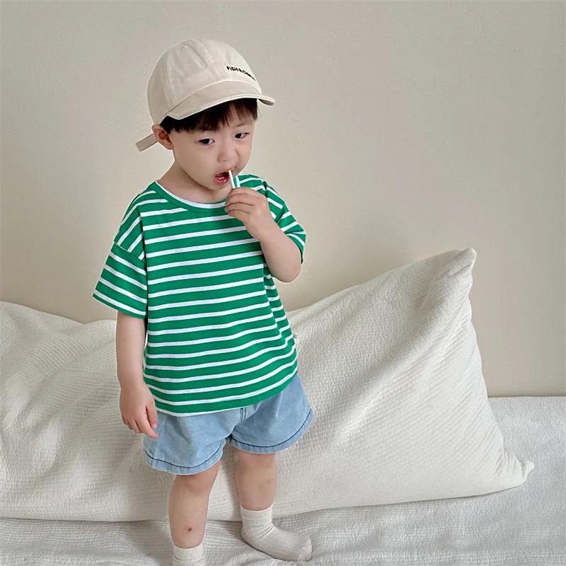 涼しい夏にぴったりな新生児用短袖ボーダーTシャツとデニムショートパンツのセットアップです。柔らかで通気性のあるコットン素材で快適な着心地。オシャレなファッションで赤ちゃんをサポートします。
