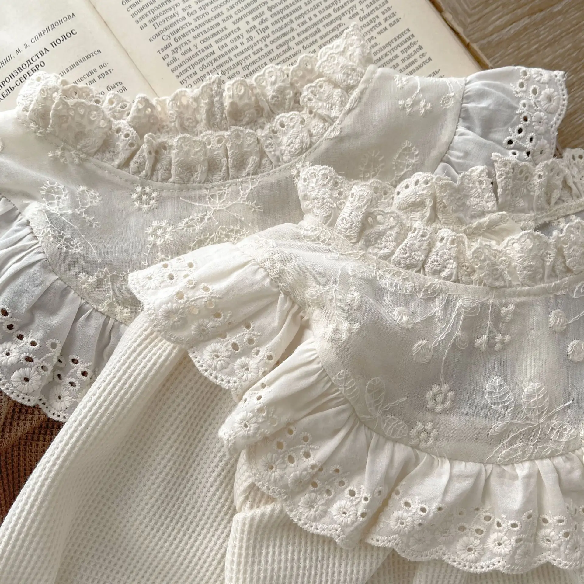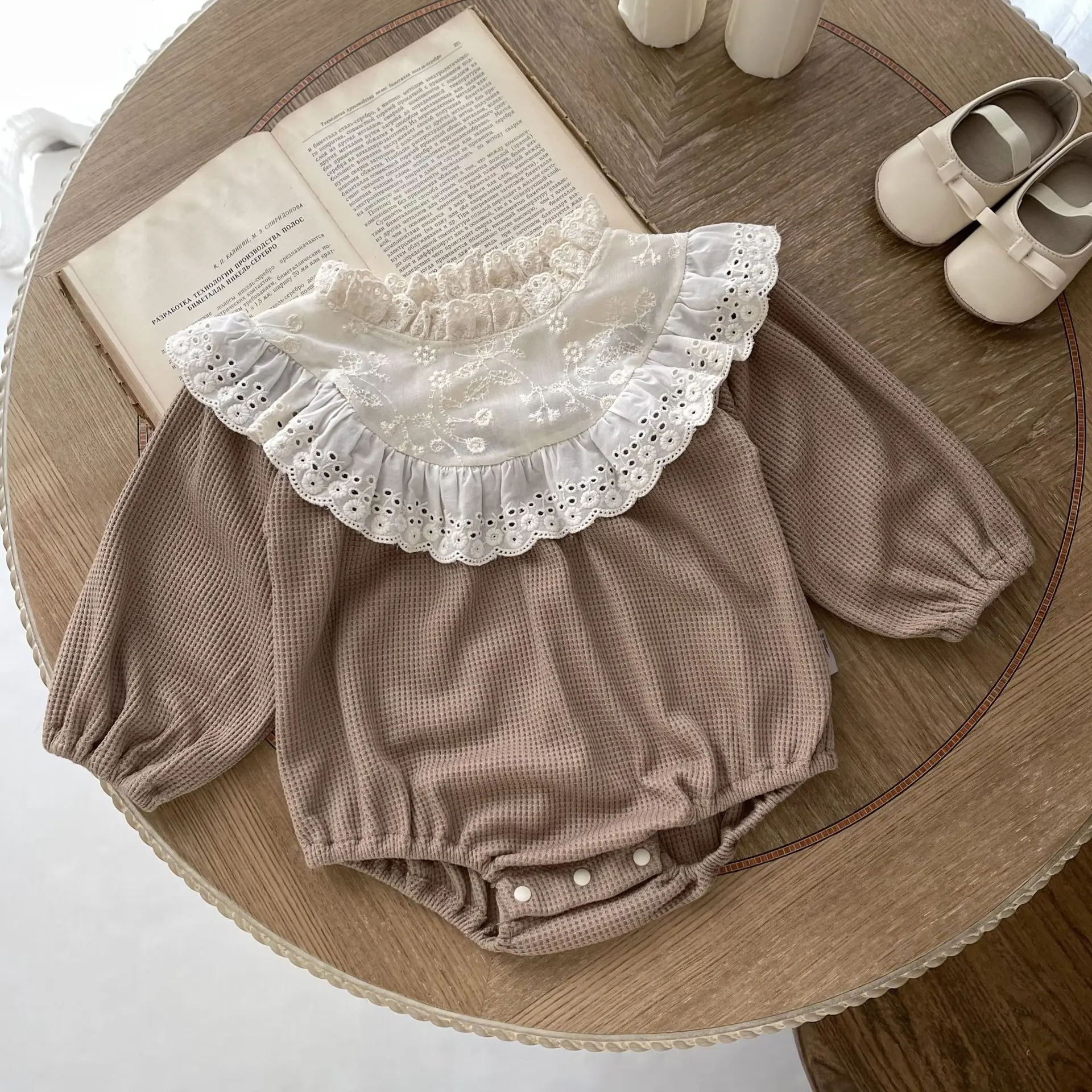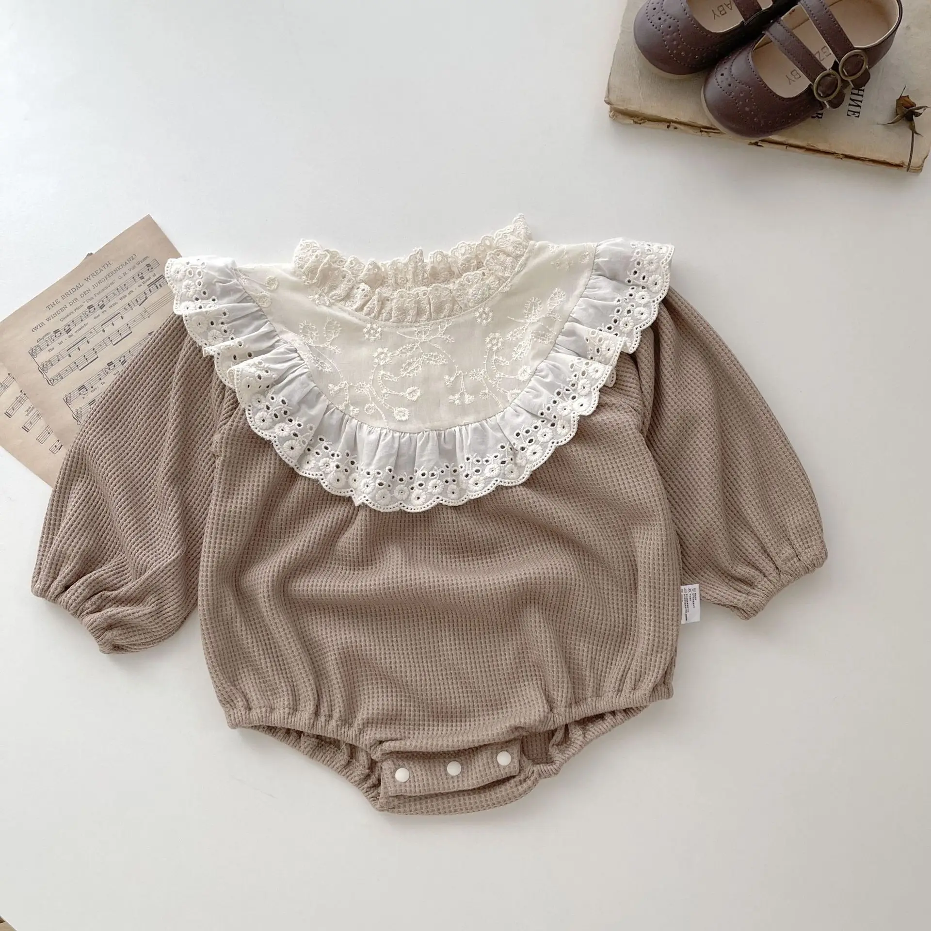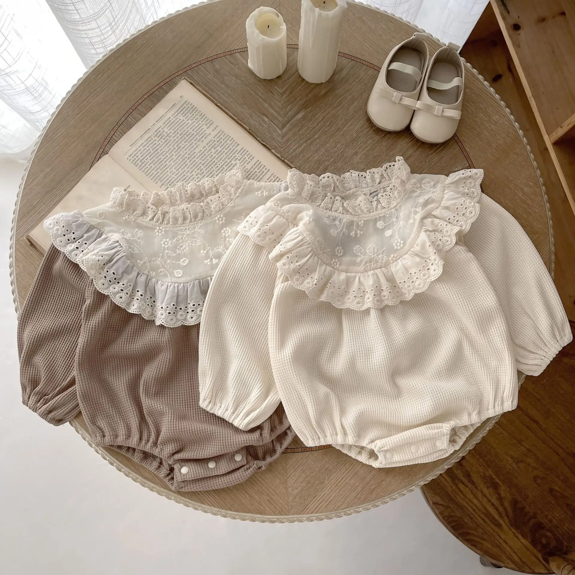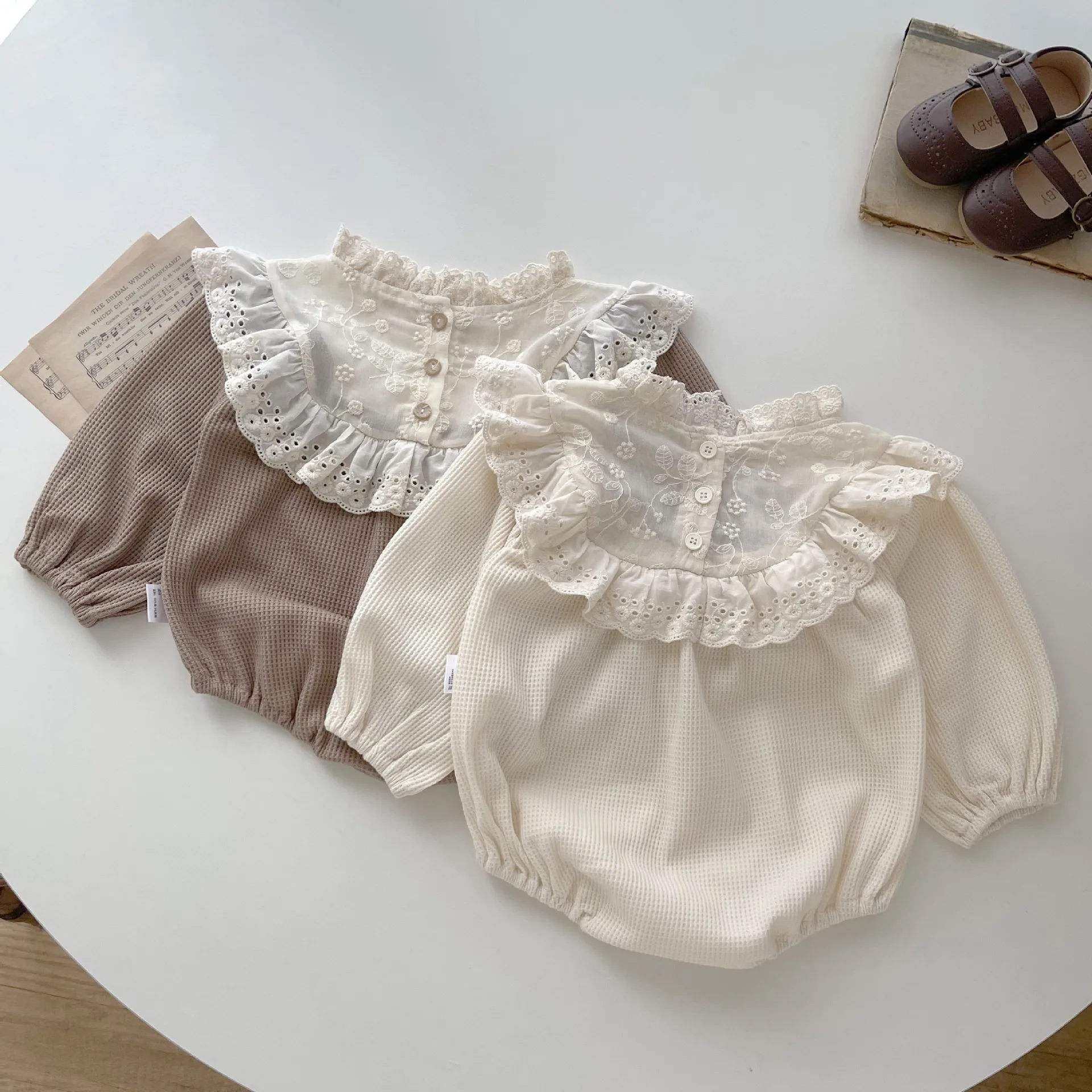 ベビーロンパース ラッフルフリルレース ワッフル 長袖ボディスーツ 2カラー【mh0006561】