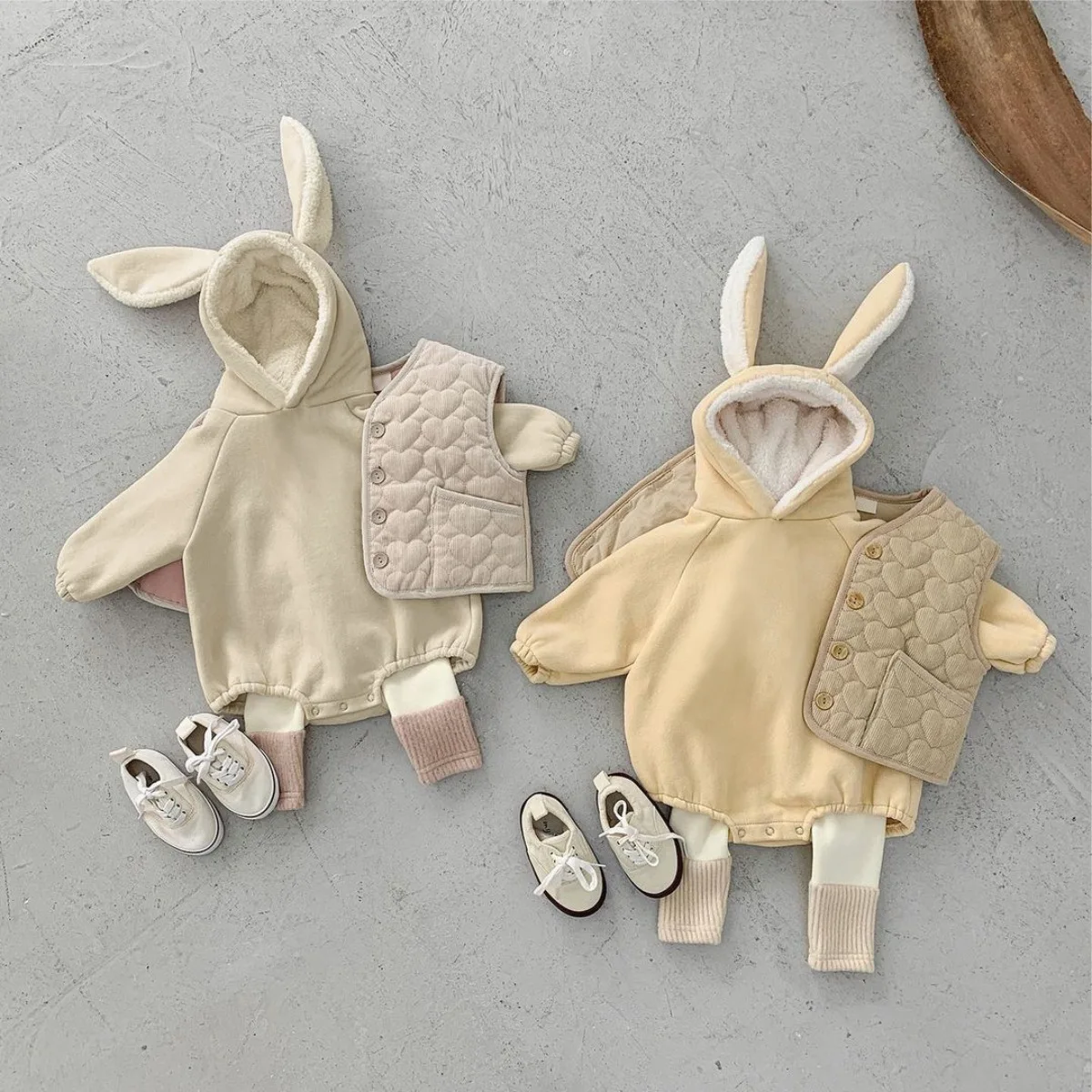 #ベビーロンパース #うさ耳 #フーディ #暖かい服 #赤ちゃん服 #冬のコーディネート #可愛いデザイン