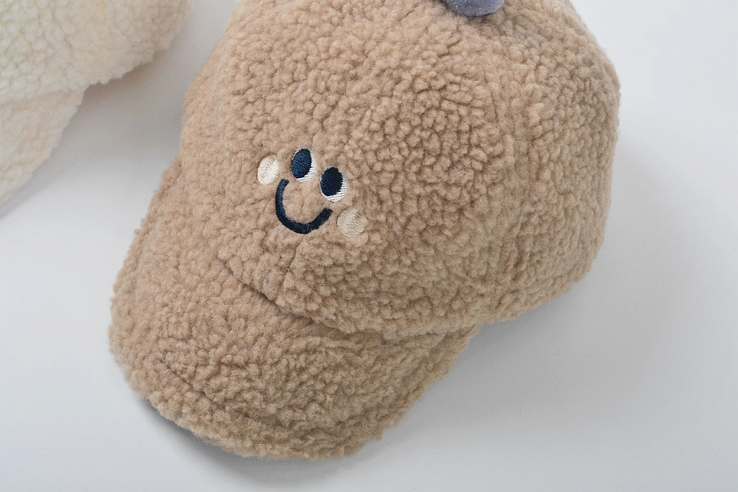 #ベビーファッション #スマイル刺繍帽子 #ボアフリースキャップ #野球帽デザイン #冬用アクセサリー #子供服 #カジュアルスタイル