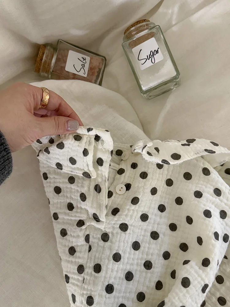 水玉ドット柄とストライプ柄が選べる、長袖チュニックブラウスです。フリル付きの襟が愛らしいアクセントとなり、上品で洗練された印象を与えます。柔らかな素材を使用しており、動きやすさと快適な着心地を兼ね備えています。ゆったりとしたシルエットが特徴で、パンツやスカートと合わせやすいデザインです。カジュアルな日常使いからちょっとしたお出かけまで、幅広いシーンで活躍します。シンプルながらもスタイリッシュなアイテムで、季節を問わずコーディネートを楽しめます。