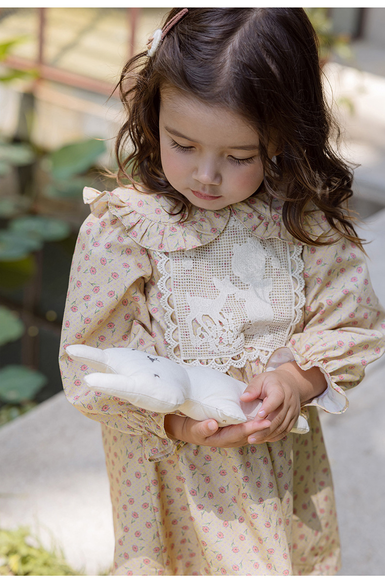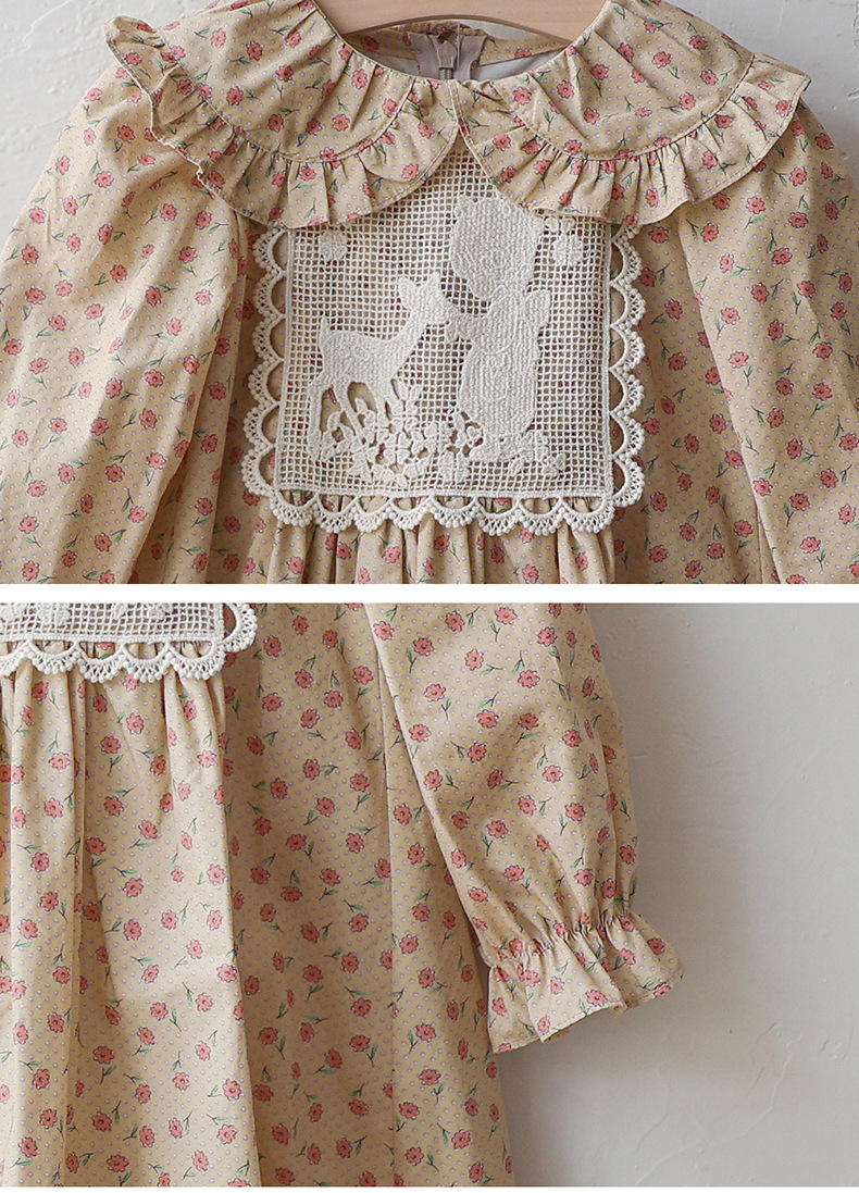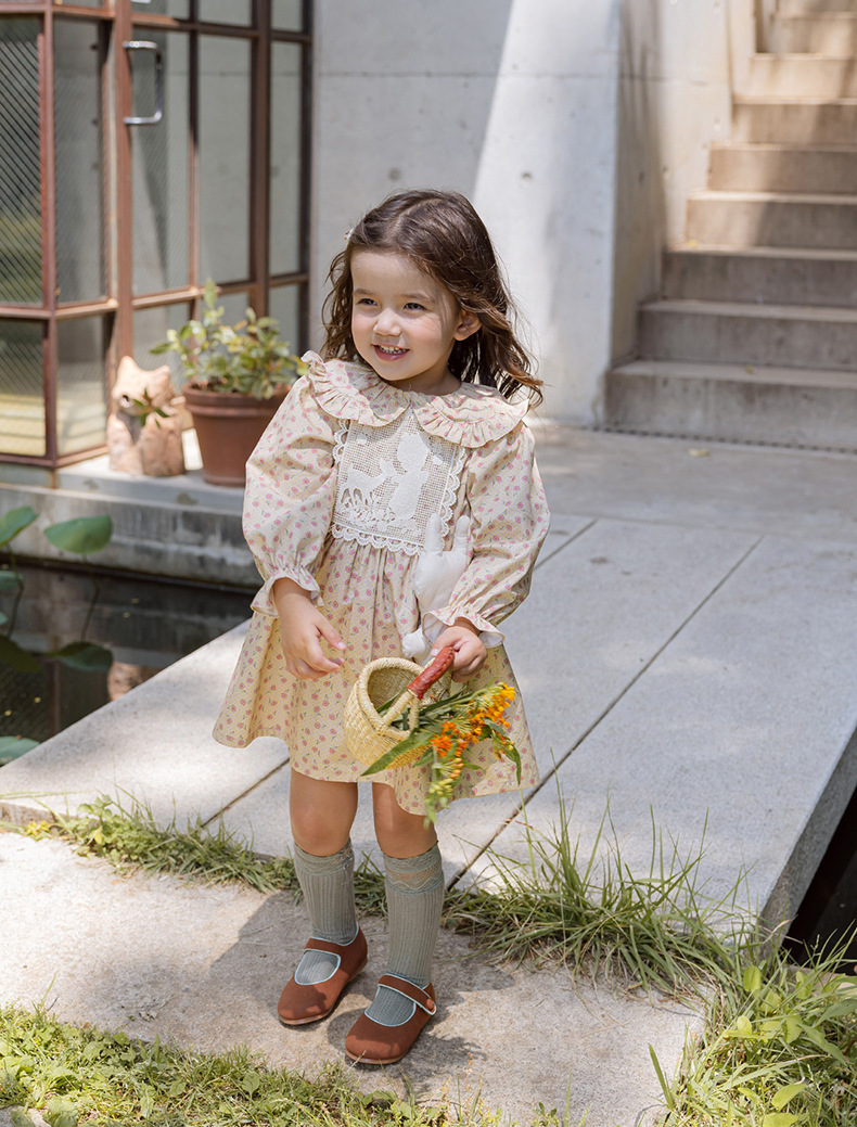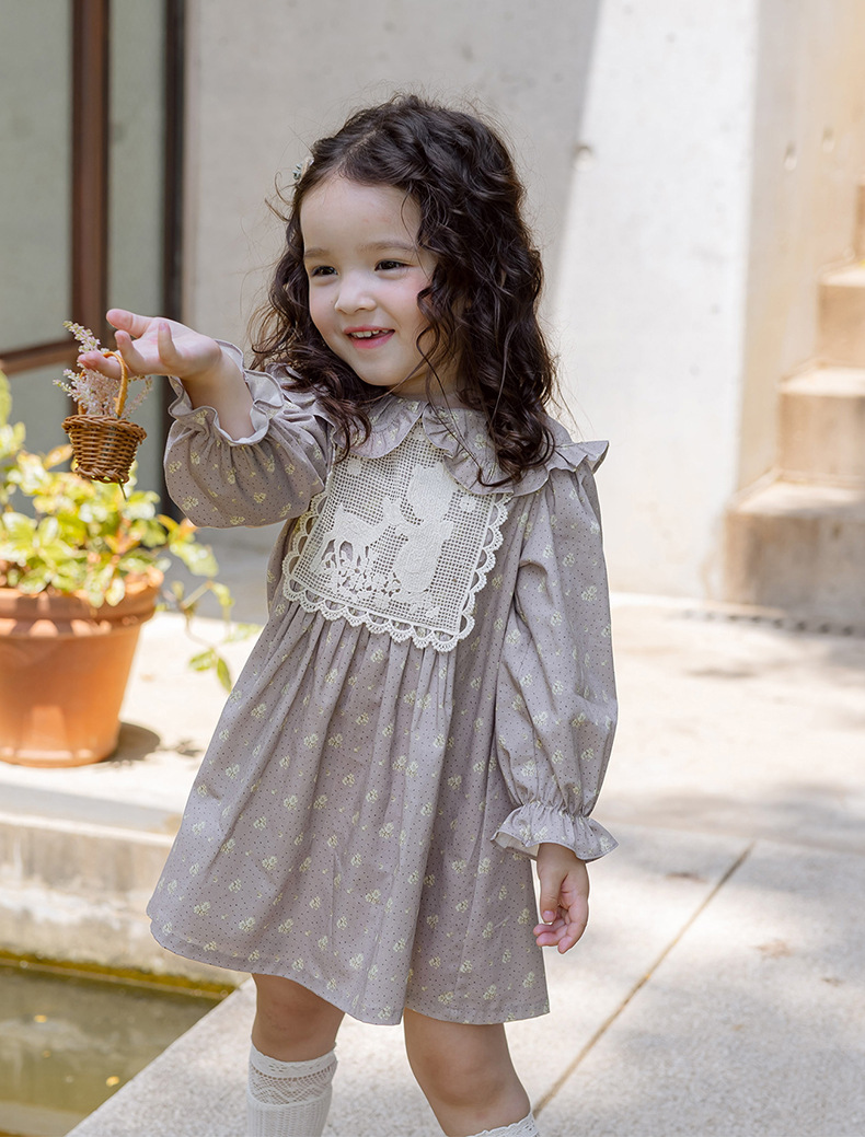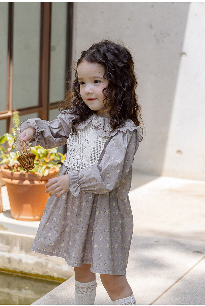 クロシェ編みのビブフリルがアクセントになった長袖ワンピース。クラシカルなデザインが上品な雰囲気を演出し、ナチュラルな優しい風合いが魅力です。身頃は柔らかな素材で着心地が良く、ゆったりとしたシルエットが動きやすさも兼ね備えています。一枚で華やかに決まるデザインなので、お出かけや特別なシーンにもぴったり。