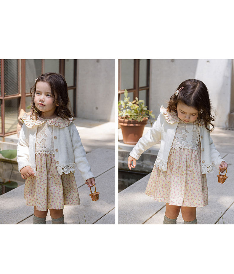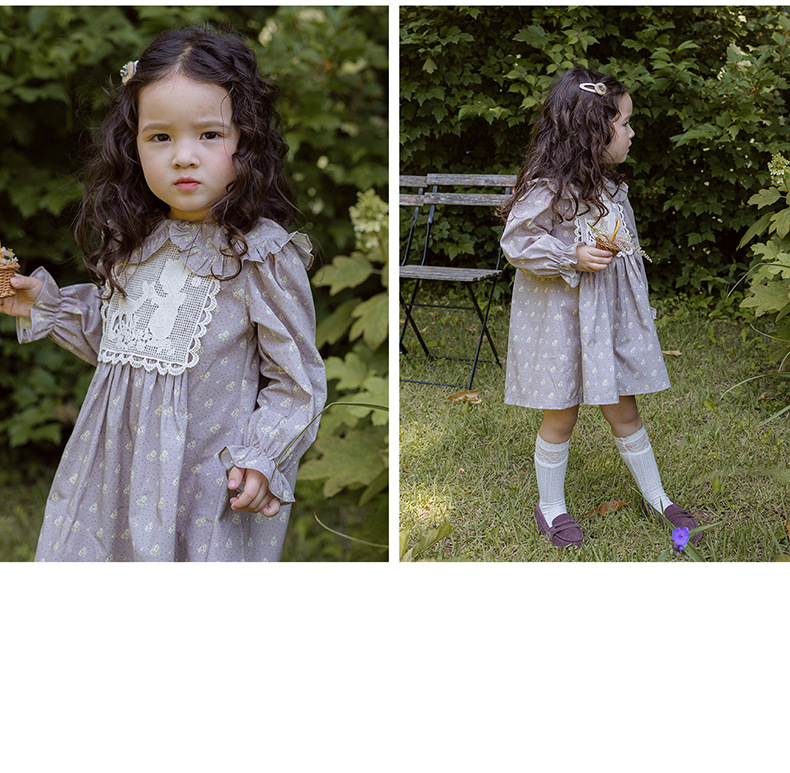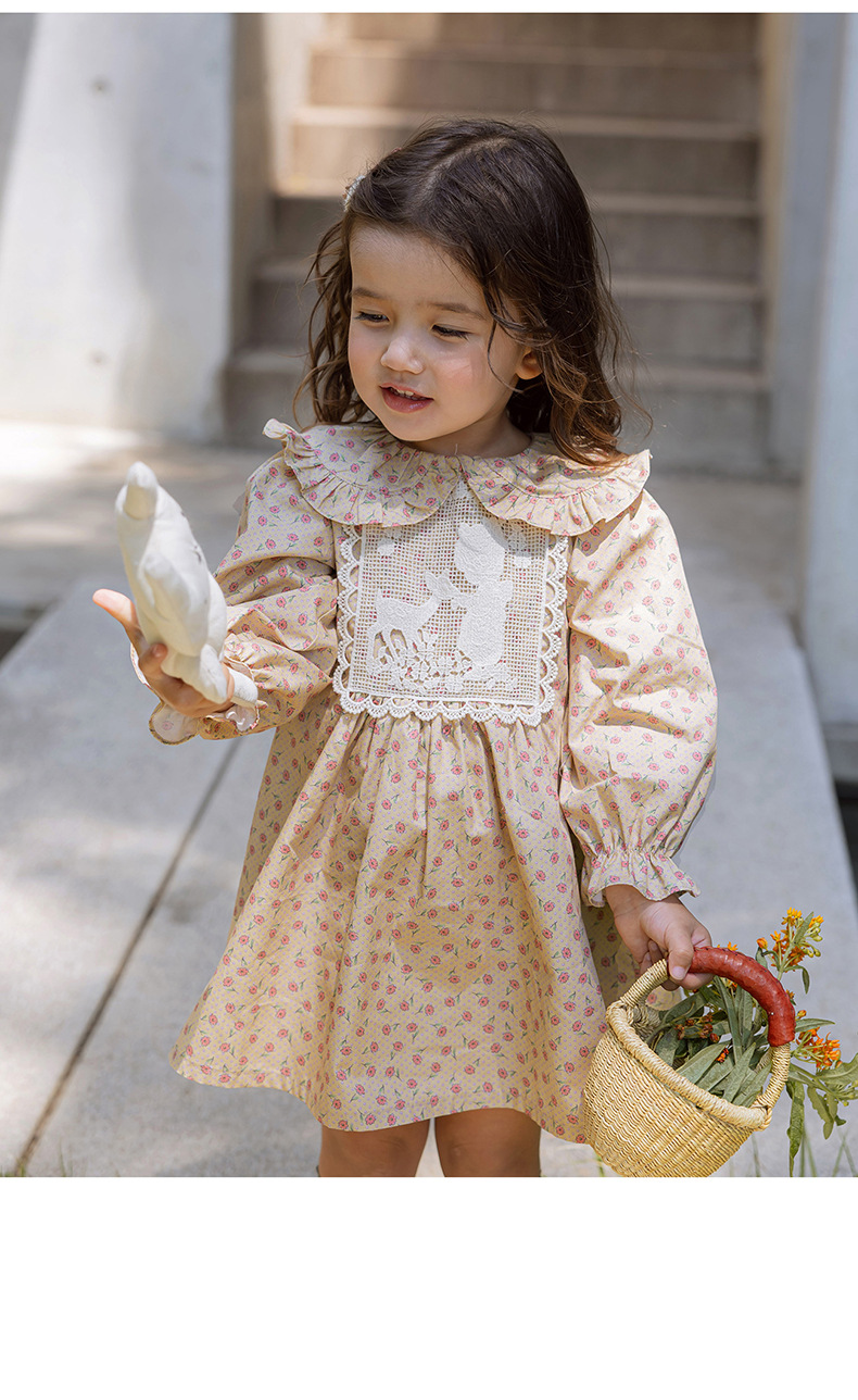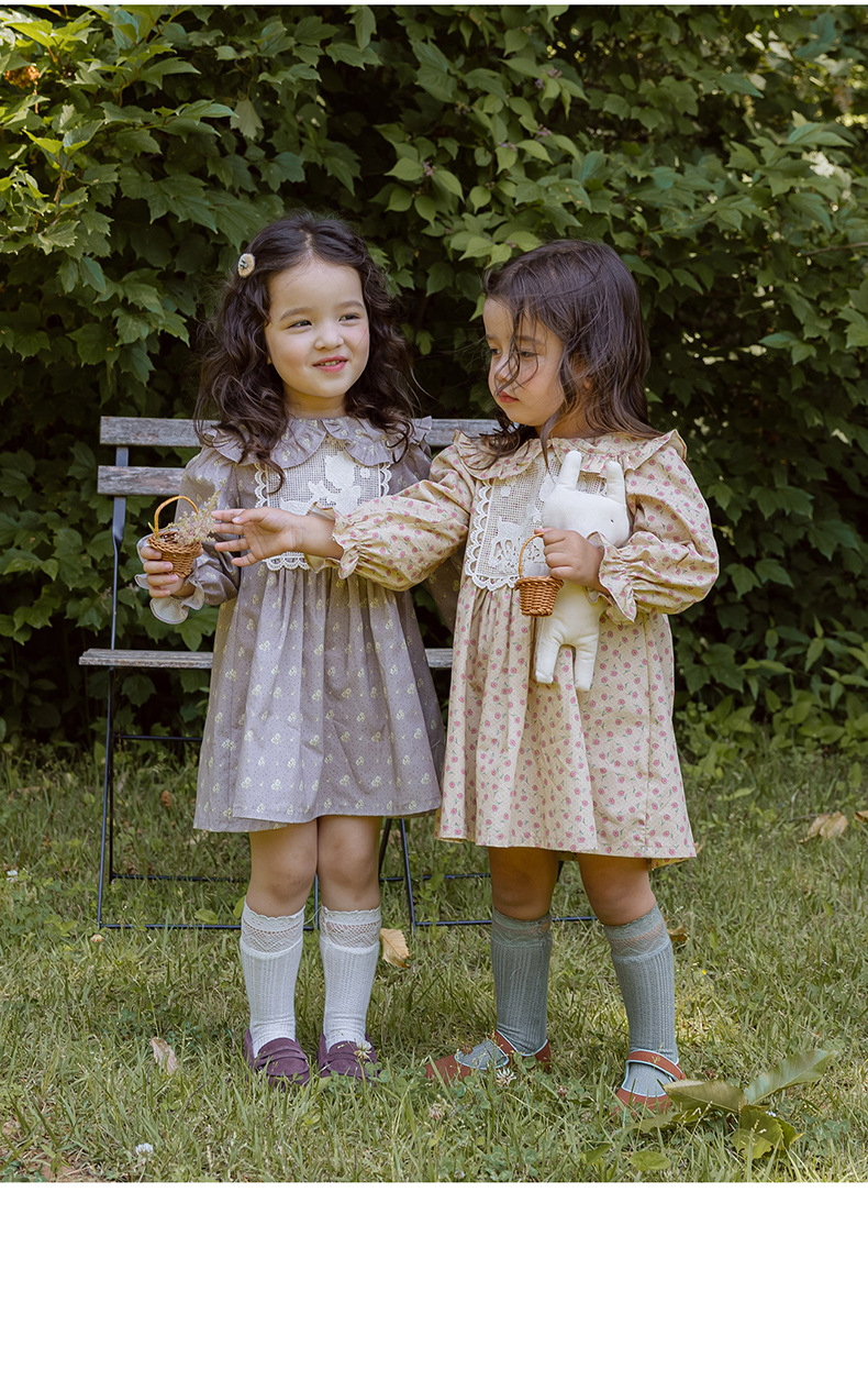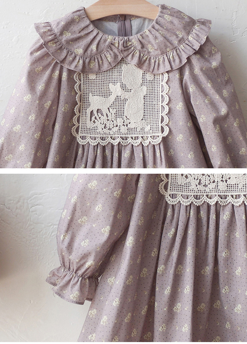 クロシェ編みのビブフリルがアクセントになった長袖ワンピース。クラシカルなデザインが上品な雰囲気を演出し、ナチュラルな優しい風合いが魅力です。身頃は柔らかな素材で着心地が良く、ゆったりとしたシルエットが動きやすさも兼ね備えています。一枚で華やかに決まるデザインなので、お出かけや特別なシーンにもぴったり。