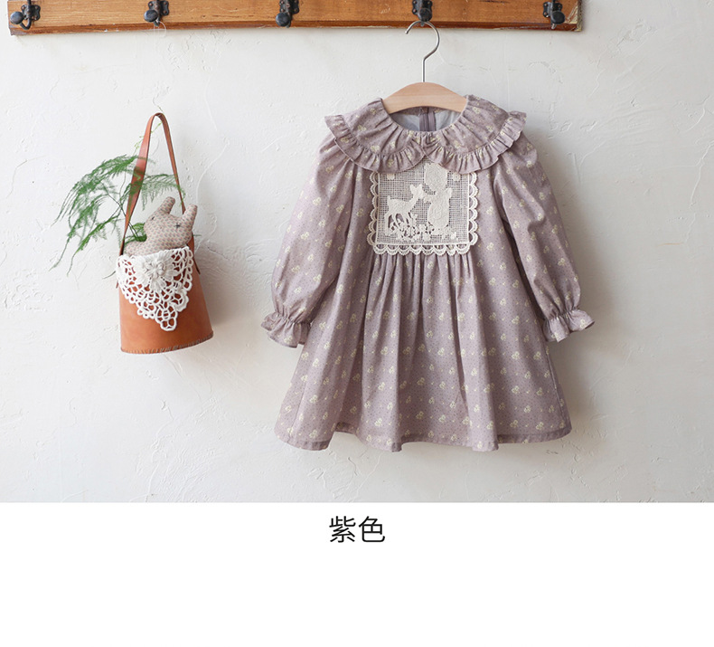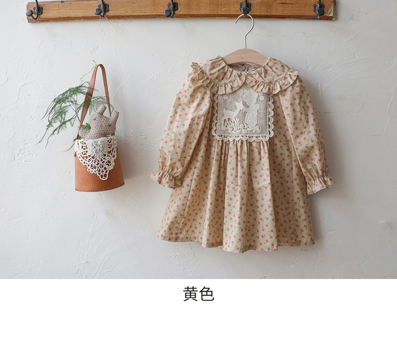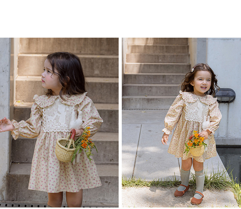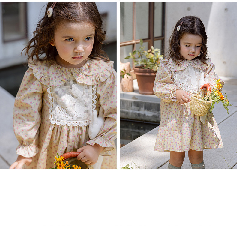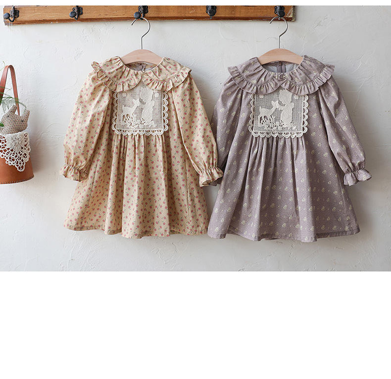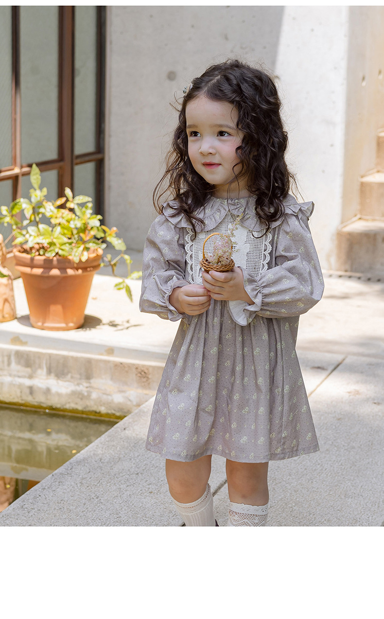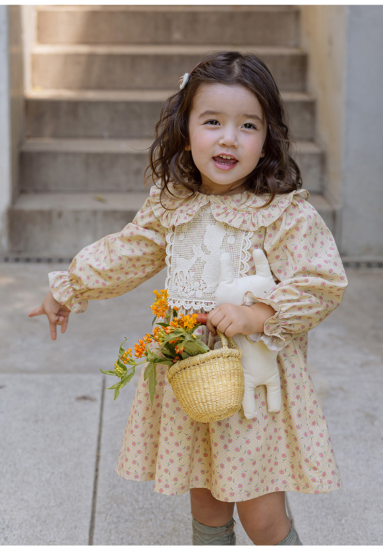 クロシェ編みのビブフリルがアクセントになった長袖ワンピース。クラシカルなデザインが上品な雰囲気を演出し、ナチュラルな優しい風合いが魅力です。身頃は柔らかな素材で着心地が良く、ゆったりとしたシルエットが動きやすさも兼ね備えています。一枚で華やかに決まるデザインなので、お出かけや特別なシーンにもぴったり。