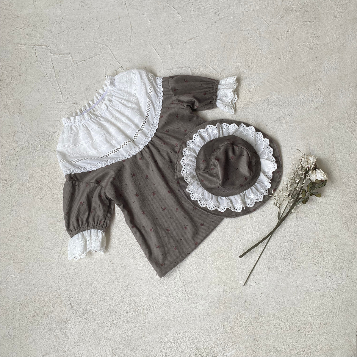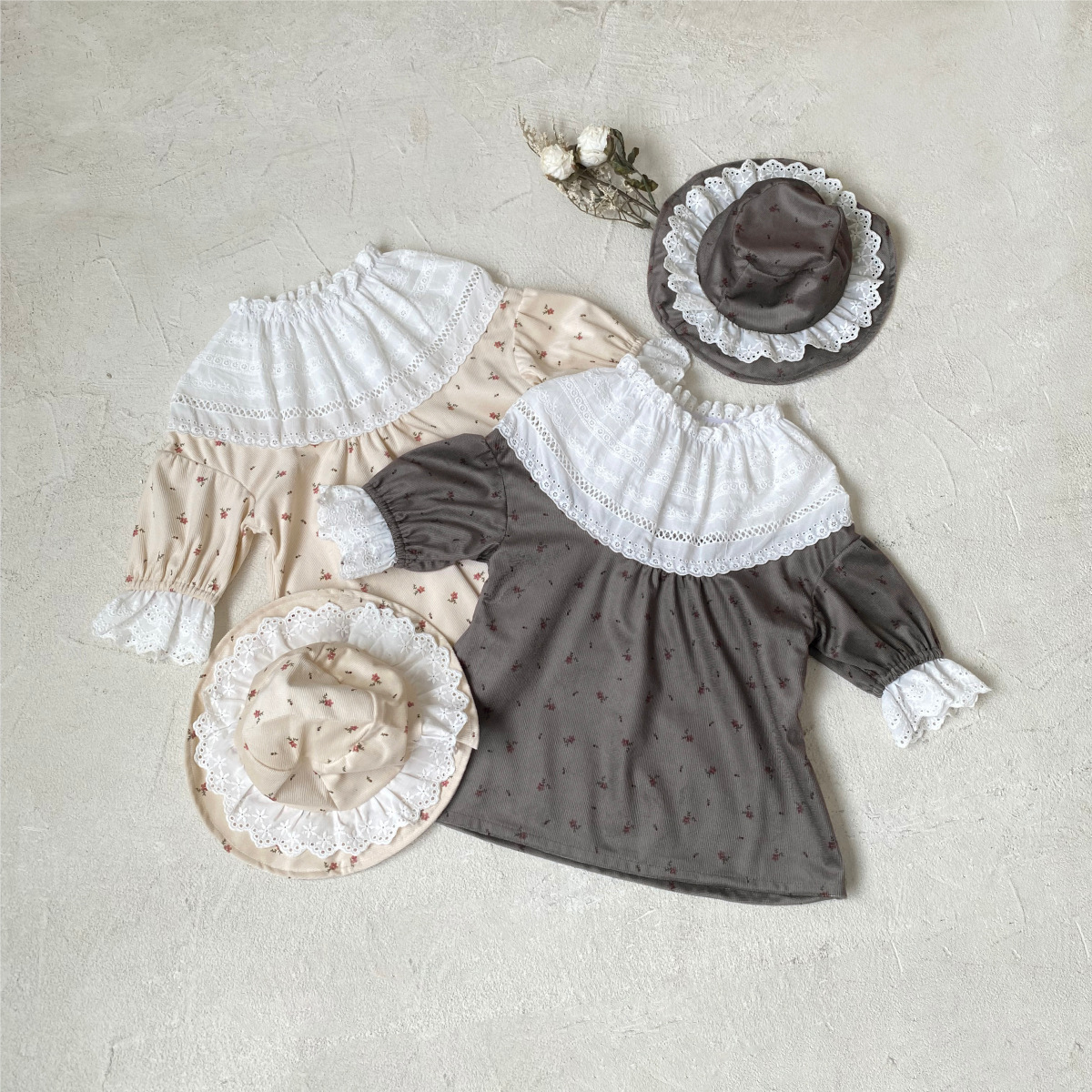繊細なレースと可憐なフラワープリントが、まるで絵本から飛び出してきたような愛らしさのガールズ用長袖ワンピースと帽子のセットです。レトロな雰囲気漂うデザインに、フリルがガーリーなアクセントをプラス。ワンピースはふんわりとしたシルエットで、お子様の可愛らしさを引き立てます。お揃いの帽子を被れば、さらにロマンティックな雰囲気に。春や秋の普段使いにはもちろん、写真撮影や特別な日の装いにもぴったりです。