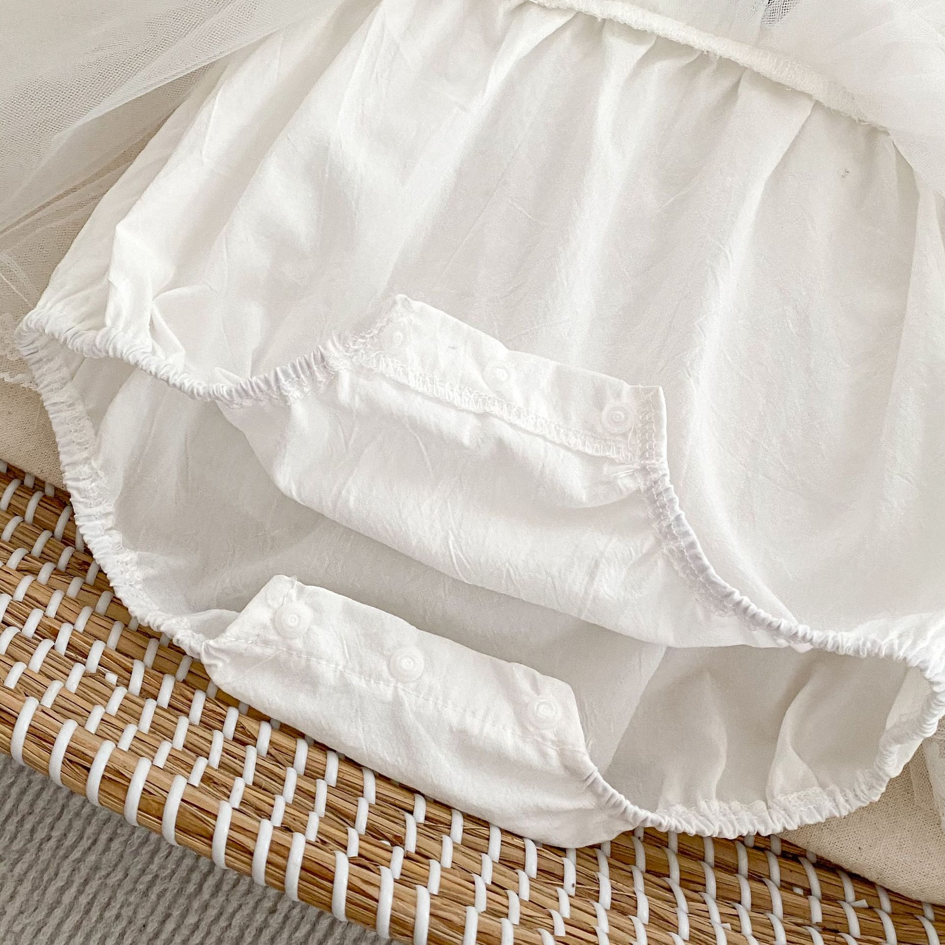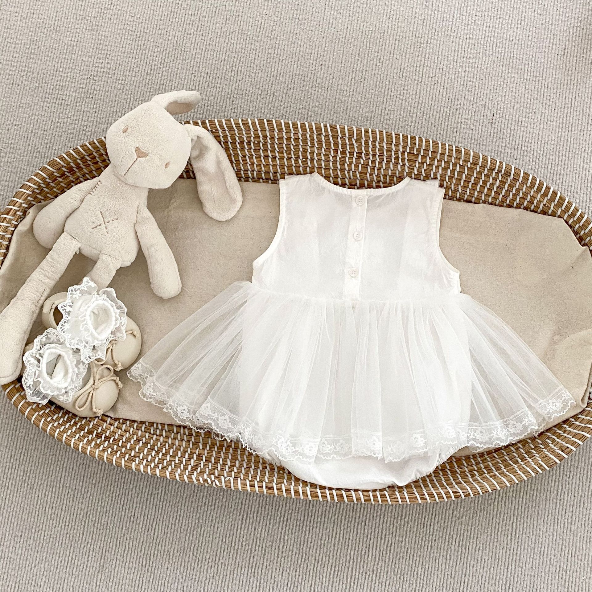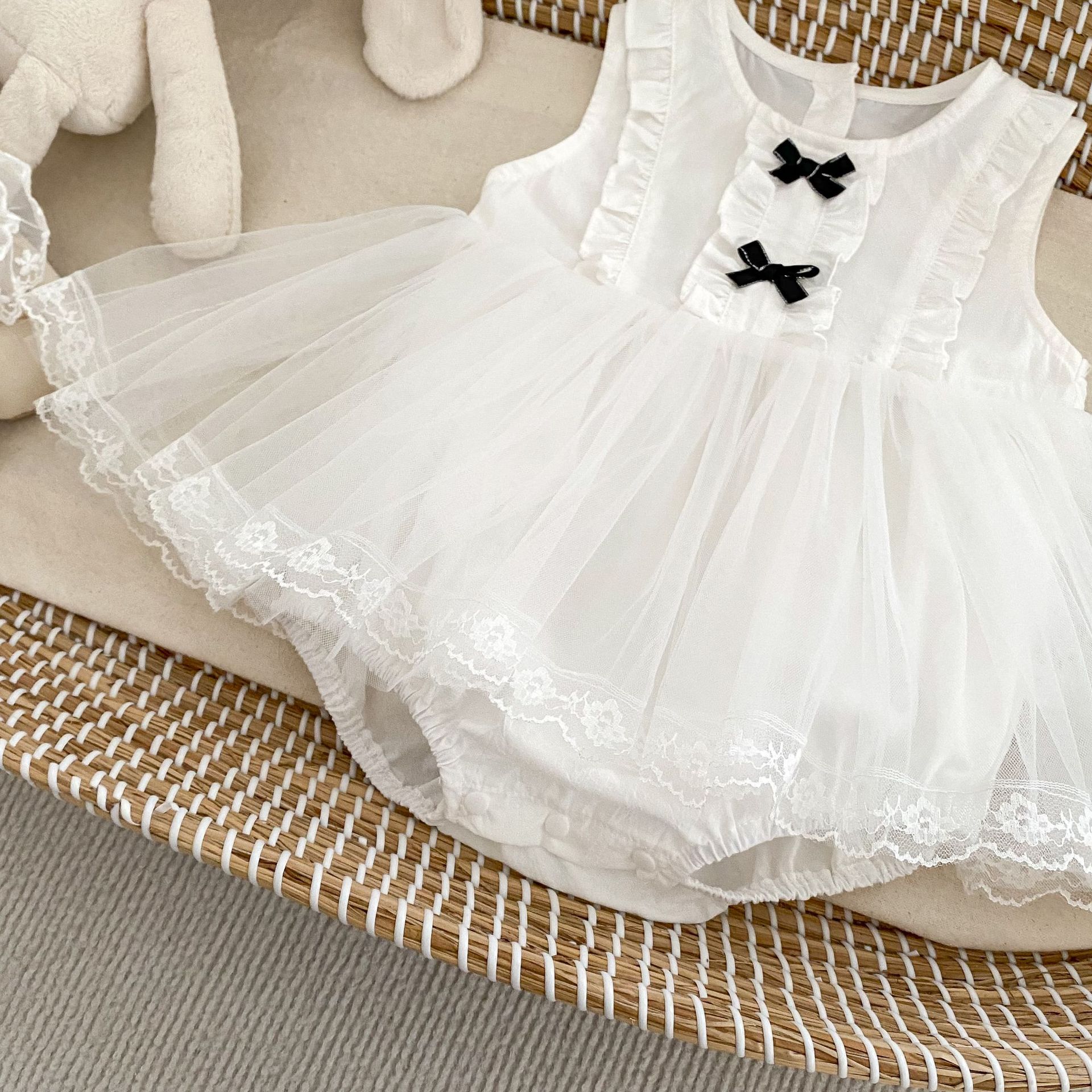 胸元のリボンと、ふんわりと広がるフリルスカートが、まるで小さなバレリーナのような愛らしさを演出するベビーガール用ノースリーブロンパースです。夏のベビーにぴったりの、軽やかなメッシュ素材を使用。涼しげで、見た目も華やかです。股下はスナップボタン式になっているので、お着替えやおむつ替えも簡単。お宮参りや、100日祝いなど、特別な日のおめかしにもぴったりです。普段使いにも、ちょっとしたお出かけにもおすすめの一枚です。