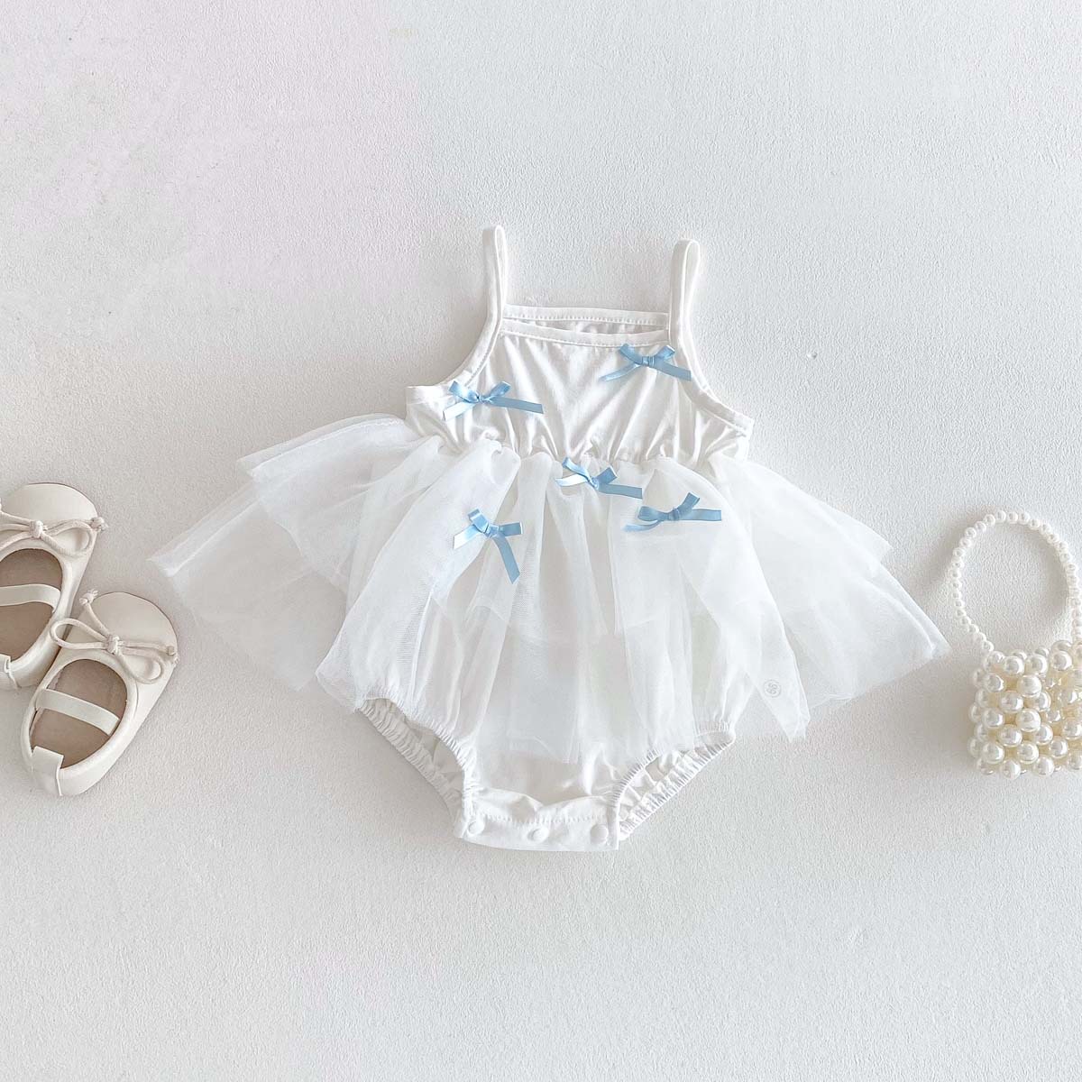 胸元にランダムなリボンと、ふんわりと広がるチュールスカートが、まるで小さなプリンセスのような愛らしさを演出するベビーガール用キャミソールロンパースです。夏のベビーにぴったりの、涼しげな素材を使用。お着替えやおむつ替えも簡単なスナップボタン式。お宮参りや、初めてのお誕生日など、特別な日のおめかしにもぴったりです。普段使いにも、ちょっとしたお出かけにもおすすめの一枚です。