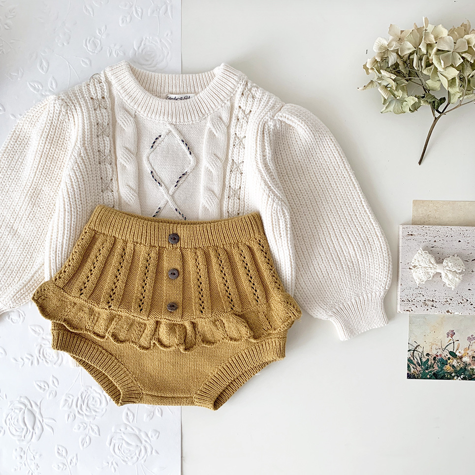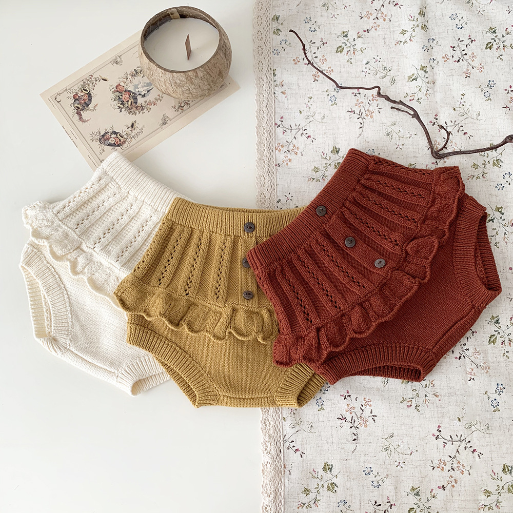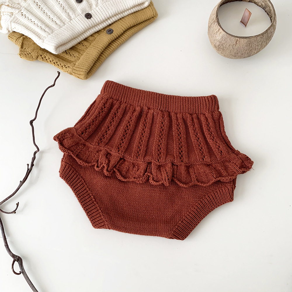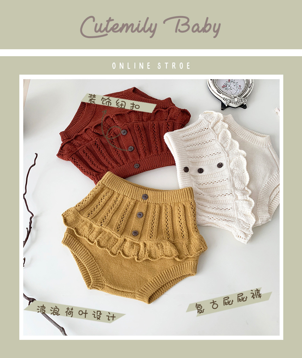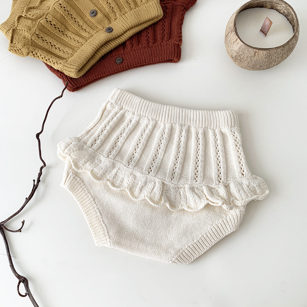 春の装いにぴったりの、繊細なフリルとレースが愛らしいキッズガール用ニットブルマパンツです。透かし編みのデザインが涼しげな印象を与え、レトロな雰囲気も漂います。柔らかな素材で、ベビーの肌に優しく、快適な穿き心地。おむつを履いたおしりを可愛らしく包み込むデザインです。普段使いにはもちろん、トップスと合わせておしゃれなコーディネートを楽しめます。