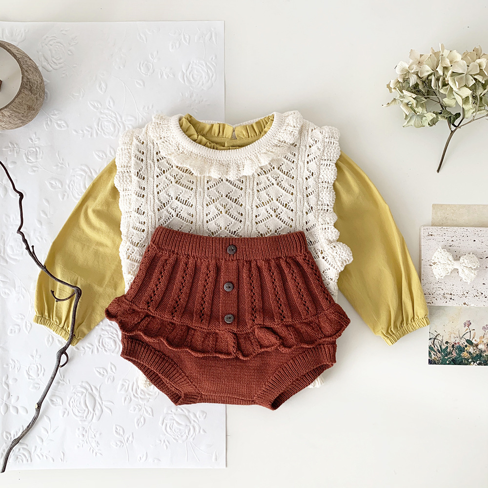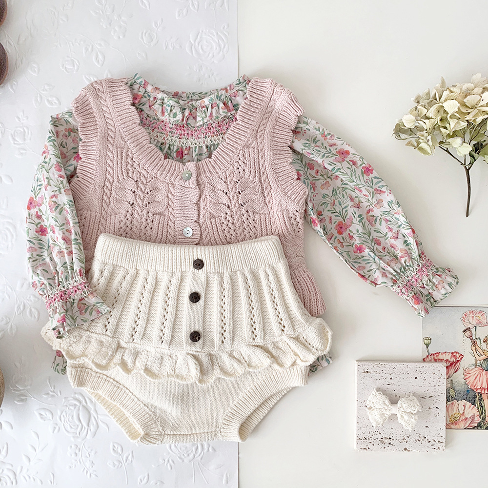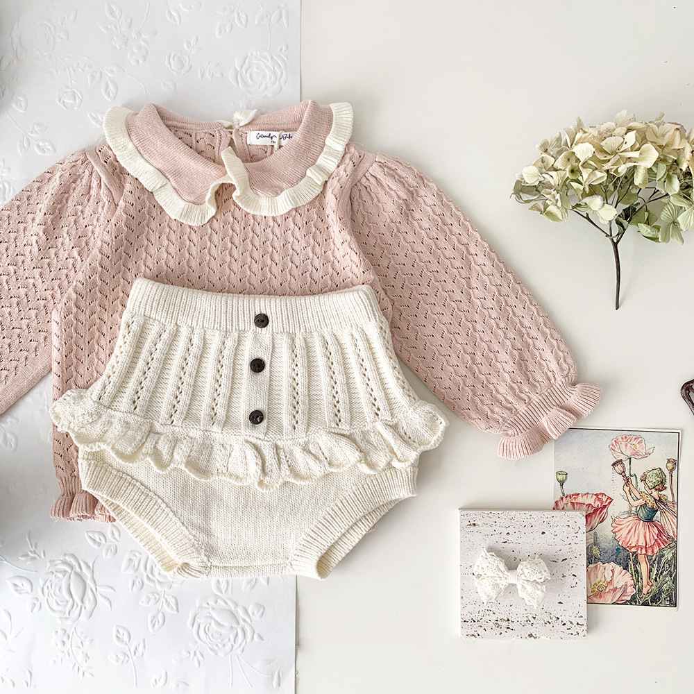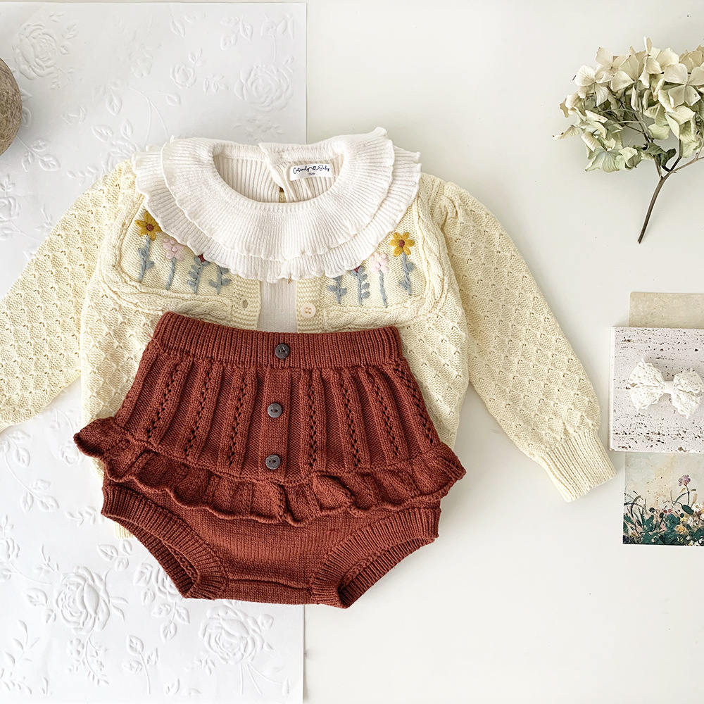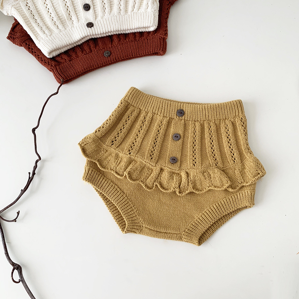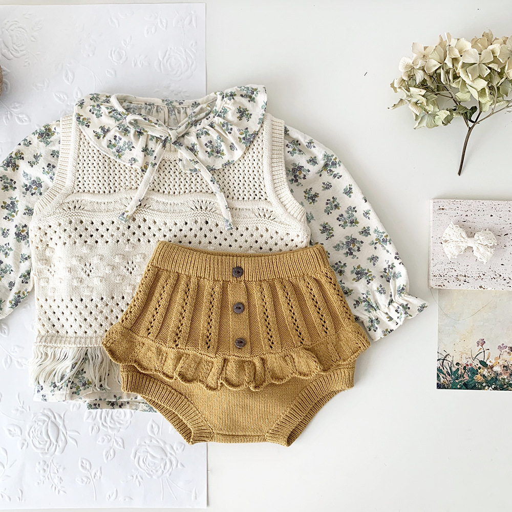 春の装いにぴったりの、繊細なフリルとレースが愛らしいキッズガール用ニットブルマパンツです。透かし編みのデザインが涼しげな印象を与え、レトロな雰囲気も漂います。柔らかな素材で、ベビーの肌に優しく、快適な穿き心地。おむつを履いたおしりを可愛らしく包み込むデザインです。普段使いにはもちろん、トップスと合わせておしゃれなコーディネートを楽しめます。