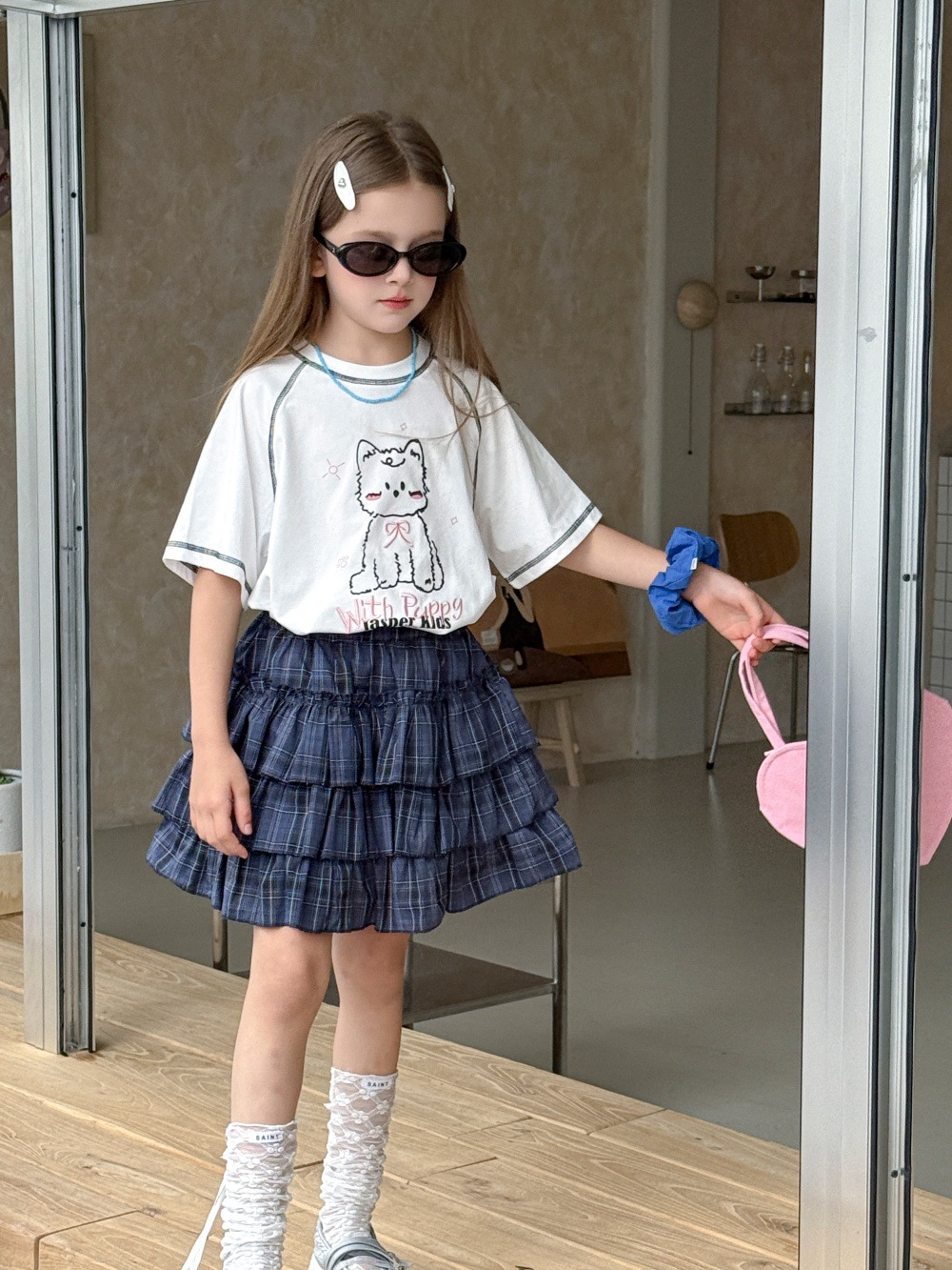 爽やかなチェック柄が特徴で、何層にも重なったティアードデザインが、まるでケーキのようにふんわりとしたシルエットを演出します。スカートの下には安全パンツが一体化しているので、活発に動き回るお子さんでも安心です。Tシャツやブラウスと合わせて、普段使いはもちろん、ちょっとしたお出かけにも活躍するでしょう。