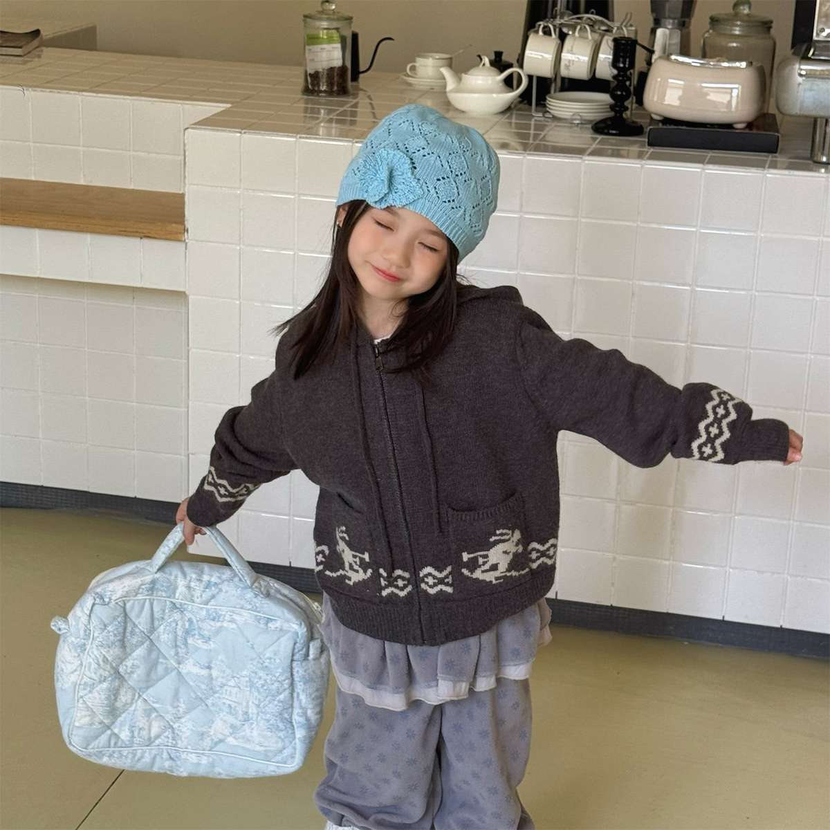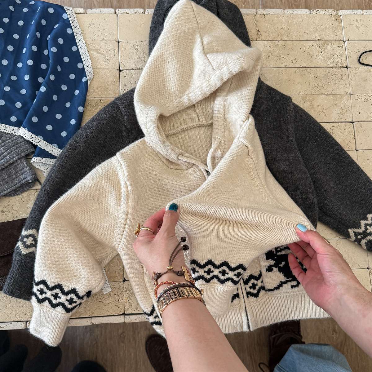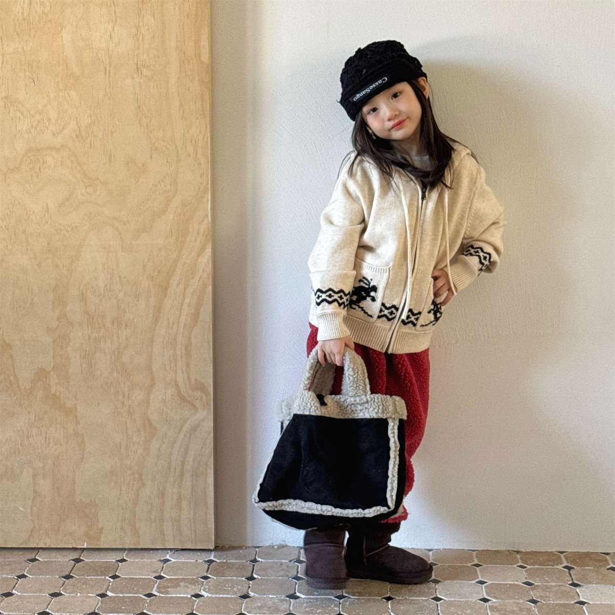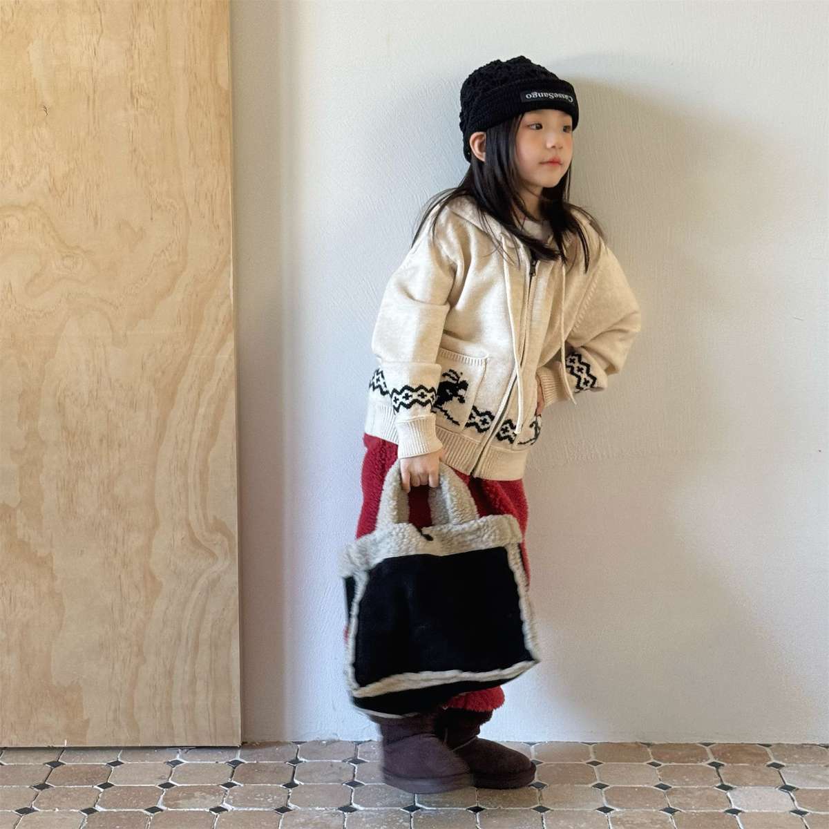 ゆったりとしたシルエットのニットフーディは、季節の変わり目のおしゃれに欠かせない子ども服です。ジップアップデザインでさっと羽織れるカーディガンは、スタイリッシュなノルディック柄がアクセントとなり、カジュアルながらも洗練された印象を与えます。肌触りの良いニットウェアは、男の子にも女の子にも人気の高いトップスとして、ベビーやキッズの装いに暖かさとトレンド感をプラスします。