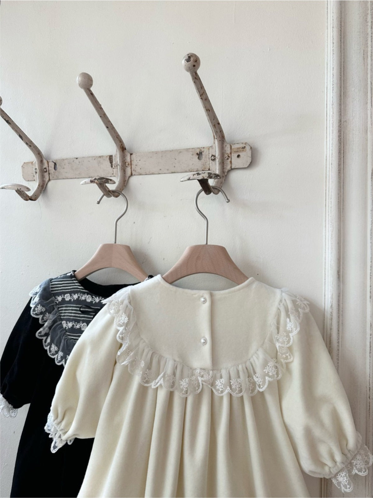 長袖ワンピース ベロア レースリボン パフスリーブ ドレス フォーマル【mh0011636】