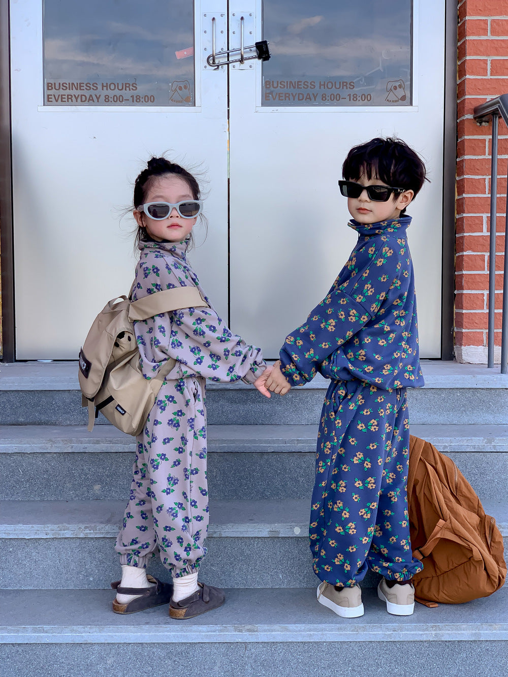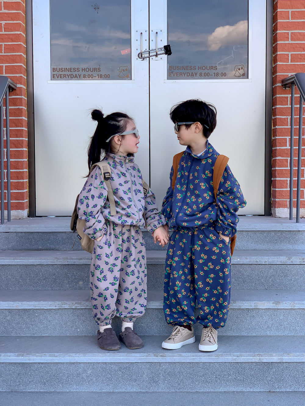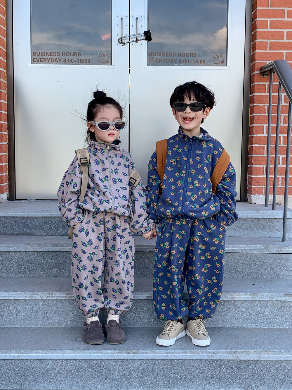総柄のフラワープリントが目を惹くキッズセットアップは、お出かけが楽しくなる華やかなトラックスーツです。さらりとした着心地のジャケットはファスナー仕様で脱ぎ着しやすく、同柄のパンツとの組み合わせはトレンドのストリートスタイルを完成させます。カジュアルながらもデザイン性の高いこの子ども服のツーピースセットは、活発に動くお子様のデイリーウェアとして、また写真映えする特別な装いとしても活躍します。
