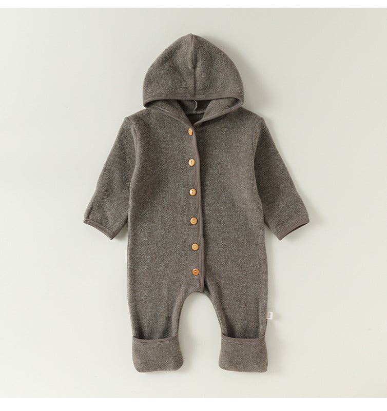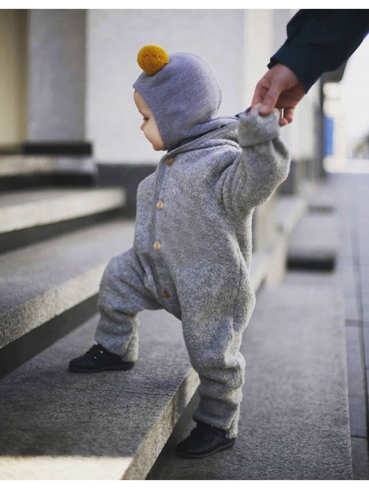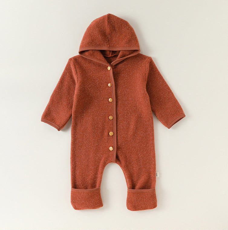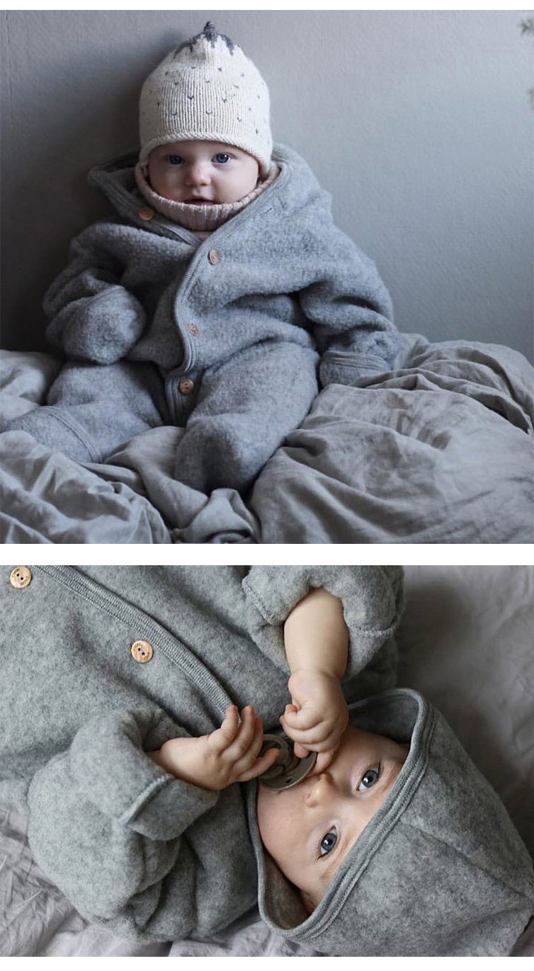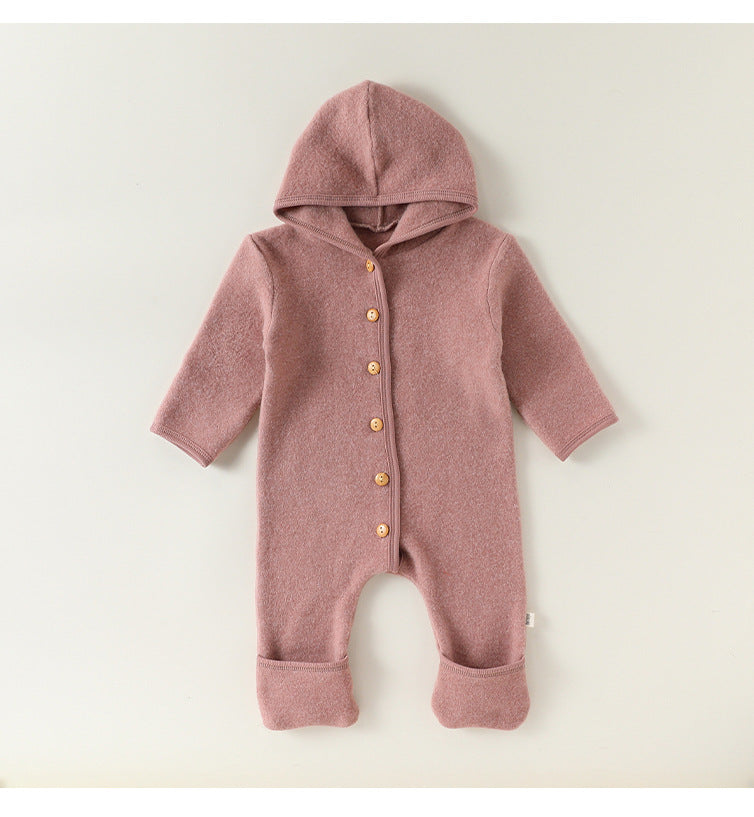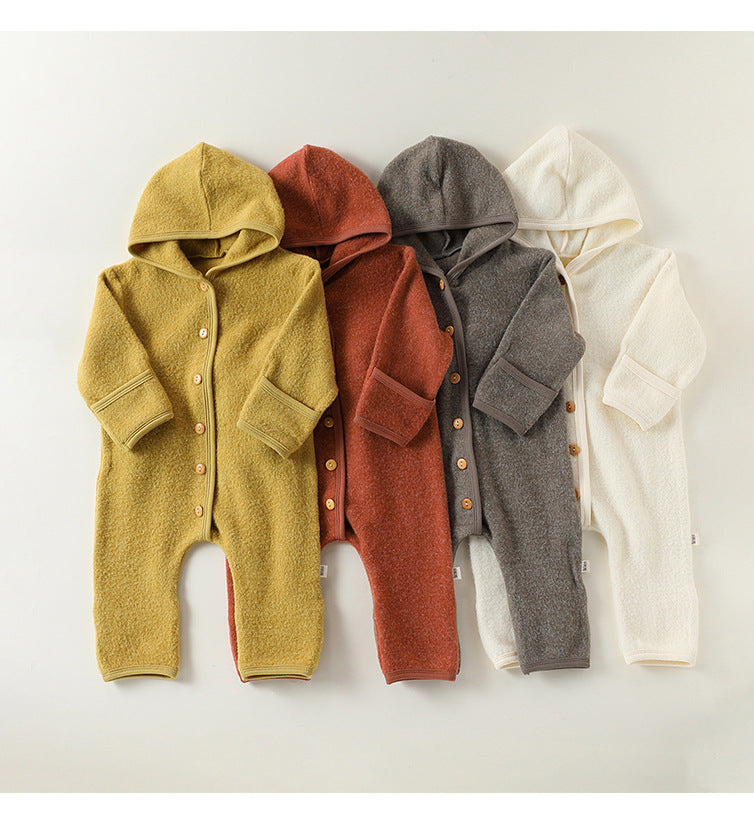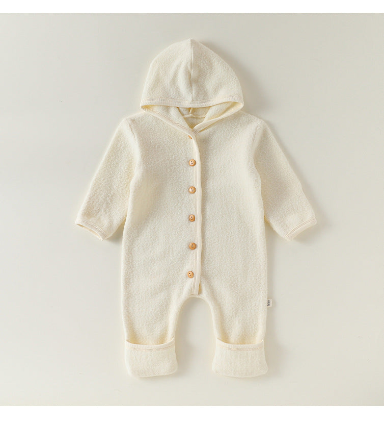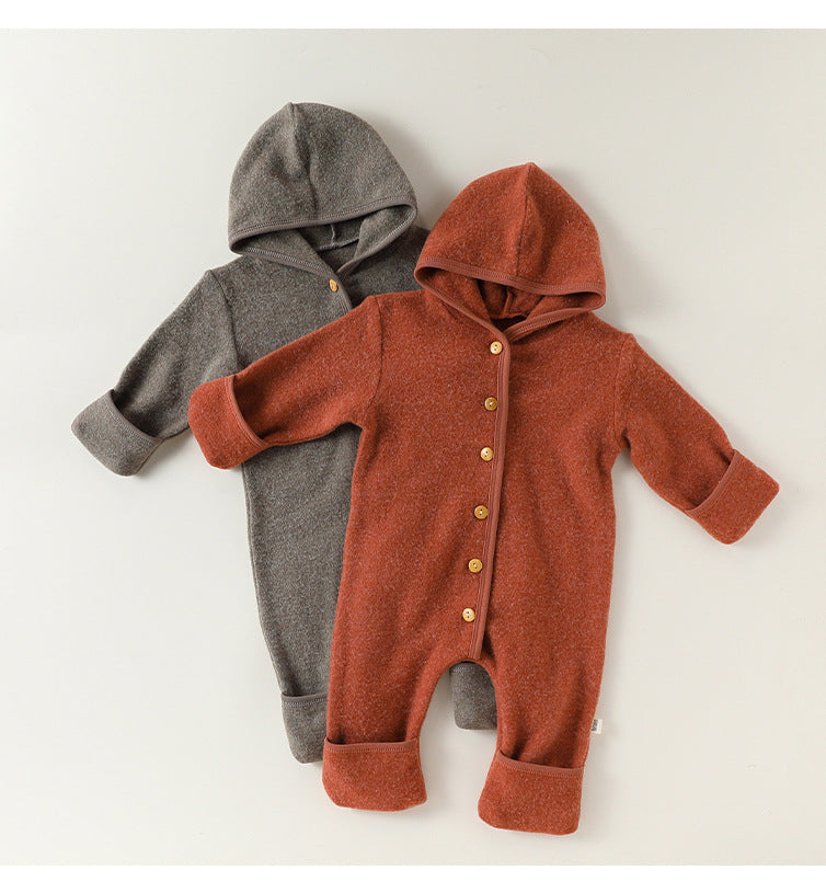 シンプルなデザインと、柔らかな着心地が魅力のベビー用長袖フーディジャンプスーツです。頭までしっかりとカバーするフード付きで、お出かけ時の冷えからベビーを守ります。伸縮性のある生地感で着せやすく、動きやすさも確保されたロンパースは、日常使いに最適なボディスーツです。