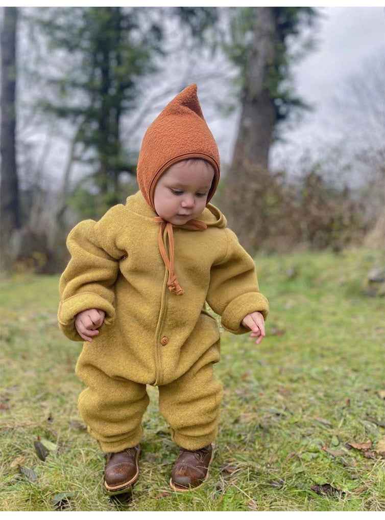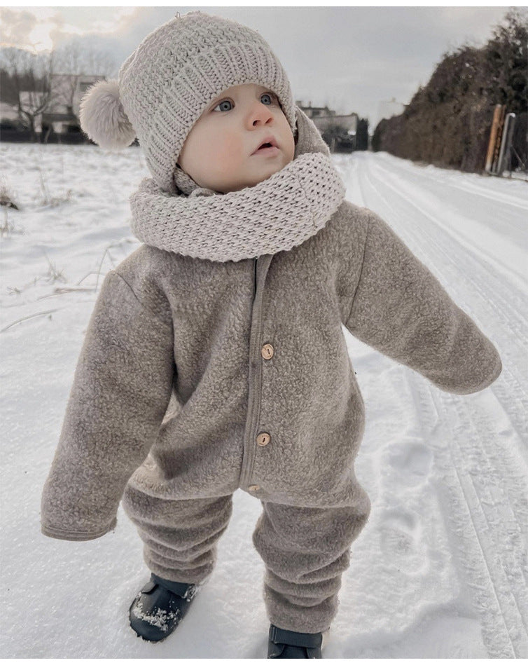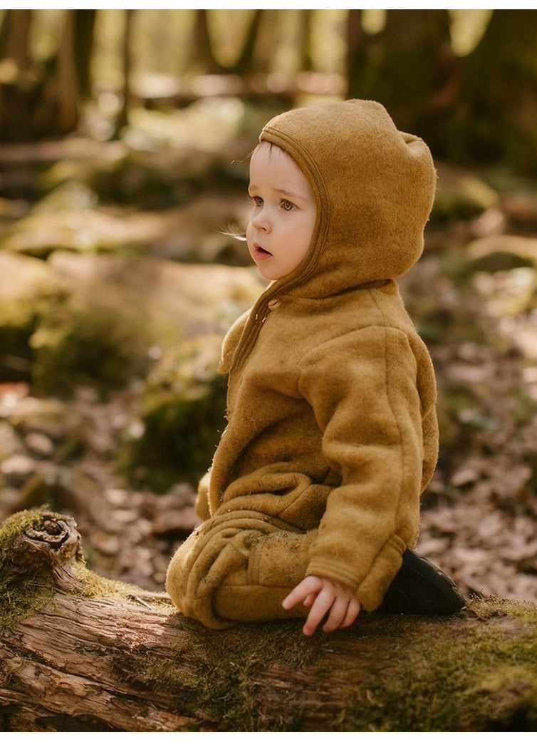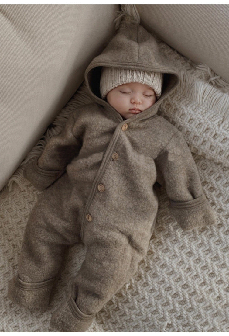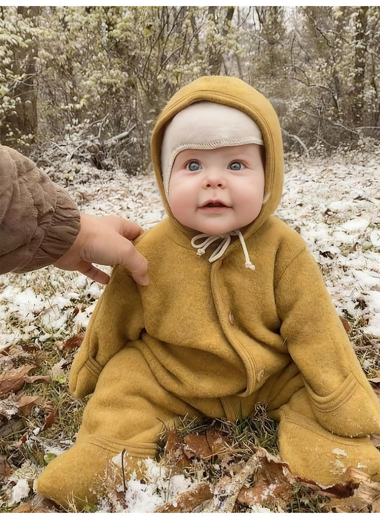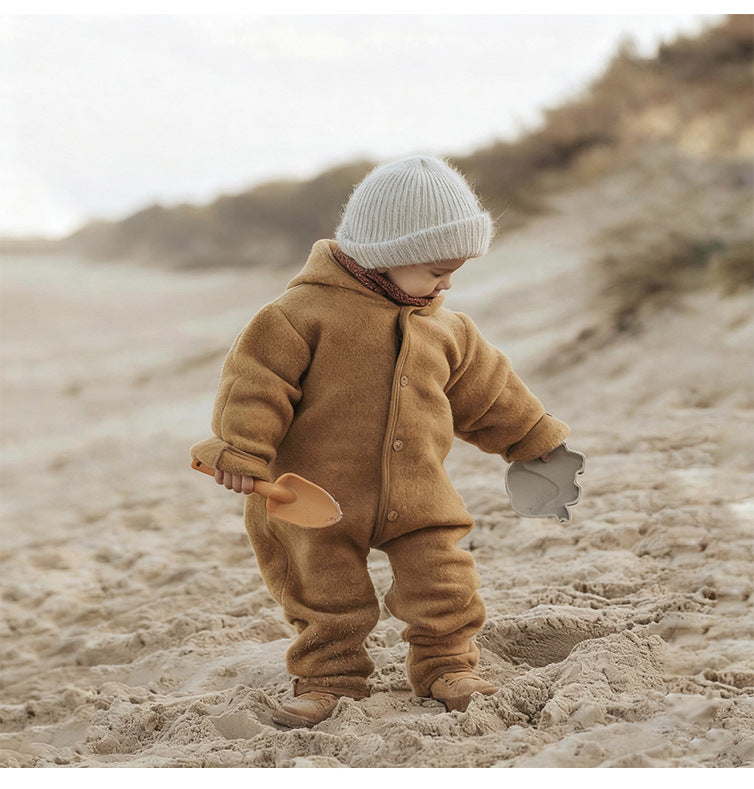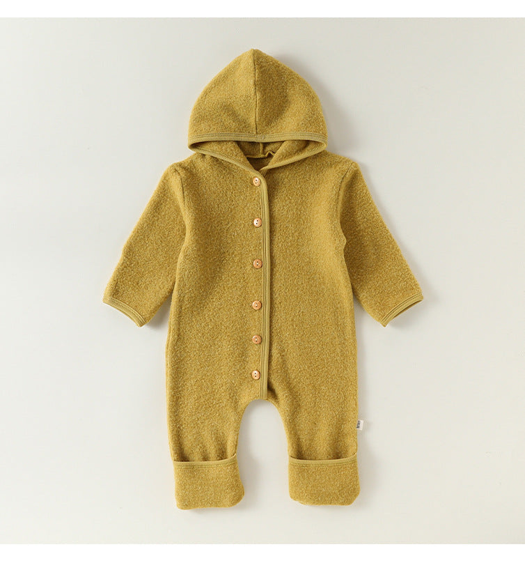 シンプルなデザインと、柔らかな着心地が魅力のベビー用長袖フーディジャンプスーツです。頭までしっかりとカバーするフード付きで、お出かけ時の冷えからベビーを守ります。伸縮性のある生地感で着せやすく、動きやすさも確保されたロンパースは、日常使いに最適なボディスーツです。
