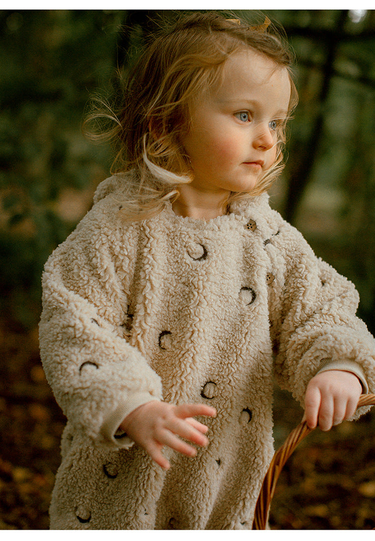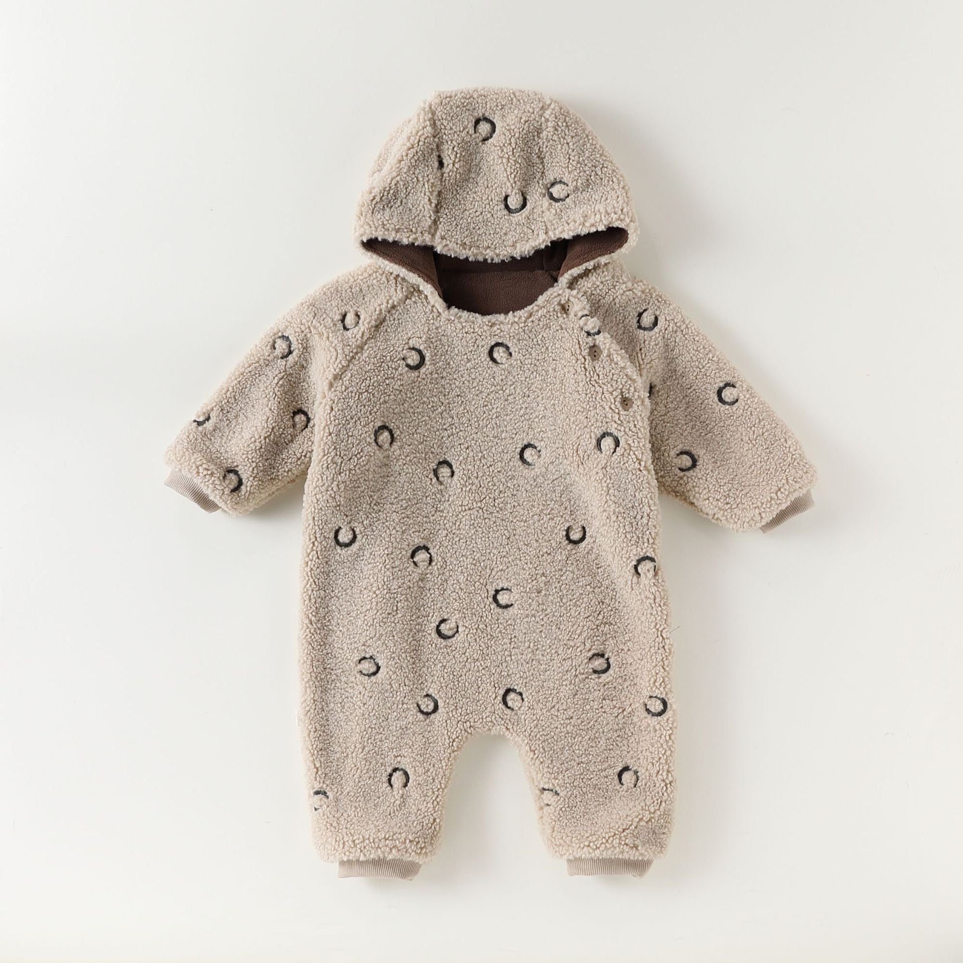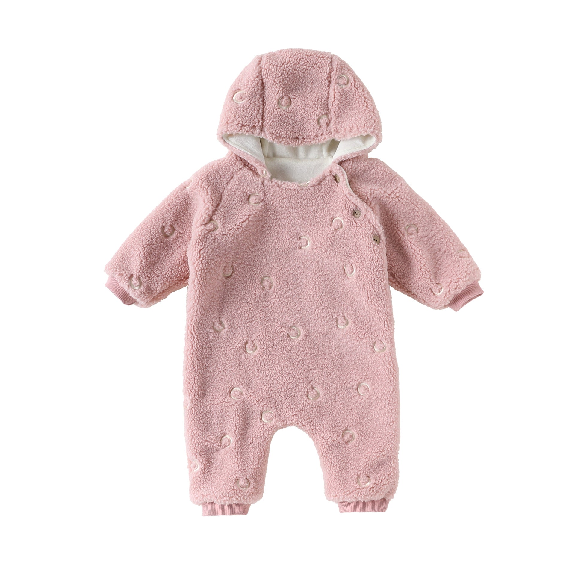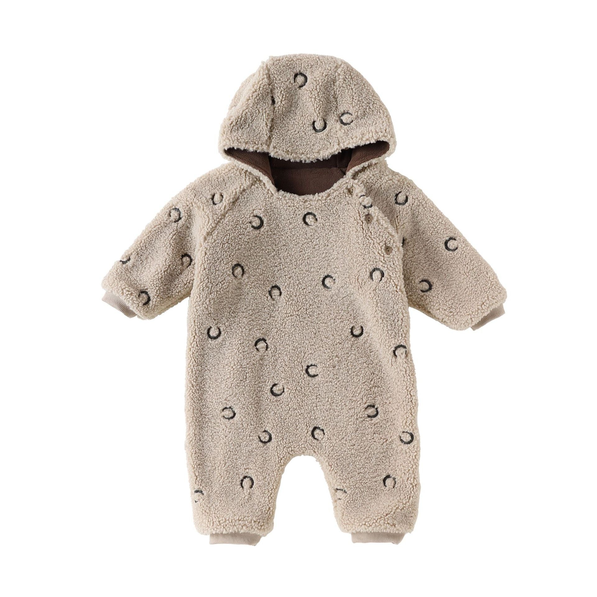 温かいボア素材と中綿を組み合わせた、寒い日のお出かけに最適なベビー用アウタージャンプスーツです。胸元に施された月と星の繊細な刺繍が、デザインにロマンティックな魅力を添えています。厚手の生地がベビーを優しく包み込み、フード付きのデザインがさらに防寒性を高める、ロンパース型の機能的なボディスーツです。