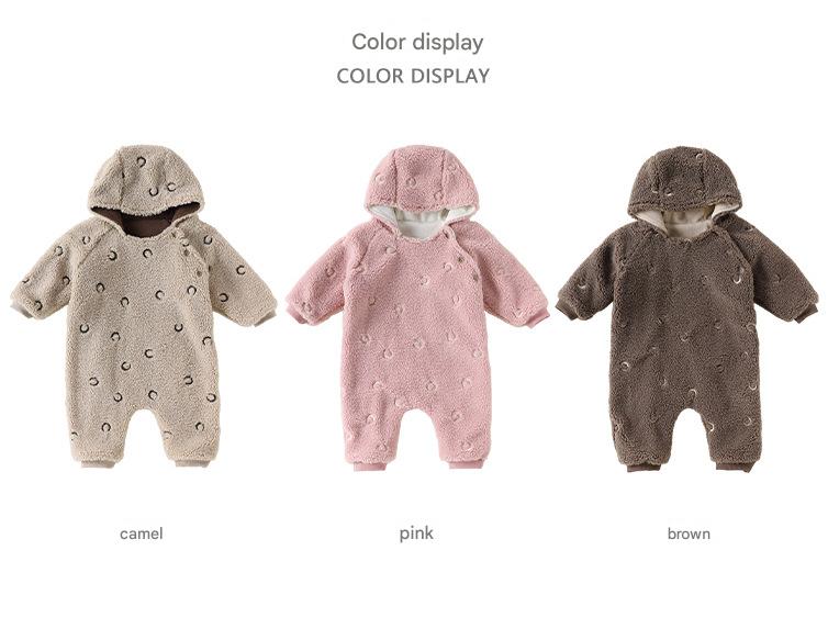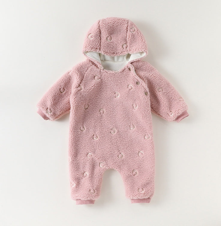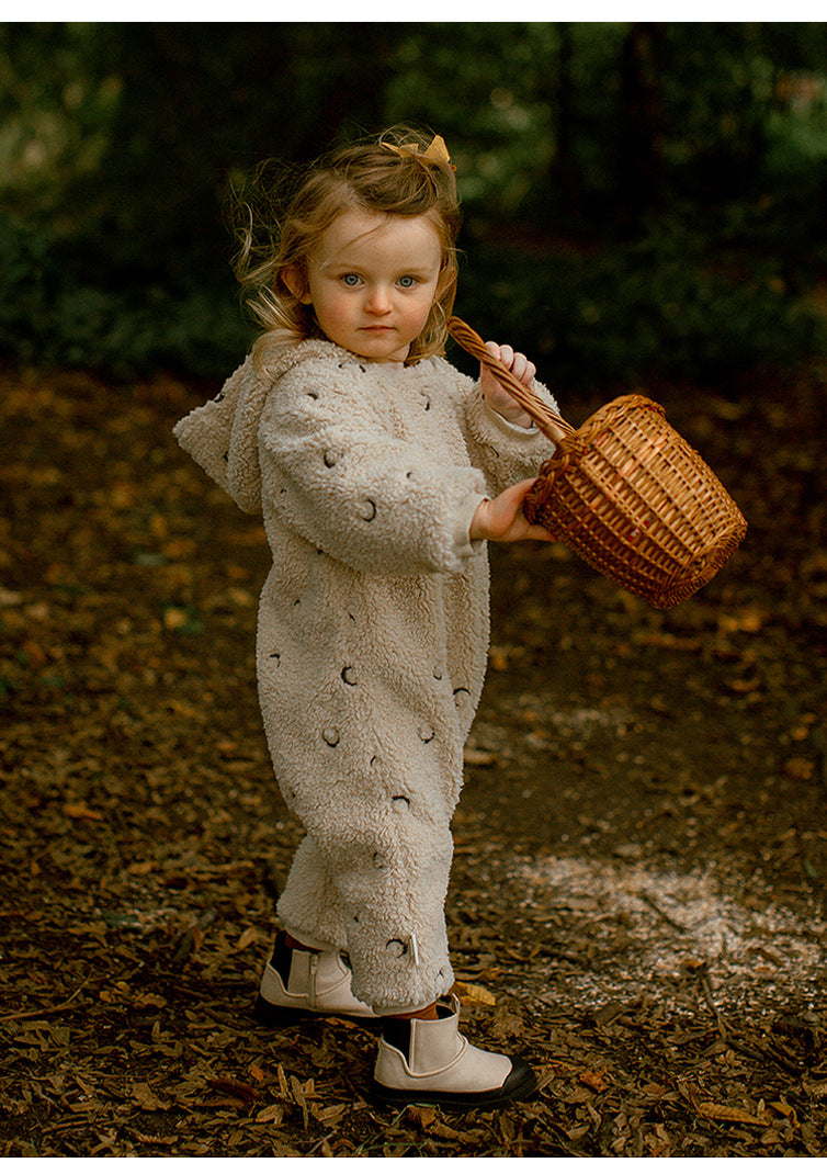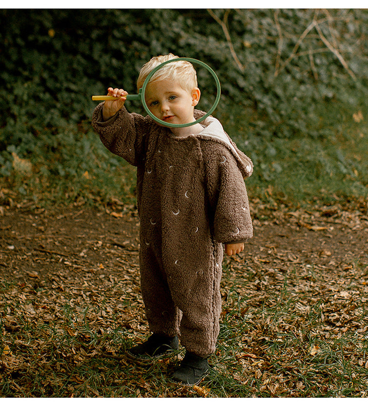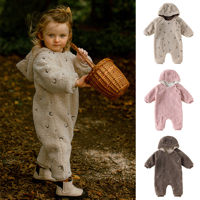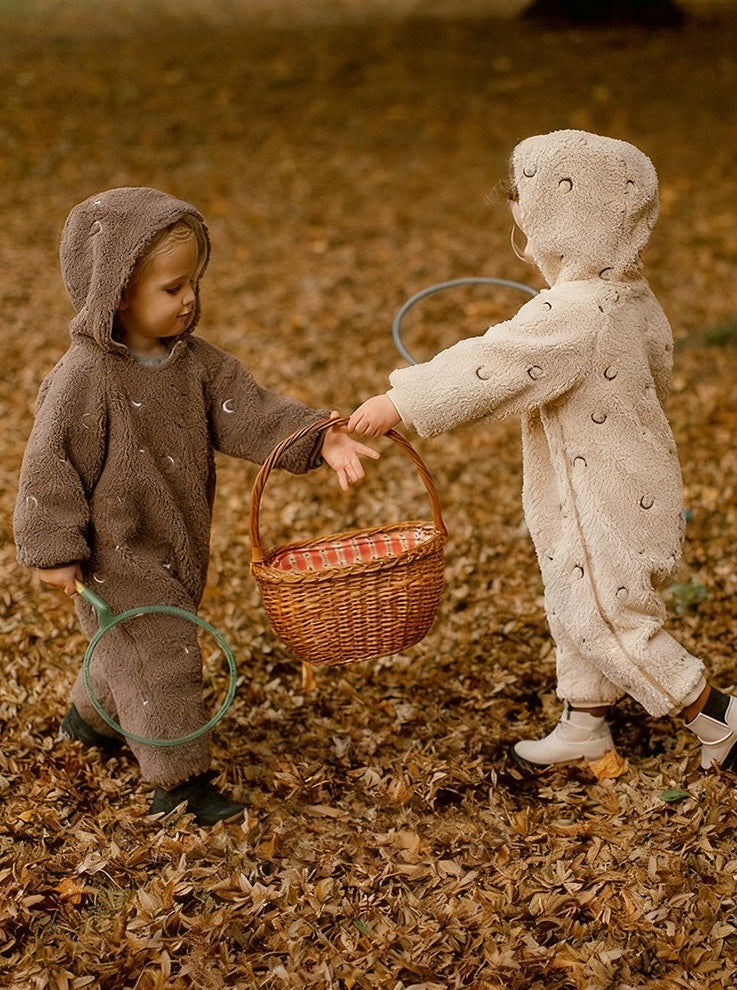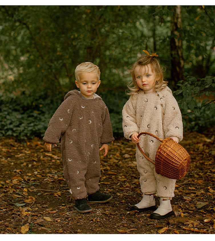 温かいボア素材と中綿を組み合わせた、寒い日のお出かけに最適なベビー用アウタージャンプスーツです。胸元に施された月と星の繊細な刺繍が、デザインにロマンティックな魅力を添えています。厚手の生地がベビーを優しく包み込み、フード付きのデザインがさらに防寒性を高める、ロンパース型の機能的なボディスーツです。