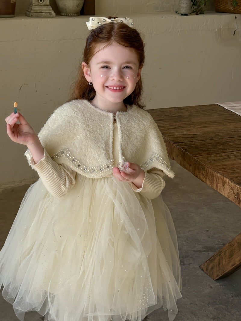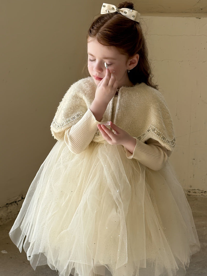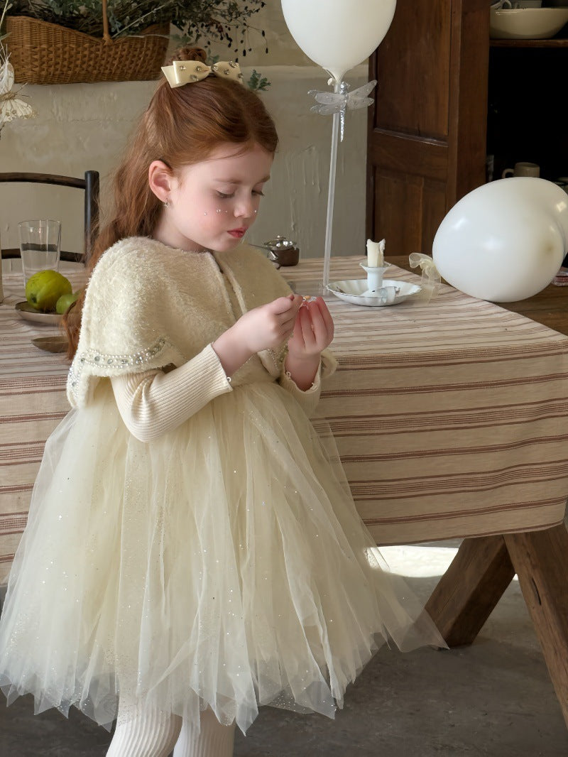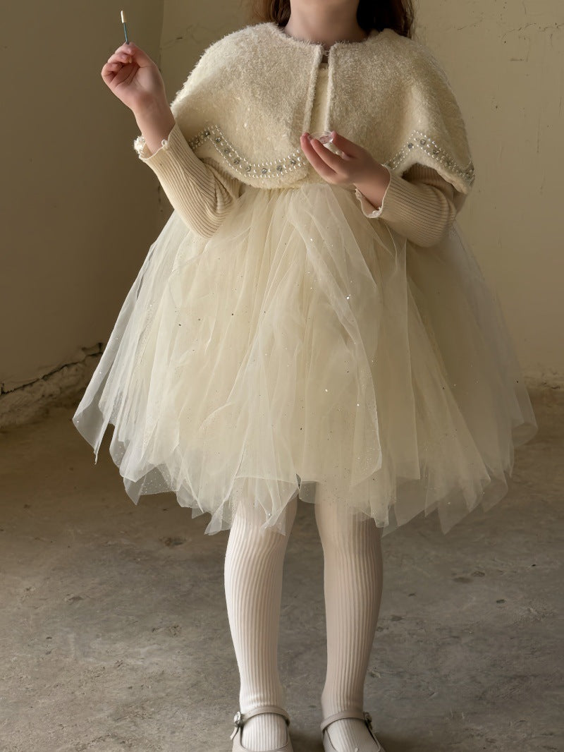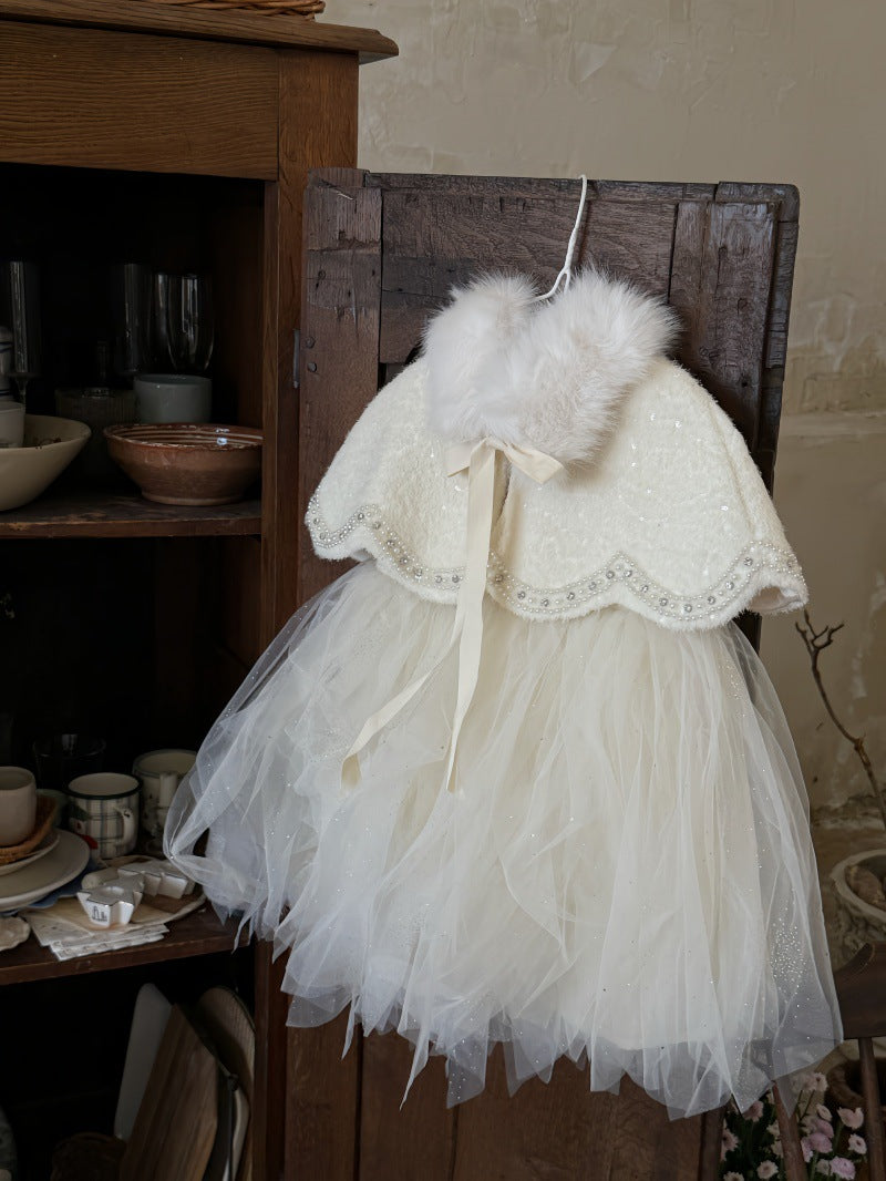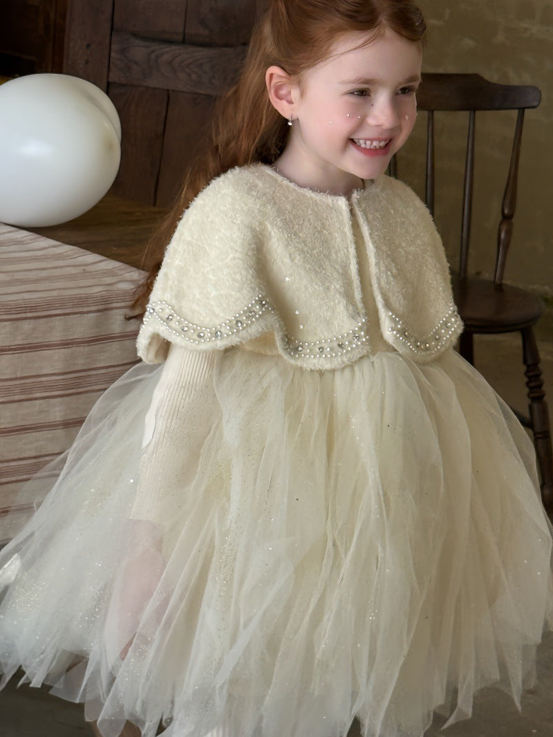 光沢のあるビジュー(釘打ちビーズ)を施したケープと、チュールスカートを組み合わせたノースリーブのドレスワンピースです。透け感のあるメッシュ素材を幾重にも重ねたボリューム感のあるスカートが、華やかなプリンセススタイルを演出します。セットで使えるショールは、室内のパーティや誕生日会など、シーンに合わせた温度調節やスタイルの変化を楽しめるデザインです。落ち着いた質感のノースリーブワンピースに繊細なチュールの質感を加えた上品なテイストで、発表会や特別な日の装いに適した子供用のフォーマルなセットアップです。