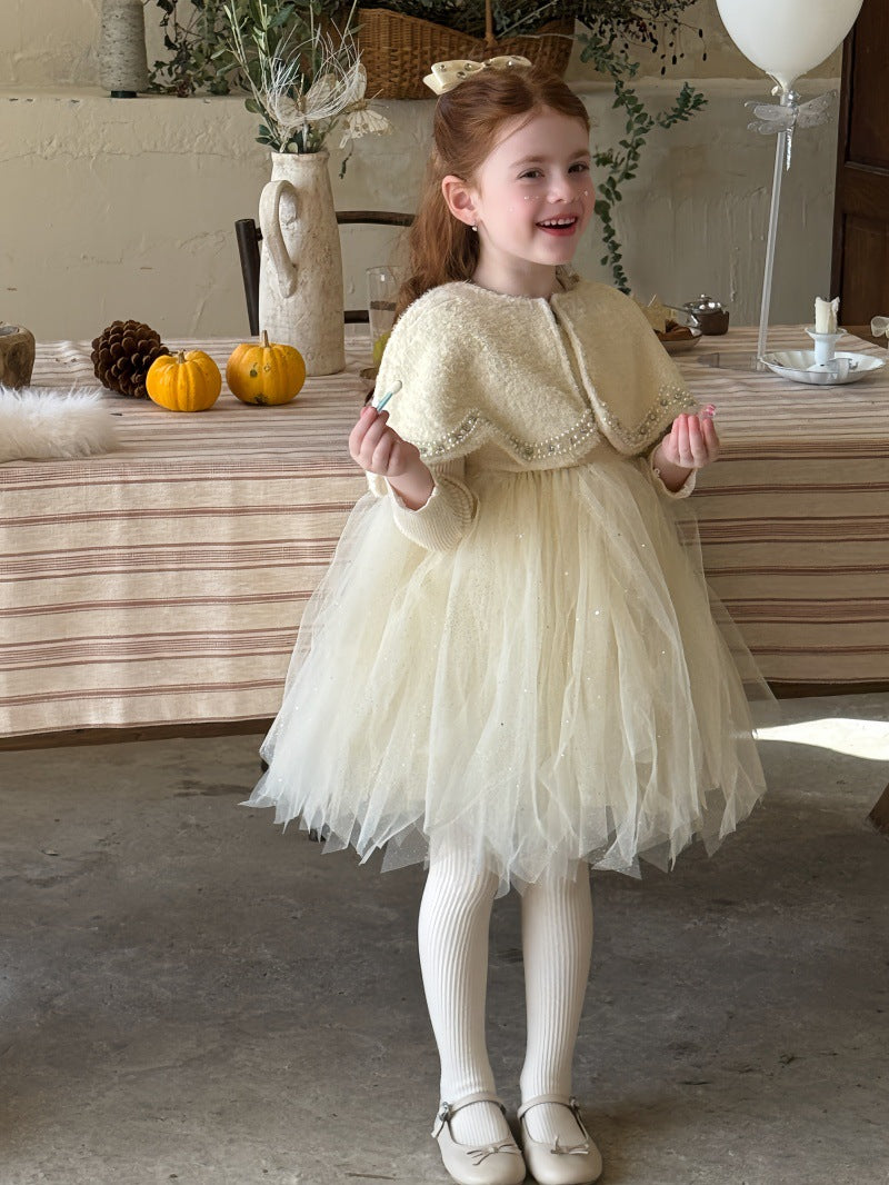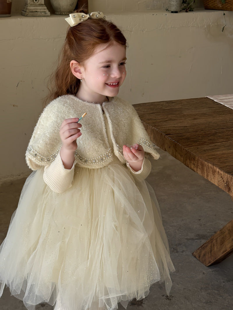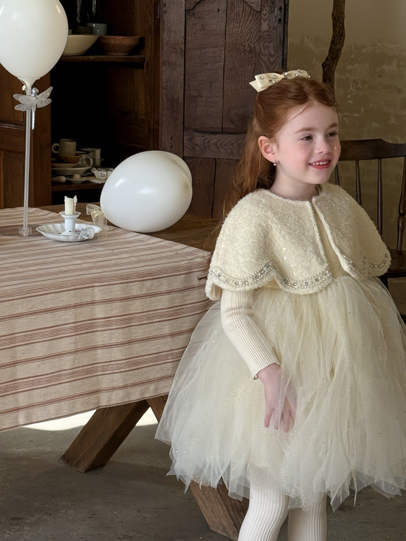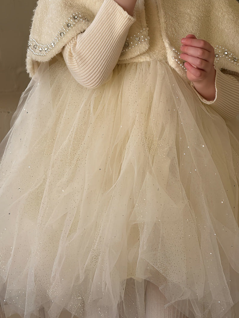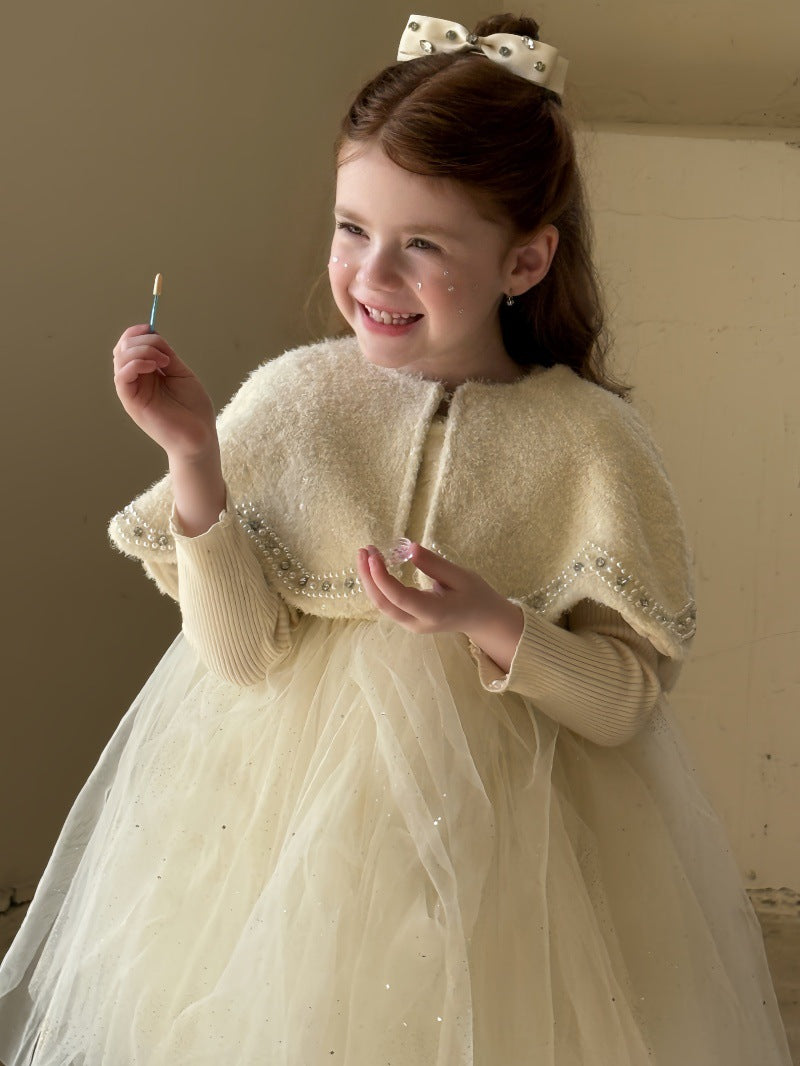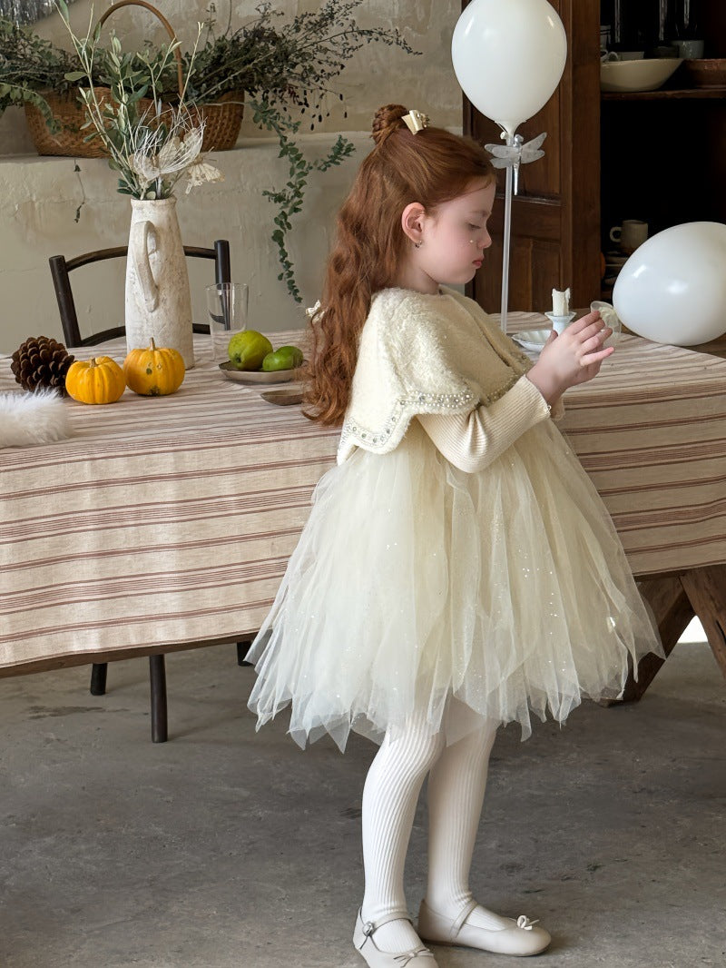 光沢のあるビジュー(釘打ちビーズ)を施したケープと、チュールスカートを組み合わせたノースリーブのドレスワンピースです。透け感のあるメッシュ素材を幾重にも重ねたボリューム感のあるスカートが、華やかなプリンセススタイルを演出します。セットで使えるショールは、室内のパーティや誕生日会など、シーンに合わせた温度調節やスタイルの変化を楽しめるデザインです。落ち着いた質感のノースリーブワンピースに繊細なチュールの質感を加えた上品なテイストで、発表会や特別な日の装いに適した子供用のフォーマルなセットアップです。