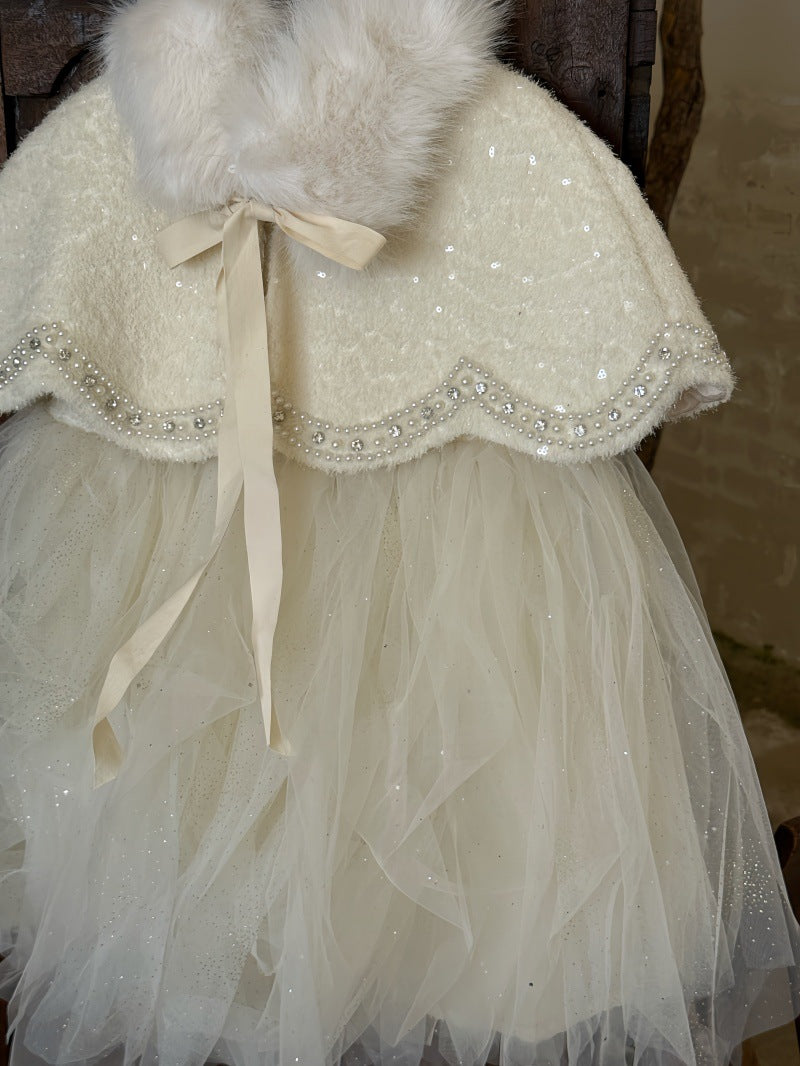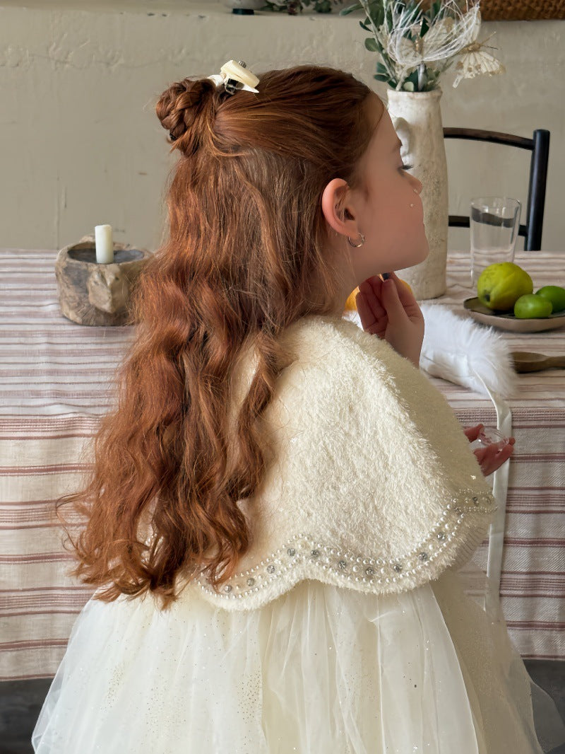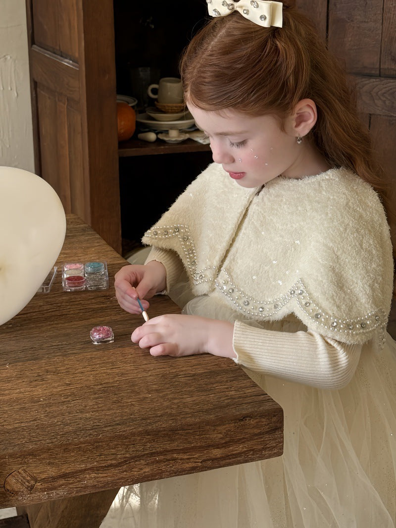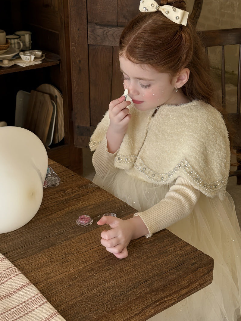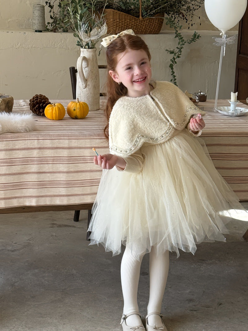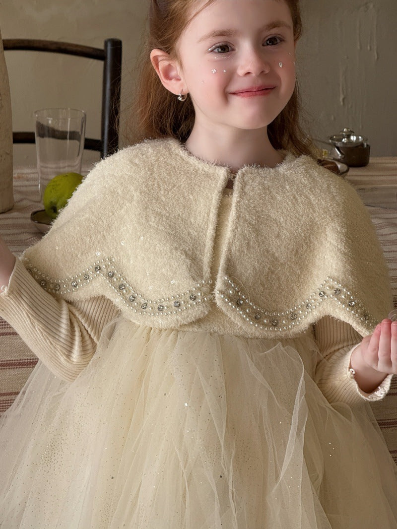 光沢のあるビジュー(釘打ちビーズ)を施したケープと、チュールスカートを組み合わせたノースリーブのドレスワンピースです。透け感のあるメッシュ素材を幾重にも重ねたボリューム感のあるスカートが、華やかなプリンセススタイルを演出します。セットで使えるショールは、室内のパーティや誕生日会など、シーンに合わせた温度調節やスタイルの変化を楽しめるデザインです。落ち着いた質感のノースリーブワンピースに繊細なチュールの質感を加えた上品なテイストで、発表会や特別な日の装いに適した子供用のフォーマルなセットアップです。