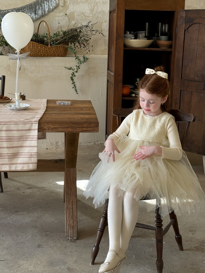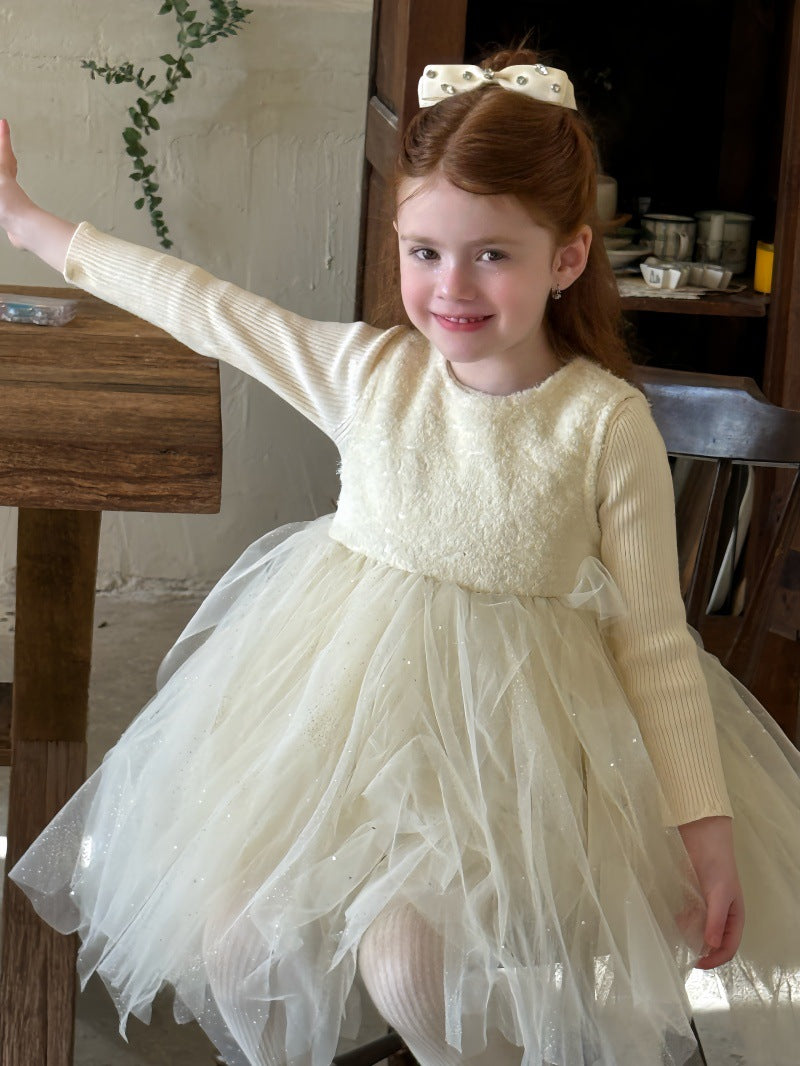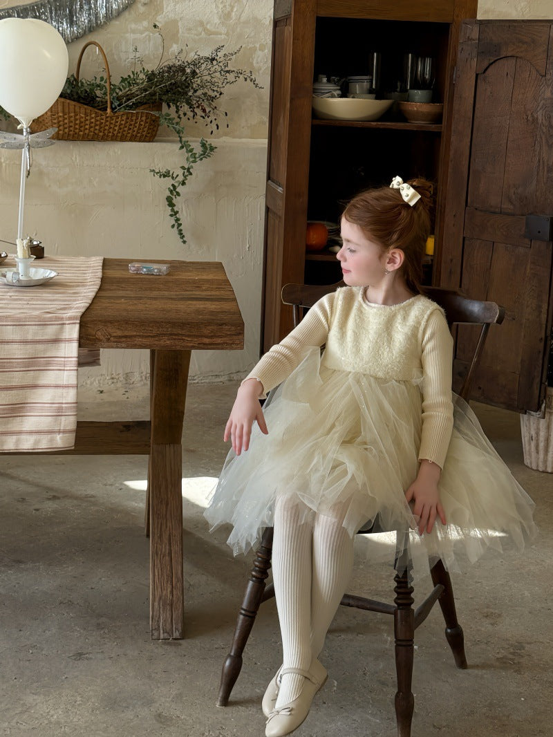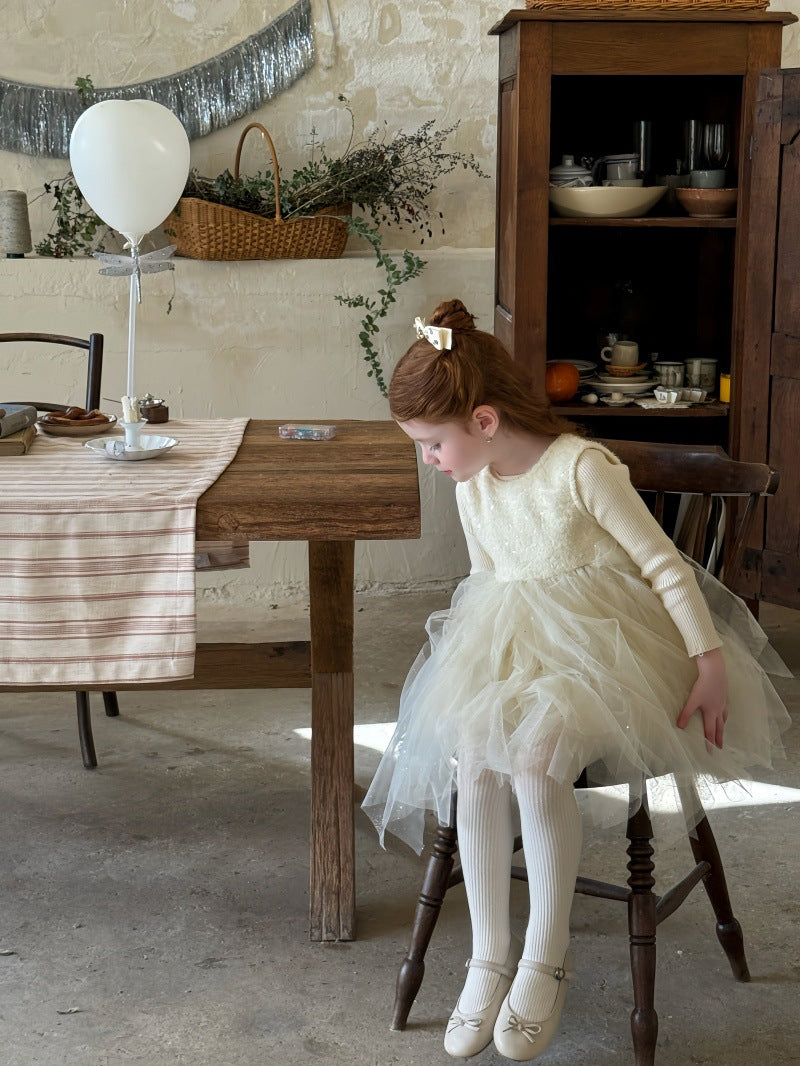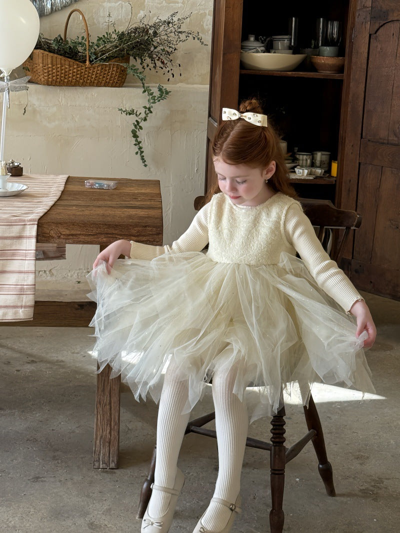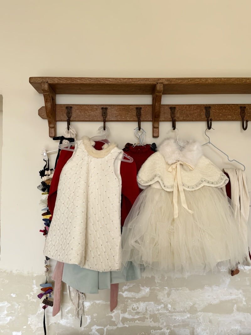 光沢のあるビジュー(釘打ちビーズ)を施したケープと、チュールスカートを組み合わせたノースリーブのドレスワンピースです。透け感のあるメッシュ素材を幾重にも重ねたボリューム感のあるスカートが、華やかなプリンセススタイルを演出します。セットで使えるショールは、室内のパーティや誕生日会など、シーンに合わせた温度調節やスタイルの変化を楽しめるデザインです。落ち着いた質感のノースリーブワンピースに繊細なチュールの質感を加えた上品なテイストで、発表会や特別な日の装いに適した子供用のフォーマルなセットアップです。