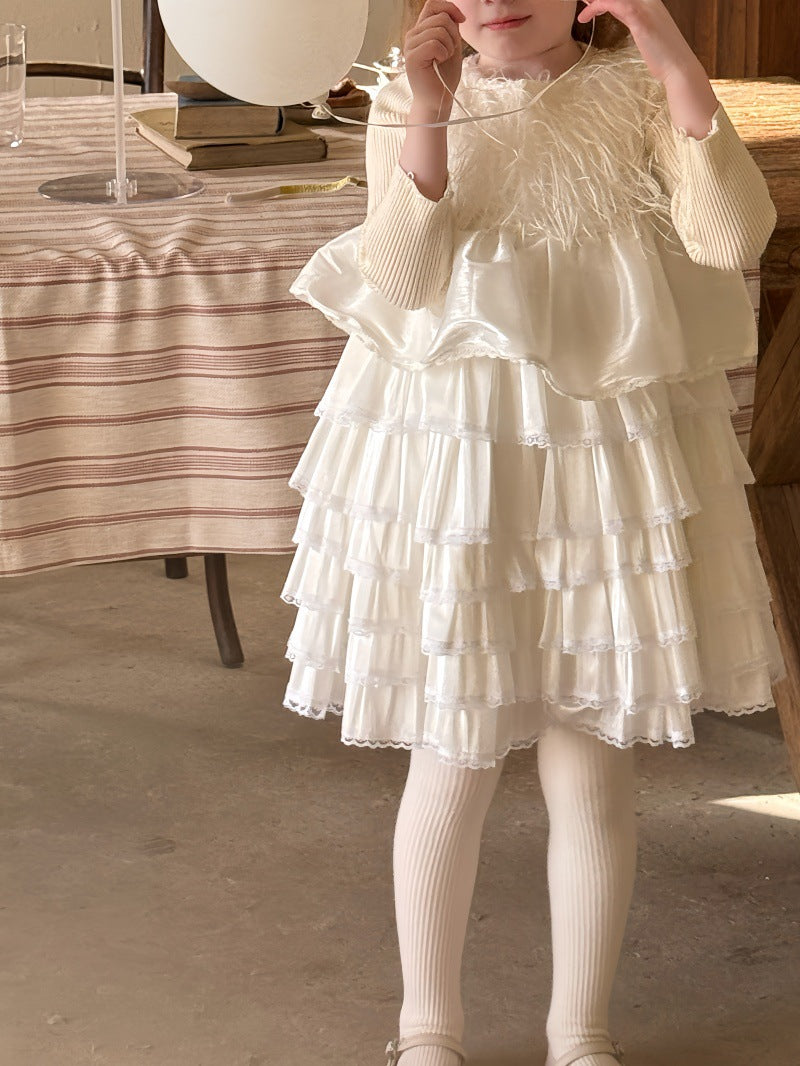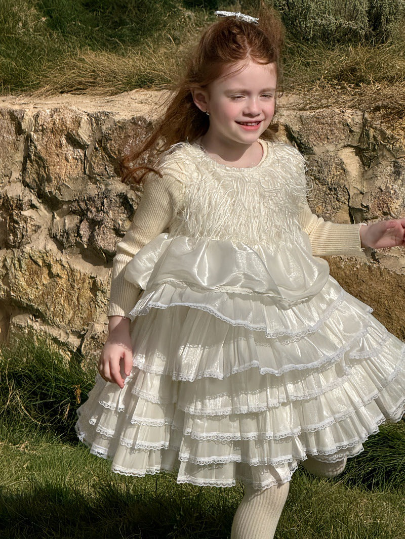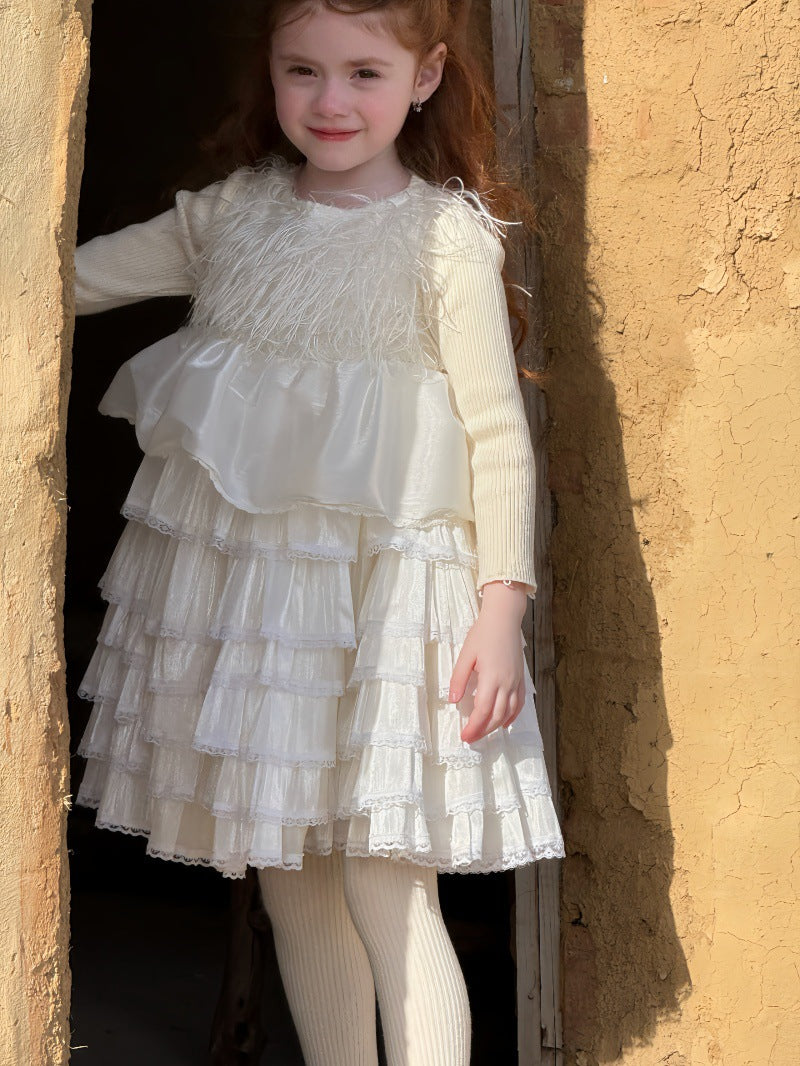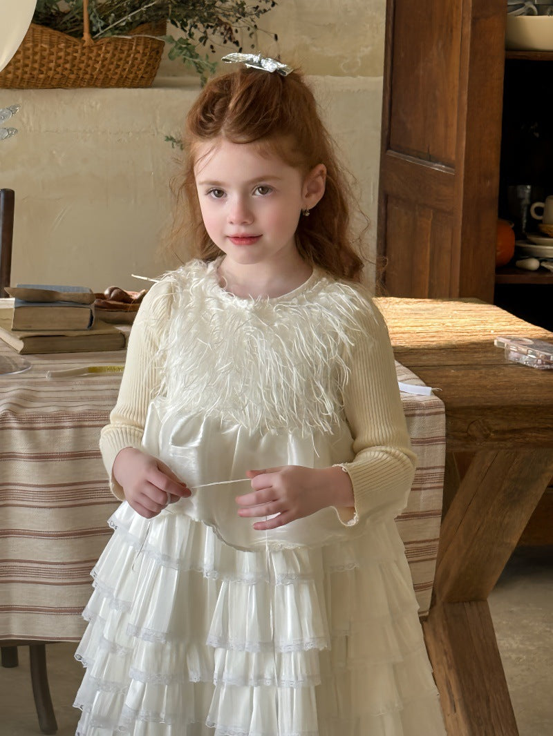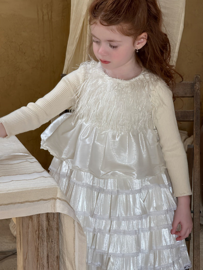 裾にかけて段々に重なったティアードケーキスカートが特徴的な、ノースリーブのプリンセスワンピースです。身頃や切り替え部分に施されたファーフリンジが冬らしいアクセントになり、ふんわりとしたボリューム感のあるシルエットが華やかな印象を与えます。インナーにブラウスやニットを合わせることで、季節やシーンに応じたレイヤードスタイルを楽しむことが可能です。誕生日会やパーティなどの特別な日のドレスとして適した、装飾性の高い上品なテイストで、一着で存在感のある着こなしが完成する子供服のスカートワンピースです。