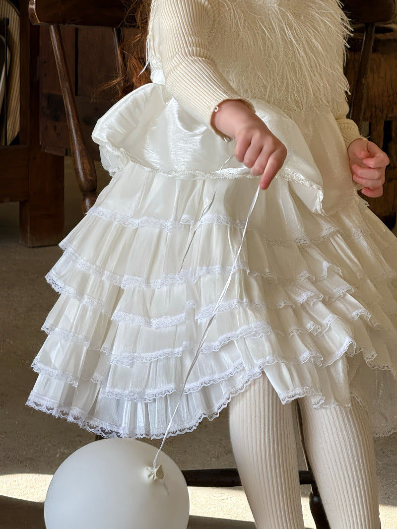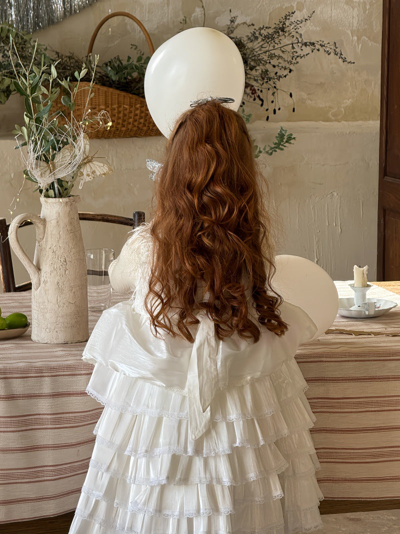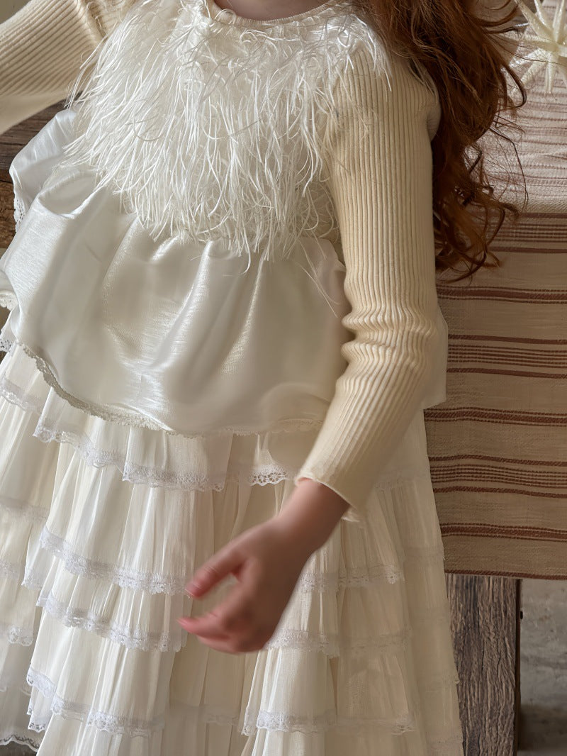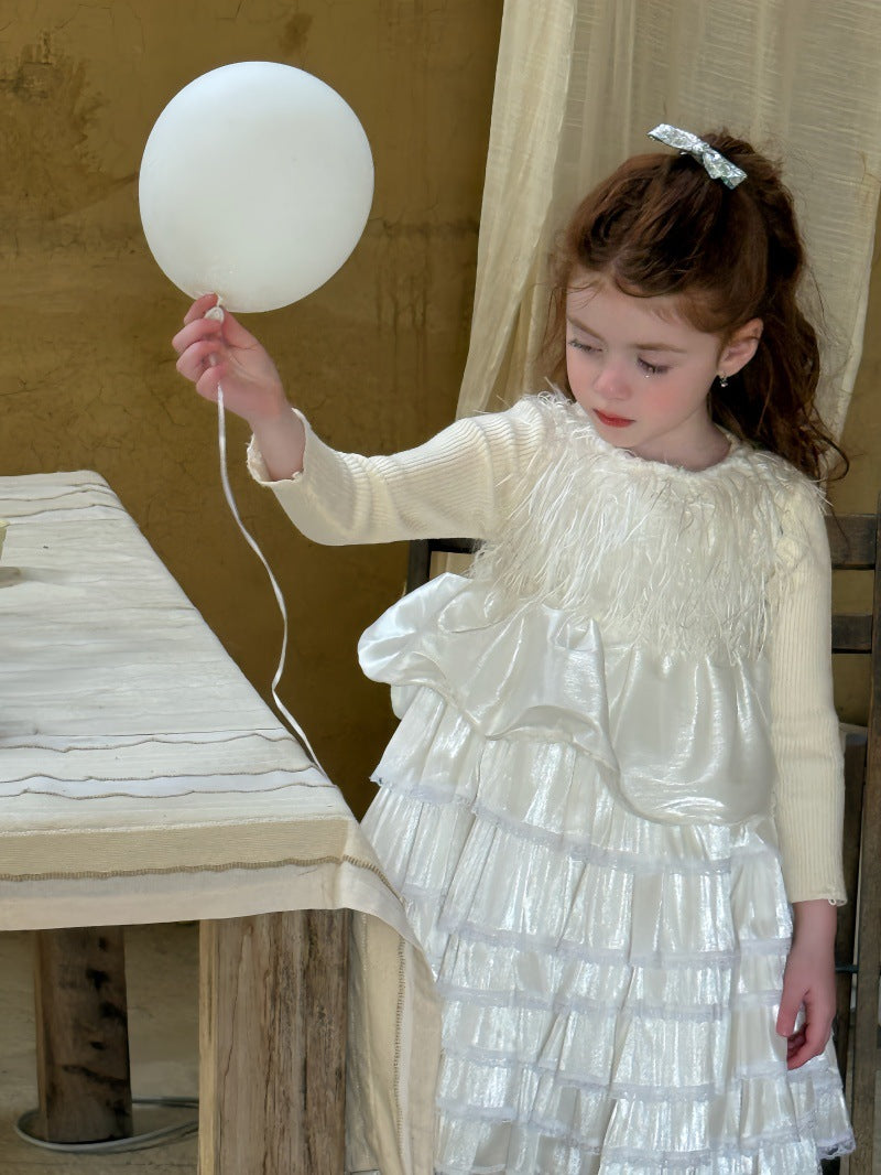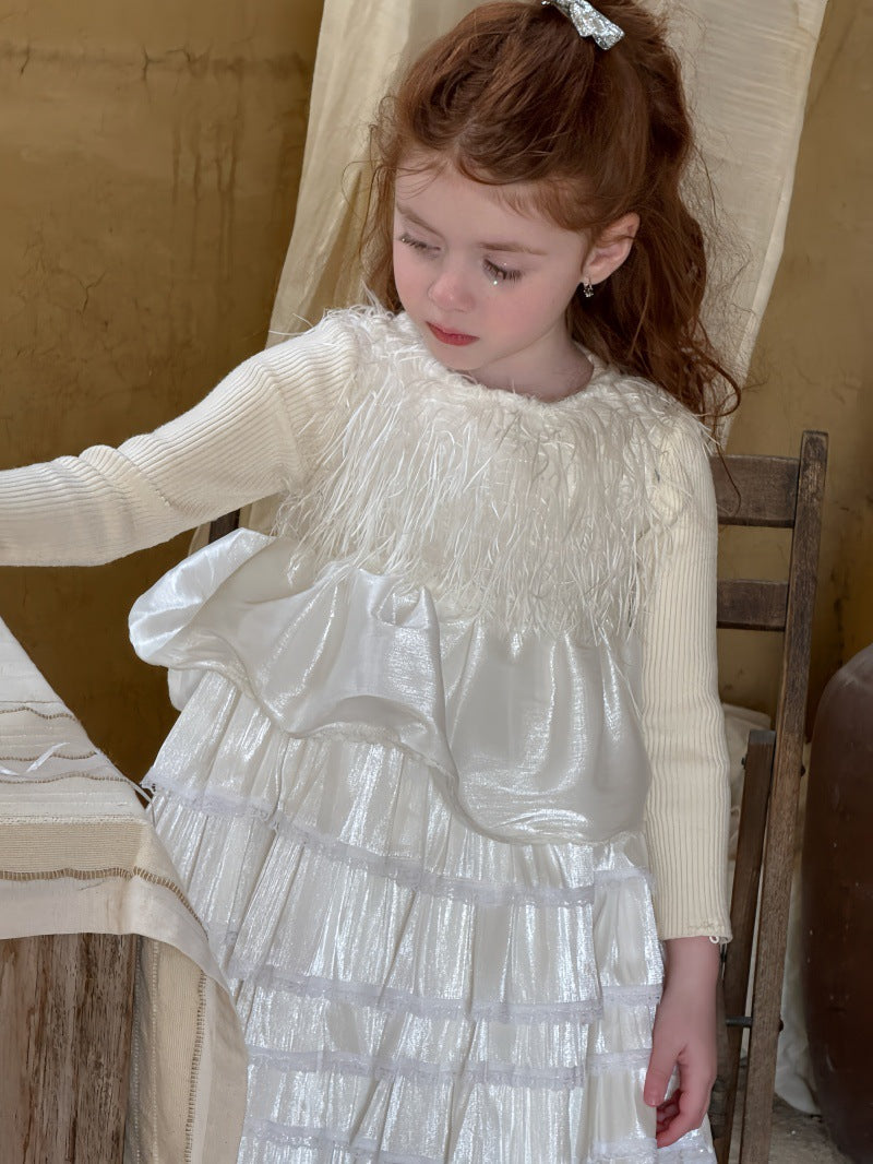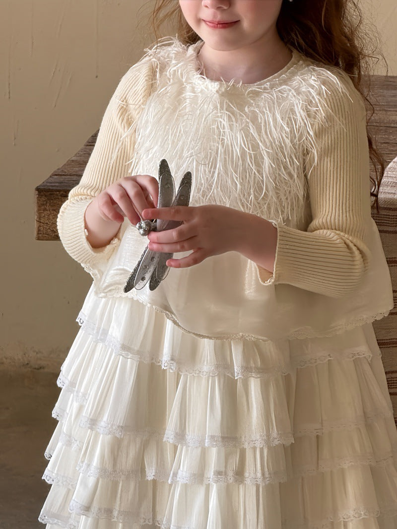 裾にかけて段々に重なったティアードケーキスカートが特徴的な、ノースリーブのプリンセスワンピースです。身頃や切り替え部分に施されたファーフリンジが冬らしいアクセントになり、ふんわりとしたボリューム感のあるシルエットが華やかな印象を与えます。インナーにブラウスやニットを合わせることで、季節やシーンに応じたレイヤードスタイルを楽しむことが可能です。誕生日会やパーティなどの特別な日のドレスとして適した、装飾性の高い上品なテイストで、一着で存在感のある着こなしが完成する子供服のスカートワンピースです。