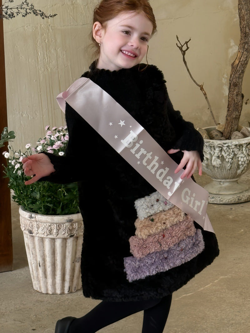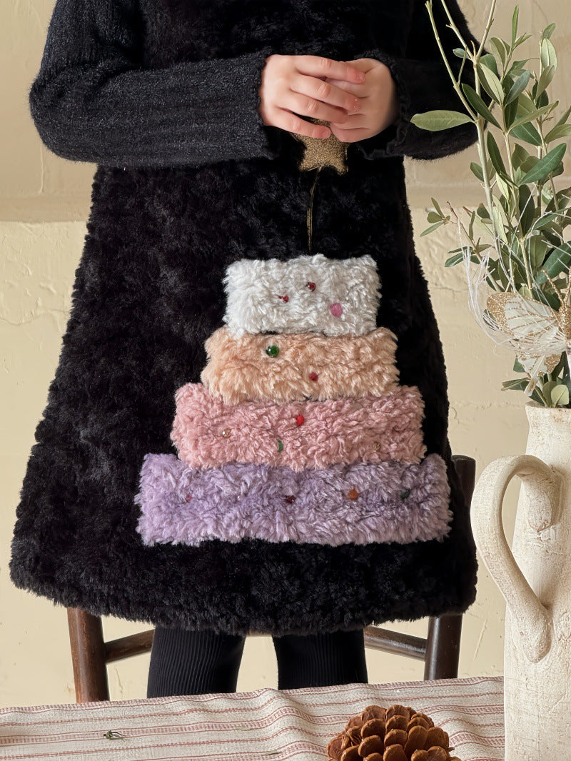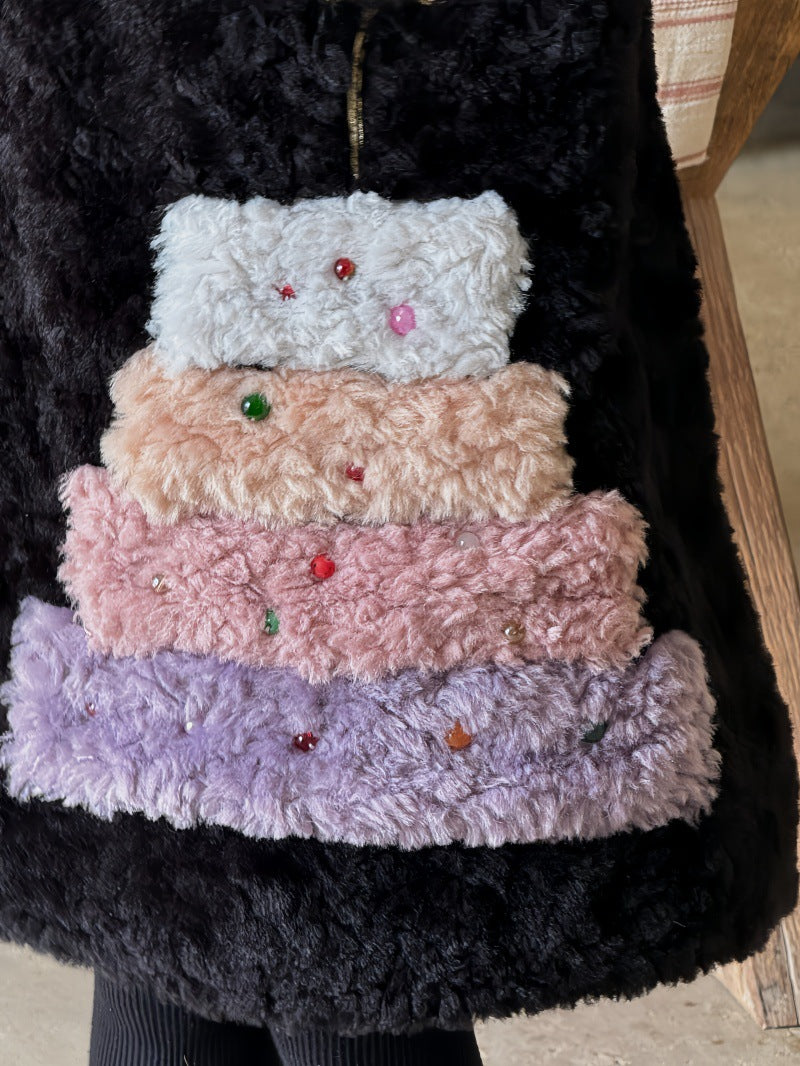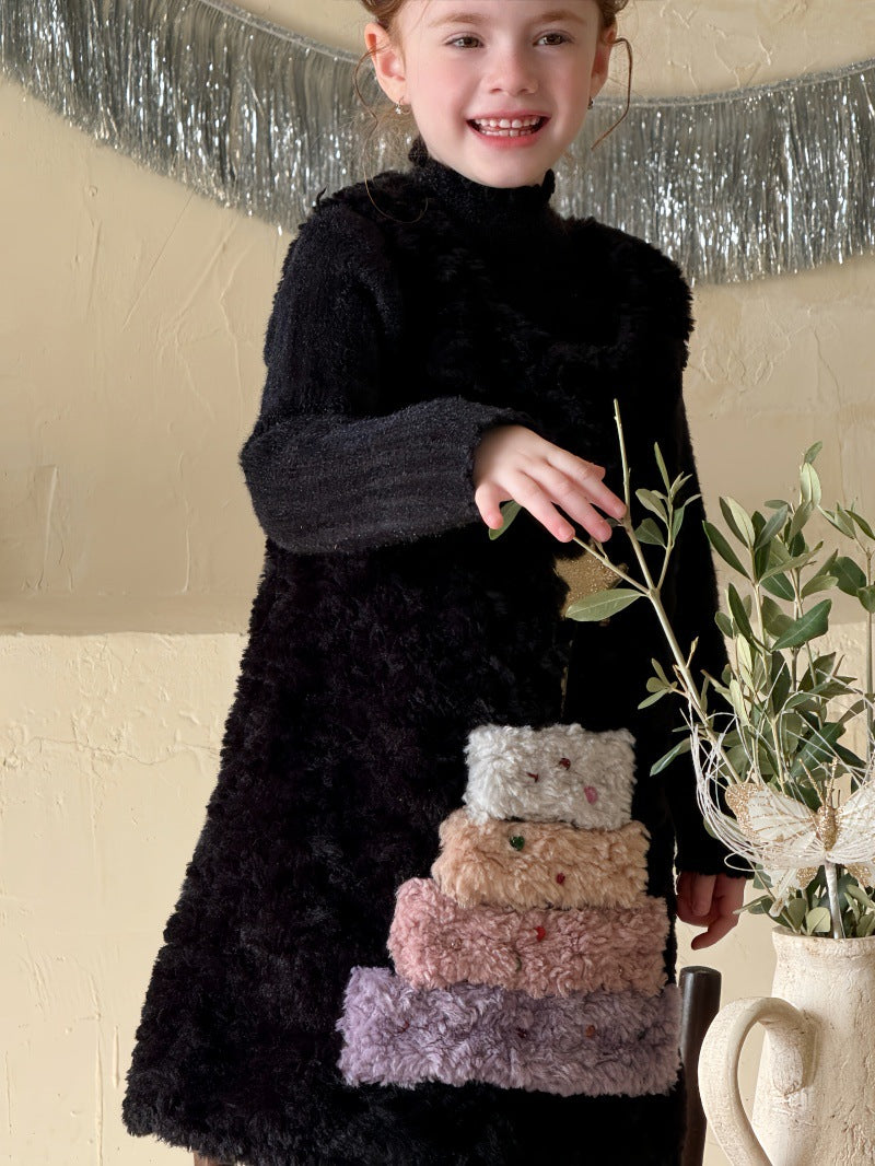 柔らかな質感のファーフリース素材を使用した、バースデーケーキをモチーフにしたデザインのノースリーブワンピースです。身頃には手作業で施された繊細なビーズ刺繍があしらわれ、ふんわりとした毛足の長い生地感と相まって、特別な日を彩る華やかなプリンセススタイルを演出します。ブラウスやタイツとのレイヤードがしやすいベストタイプのシルエットで、誕生日会やパーティなどの室内行事でも動きやすく、冬の寒さに対応する暖かさとドレスのような装飾性を両立した上品なテイストの子供用フォーマルウェアです。