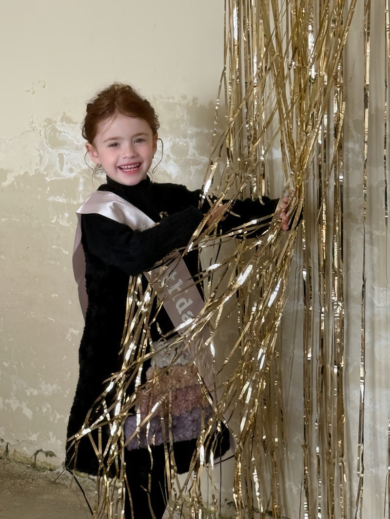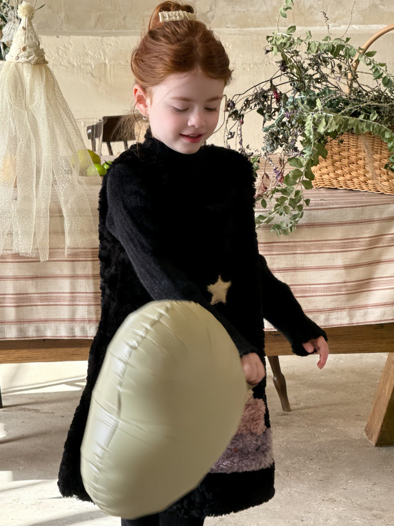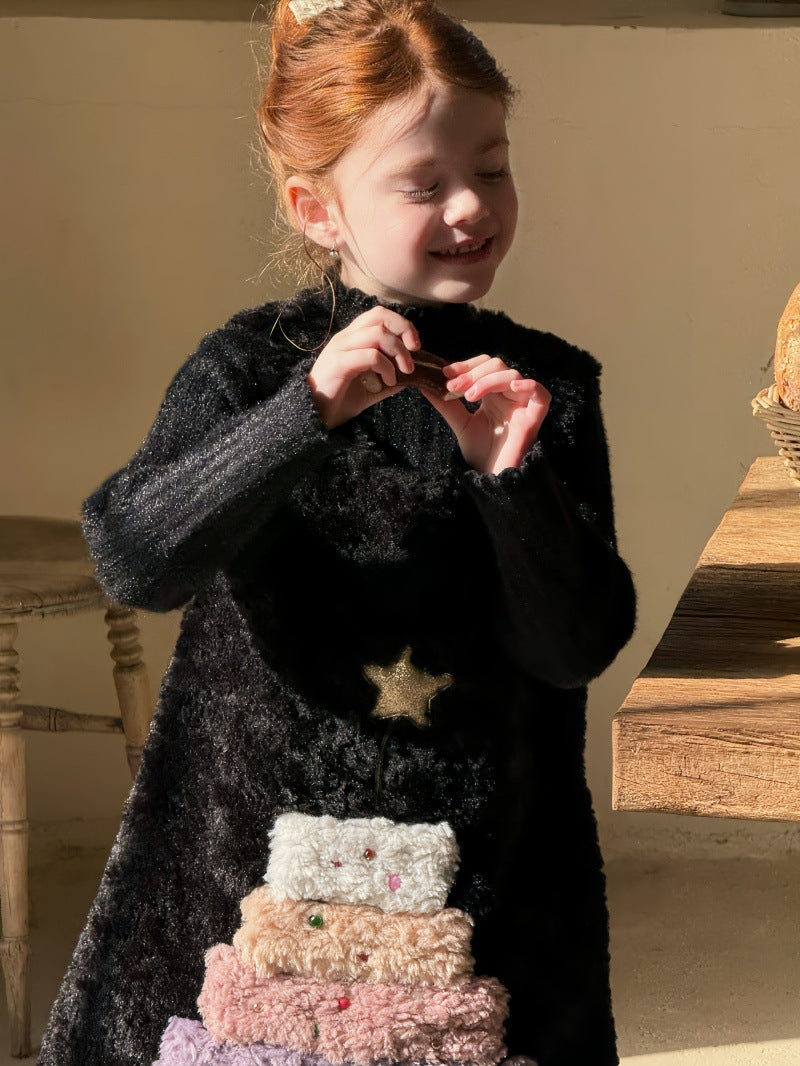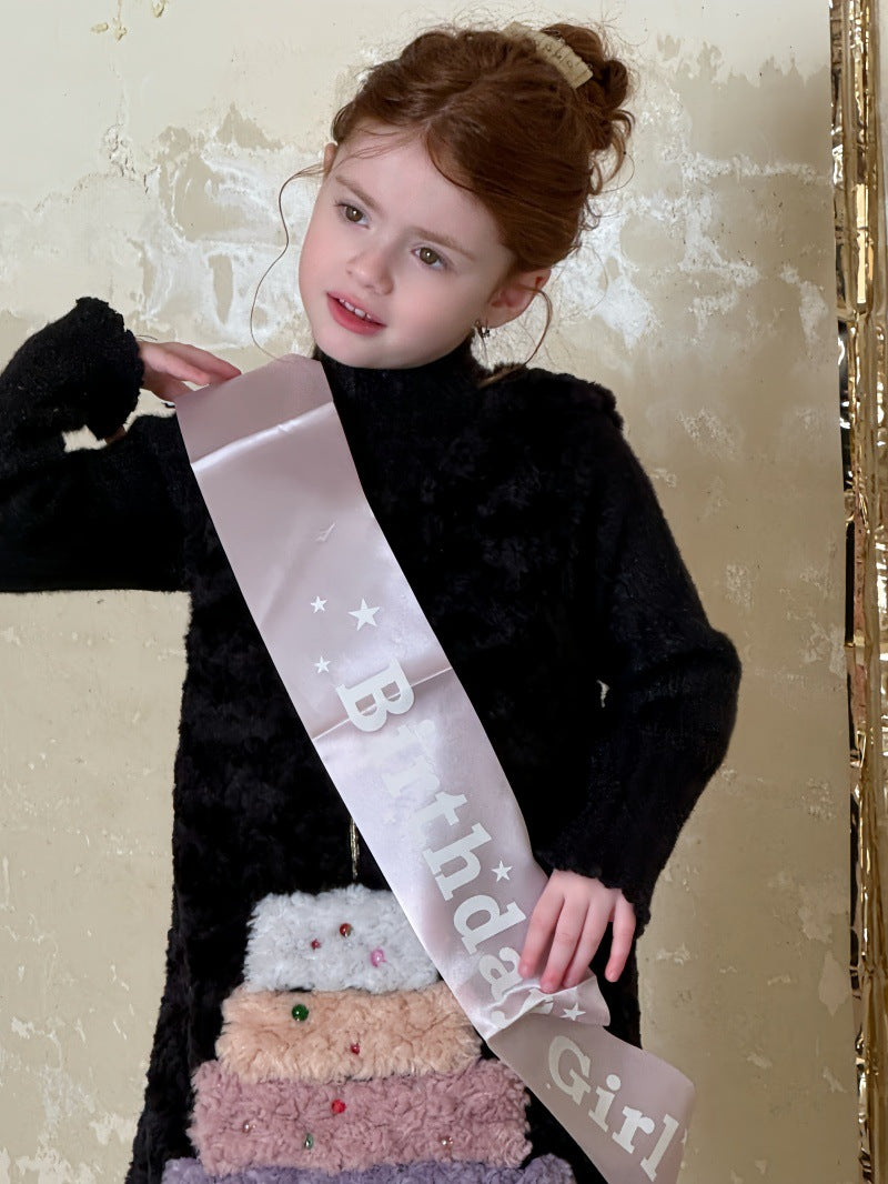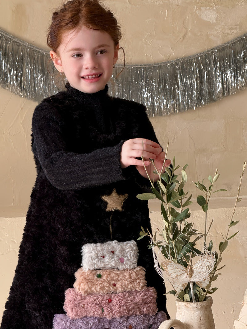 柔らかな質感のファーフリース素材を使用した、バースデーケーキをモチーフにしたデザインのノースリーブワンピースです。身頃には手作業で施された繊細なビーズ刺繍があしらわれ、ふんわりとした毛足の長い生地感と相まって、特別な日を彩る華やかなプリンセススタイルを演出します。ブラウスやタイツとのレイヤードがしやすいベストタイプのシルエットで、誕生日会やパーティなどの室内行事でも動きやすく、冬の寒さに対応する暖かさとドレスのような装飾性を両立した上品なテイストの子供用フォーマルウェアです。