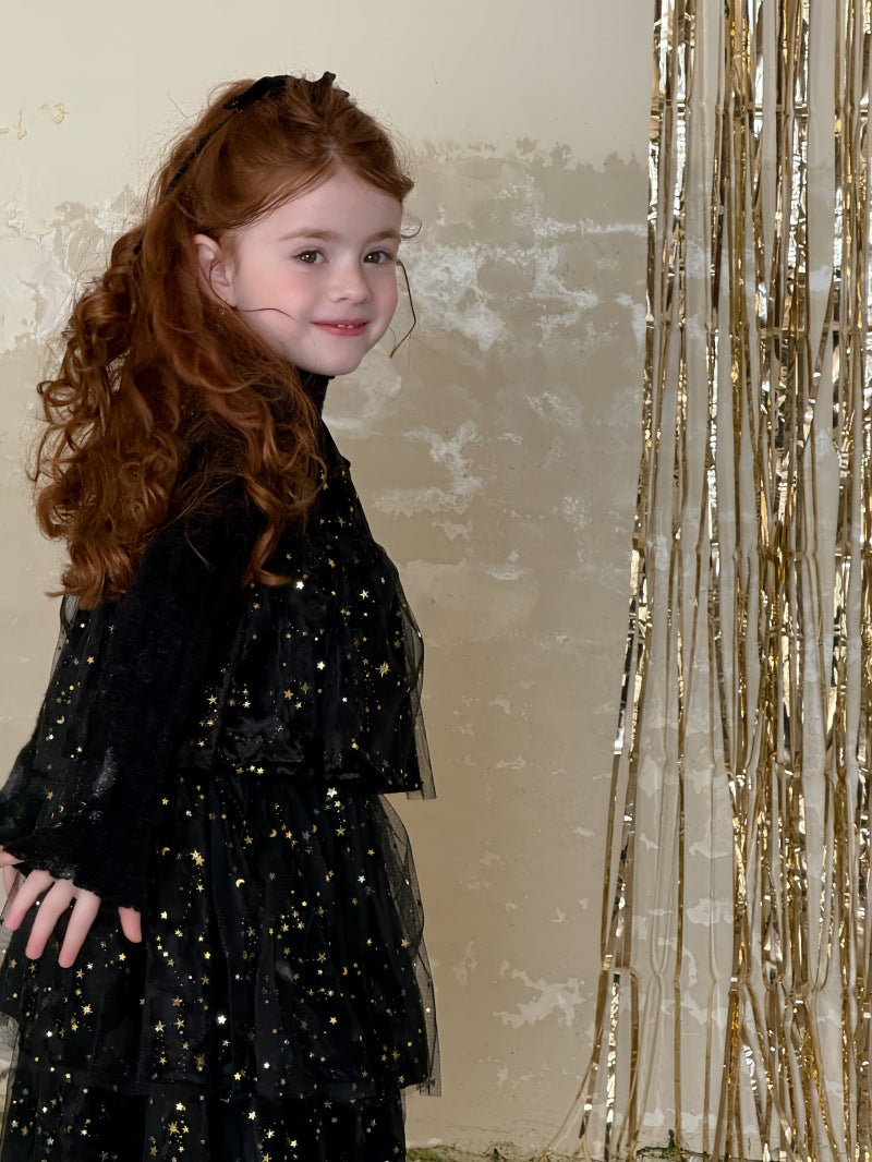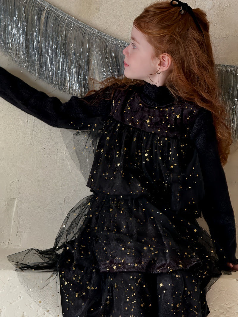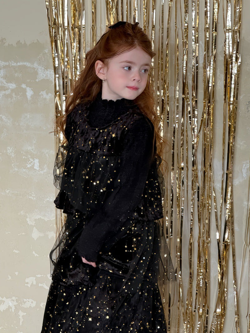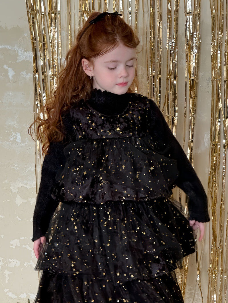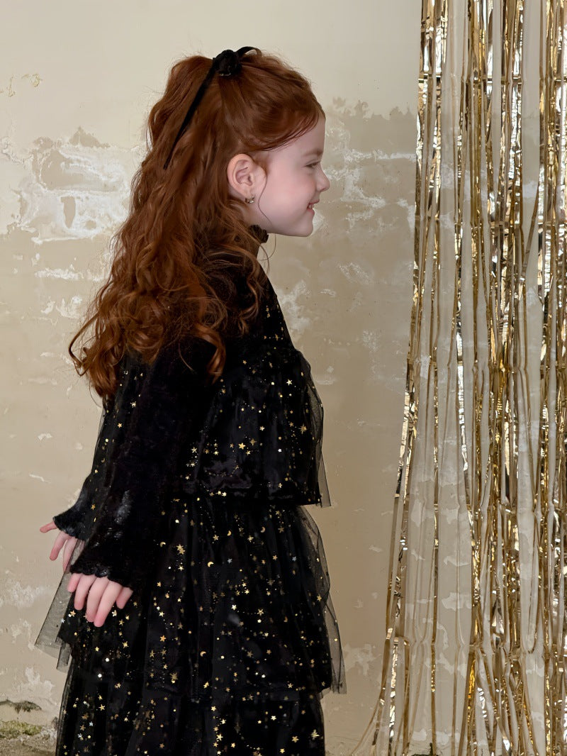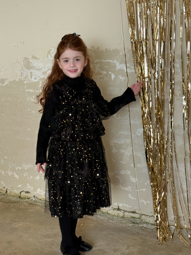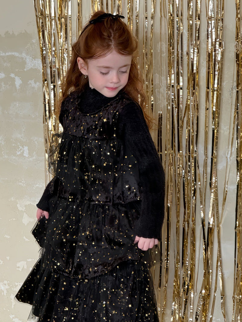上品な光沢のあるベルベット生地に、星型のスパンコールを散りばめたノースリーブワンピースです。身頃の柔らかな質感と、裾に向けてふんわりと広がるケーキのような段仕立てのメッシュスカートを組み合わせることで、華やかなプリンセススタイルを演出します。星の装飾が光を反射して煌めき、誕生日会やパーティなどの特別な日を彩る主役級のドレスに仕上げられています。ブラウスやニットを合わせたレイヤードスタイルに適したデザインで、冬の行事にふさわしい高級感と、子供らしい愛らしさを兼ね備えた一着です。