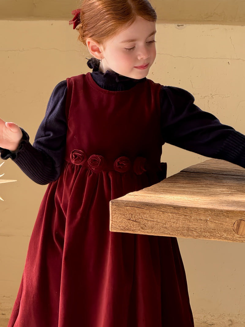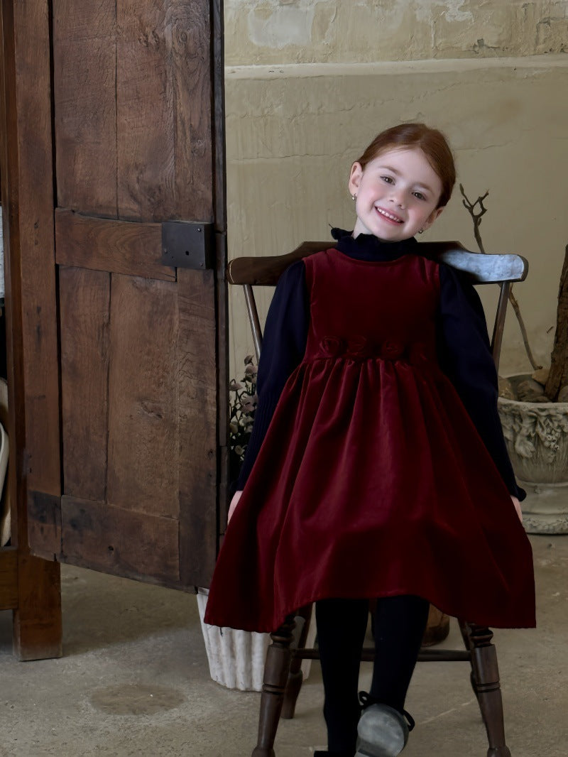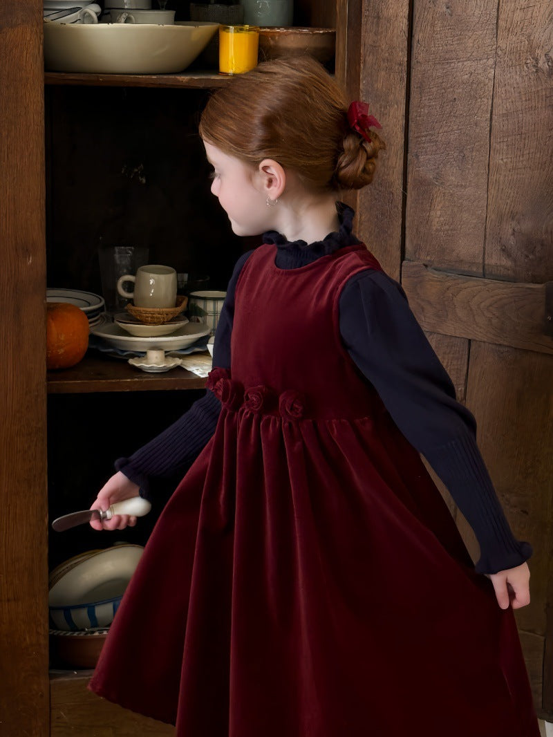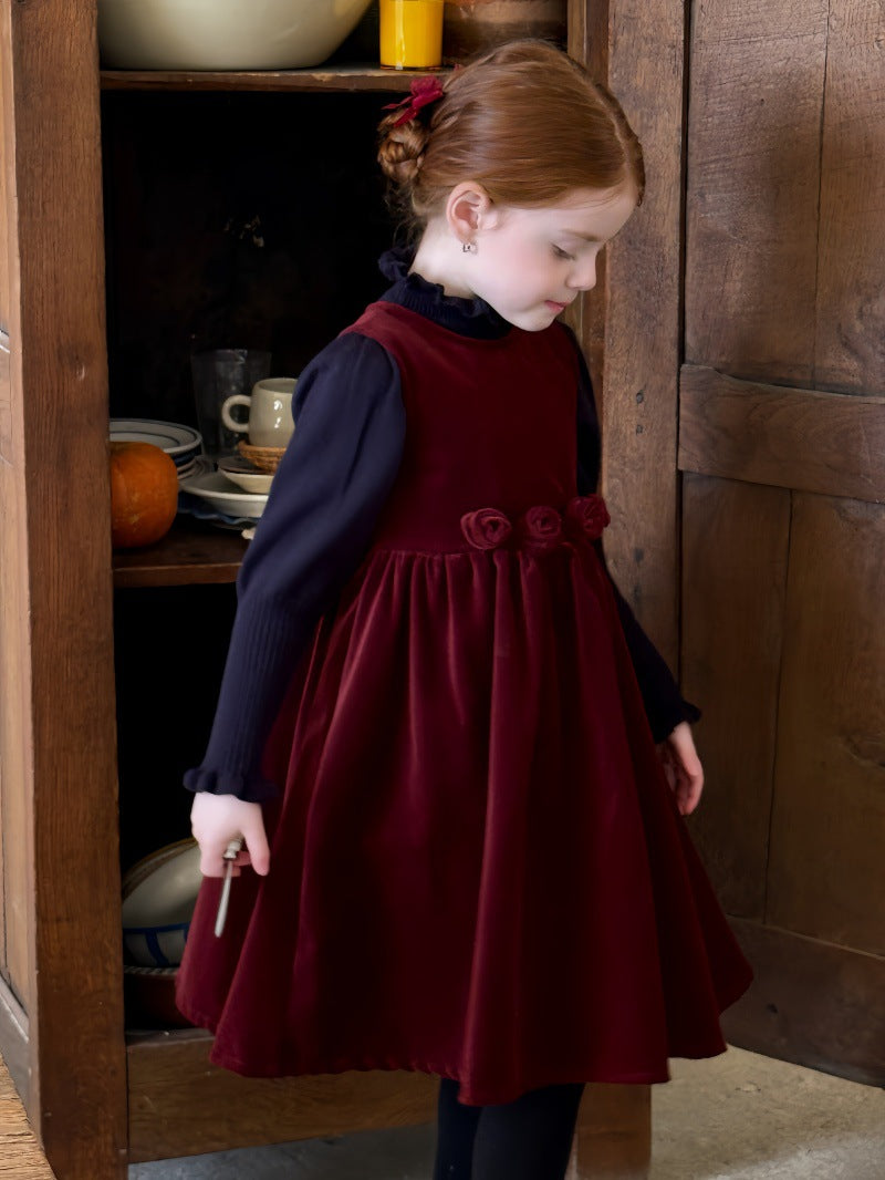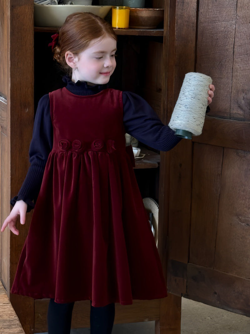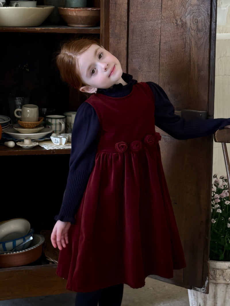 立体的なローズモチーフを贅沢にあしらった、フレンチヴィンテージ風のノースリーブワンピースです。素材には上質なコットンベルベットを使用し、深みのある光沢と柔らかな質感がクラシカルで洗練された雰囲気を演出します。胸元やスカート部分に配された立体的な花々がアクセントとなり、シンプルながらも存在感のあるフレンチスタイルのドレスに仕上げられています。ブラウスとの重ね着もしやすいジャンパースカート型のデザインで、誕生日会や発表会などの特別な日から、上品なお出かけ着まで幅広く活躍する冬の主役級アイテムです。