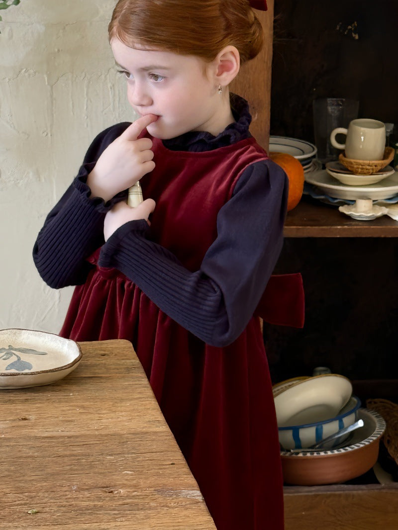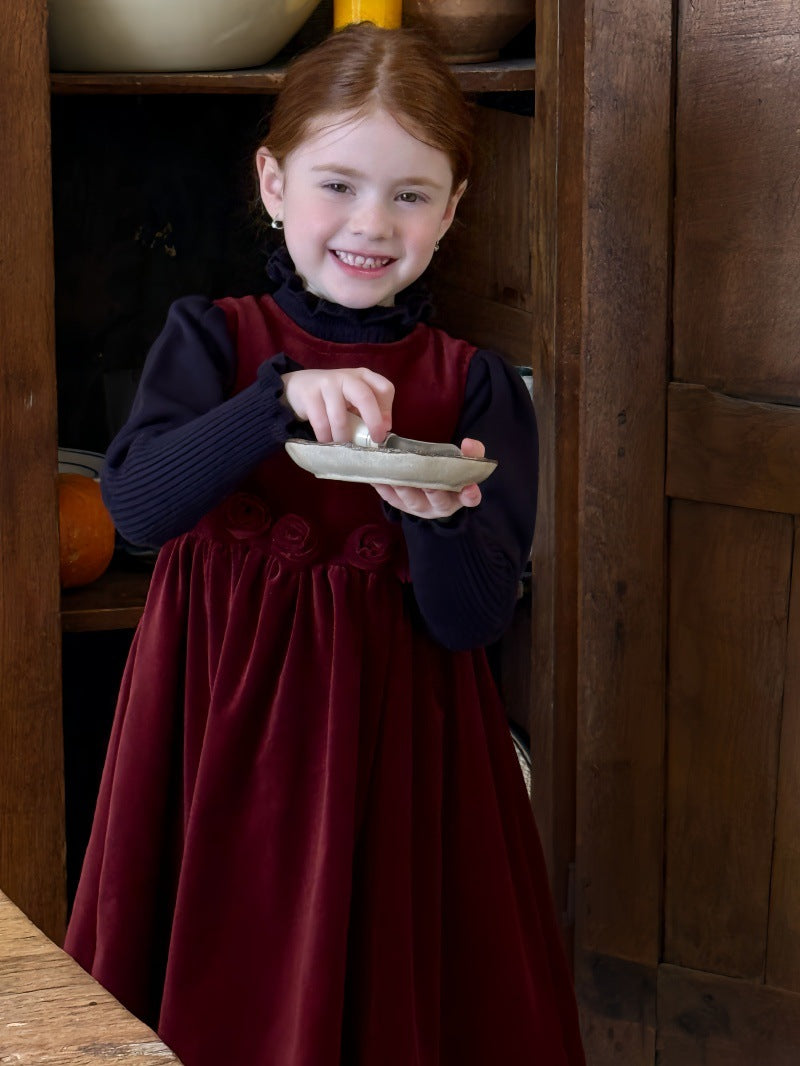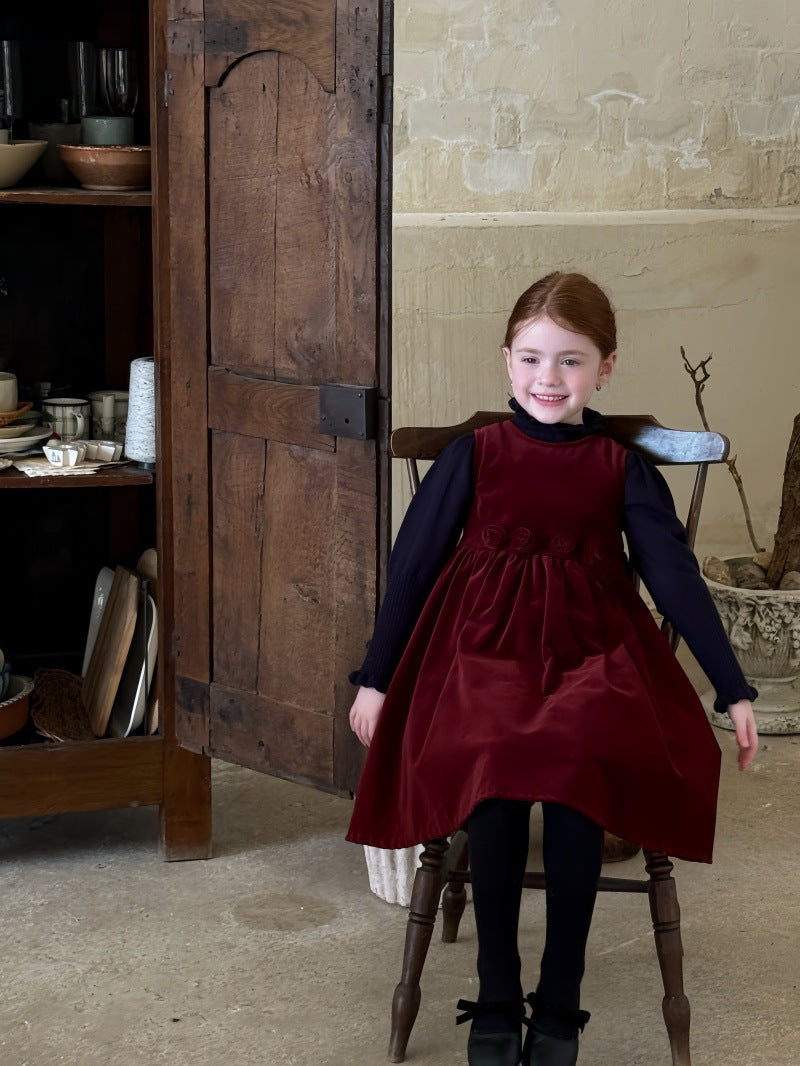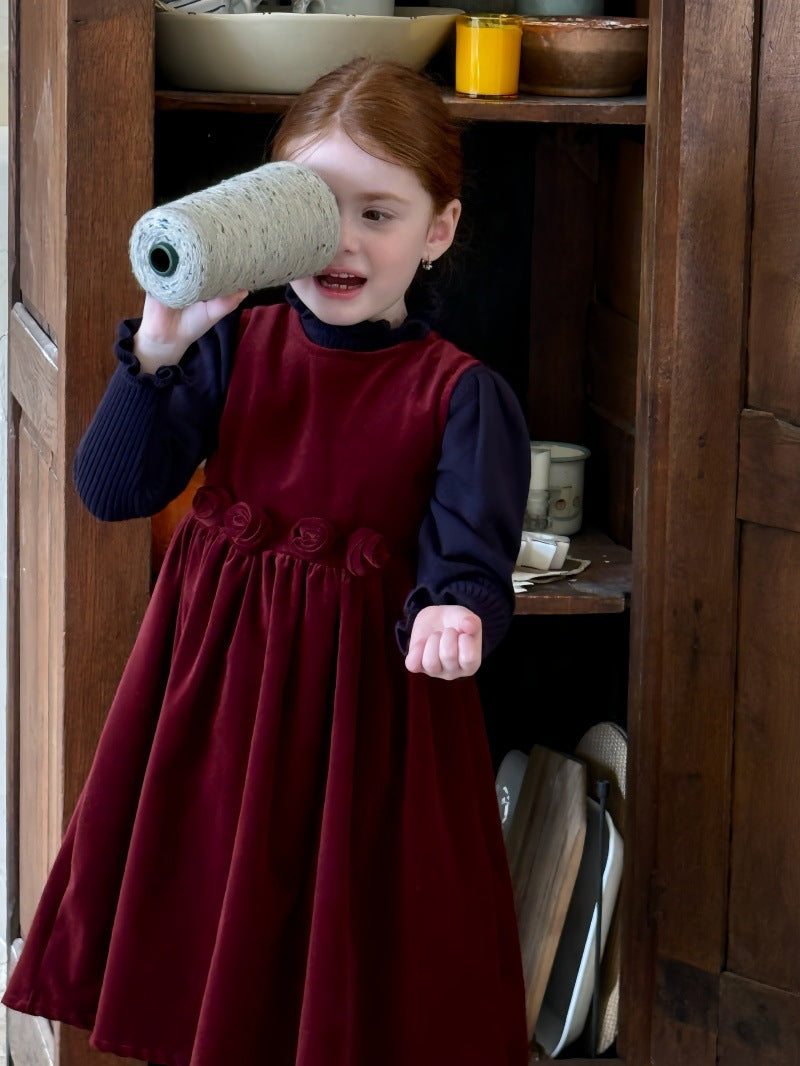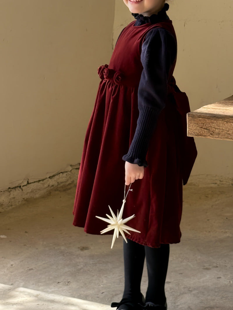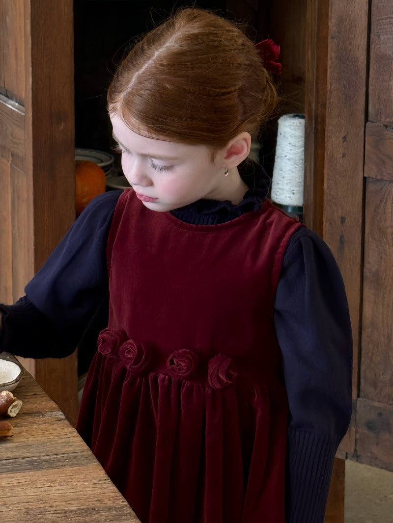 立体的なローズモチーフを贅沢にあしらった、フレンチヴィンテージ風のノースリーブワンピースです。素材には上質なコットンベルベットを使用し、深みのある光沢と柔らかな質感がクラシカルで洗練された雰囲気を演出します。胸元やスカート部分に配された立体的な花々がアクセントとなり、シンプルながらも存在感のあるフレンチスタイルのドレスに仕上げられています。ブラウスとの重ね着もしやすいジャンパースカート型のデザインで、誕生日会や発表会などの特別な日から、上品なお出かけ着まで幅広く活躍する冬の主役級アイテムです。