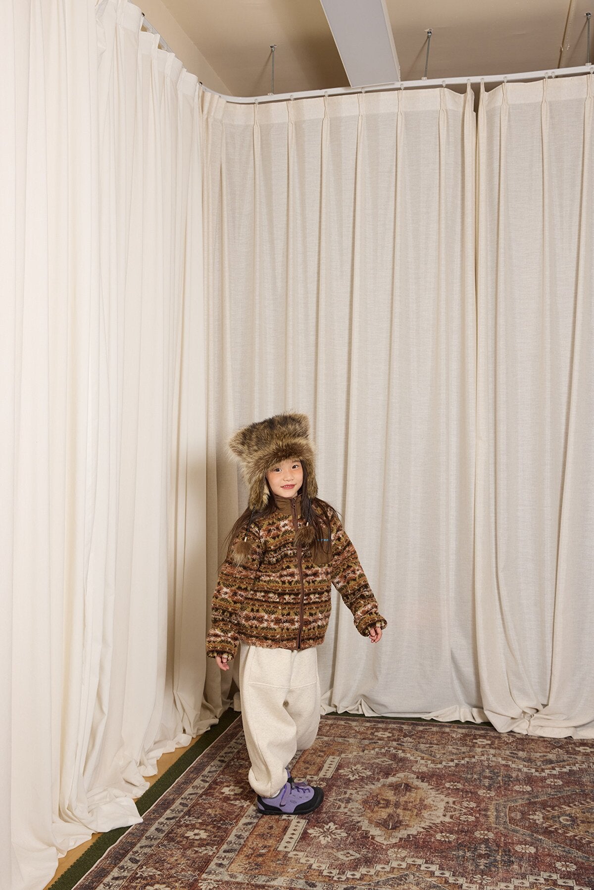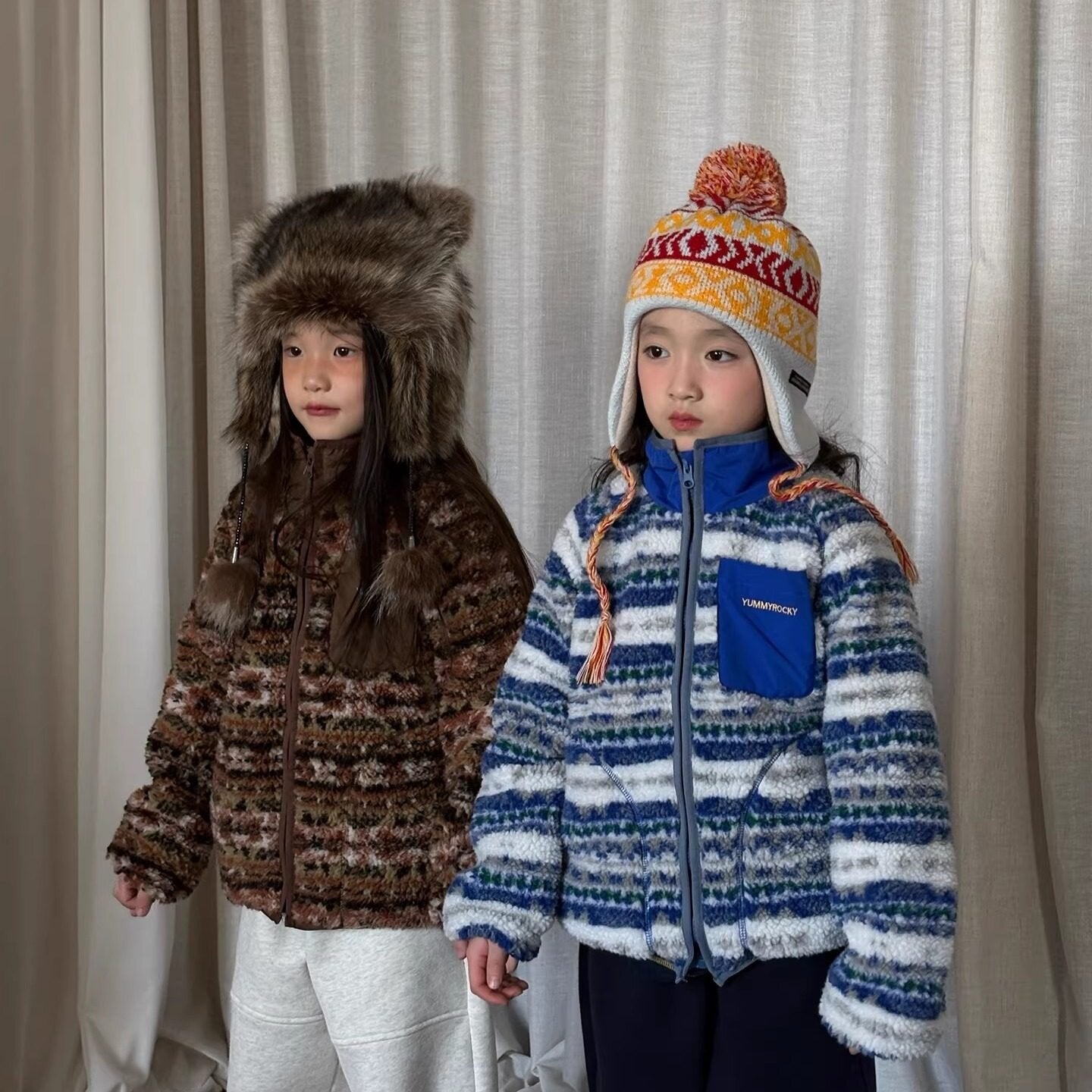 繊細な色使いが目を引く、上質なラムウール風ボアを使用したジップシャツです。温かみのあるブラウンと、クールなブルーの2色展開で、冬の通学やお出かけの主役として活躍します。