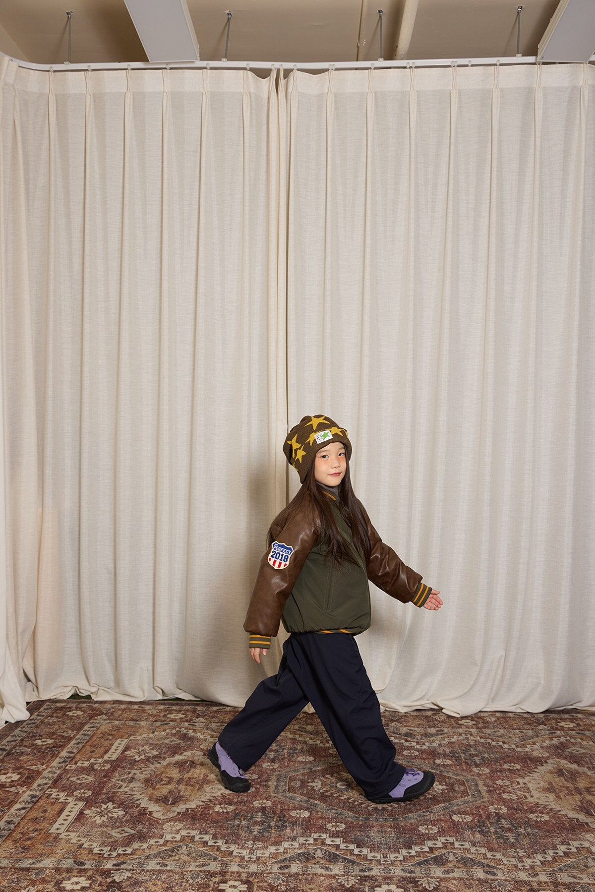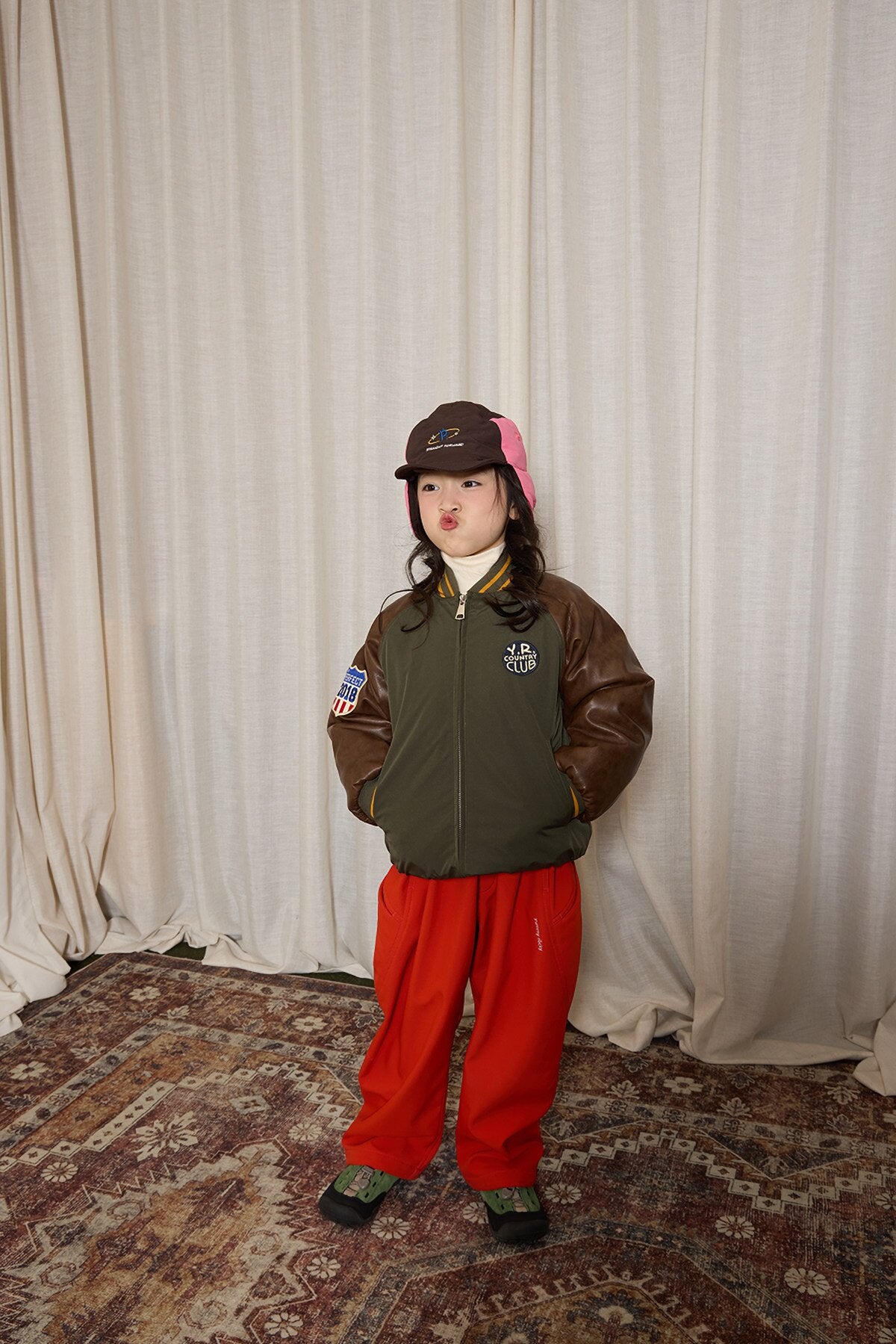 全体的にゆとりのあるワイドな作りです。裾にゴムが入っているため、少し大きめを選んでも引きずる心配がなく、たゆんだシルエットが可愛く決まります。 ウエストは総ゴムで脱ぎ履きも楽々。キャンプや公園遊びなど、冬のアウトドアシーンでの「オーバーパンツ」としても非常に優秀です。