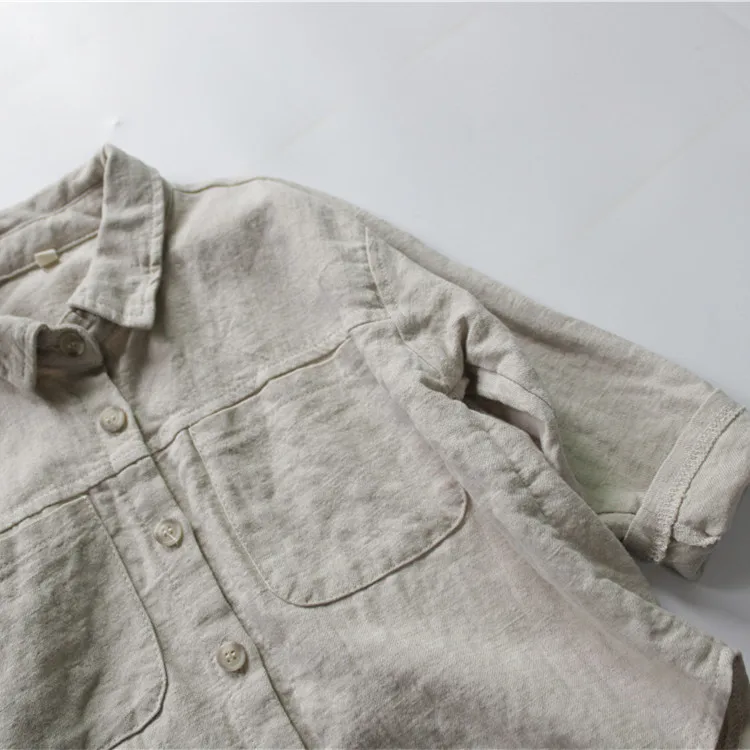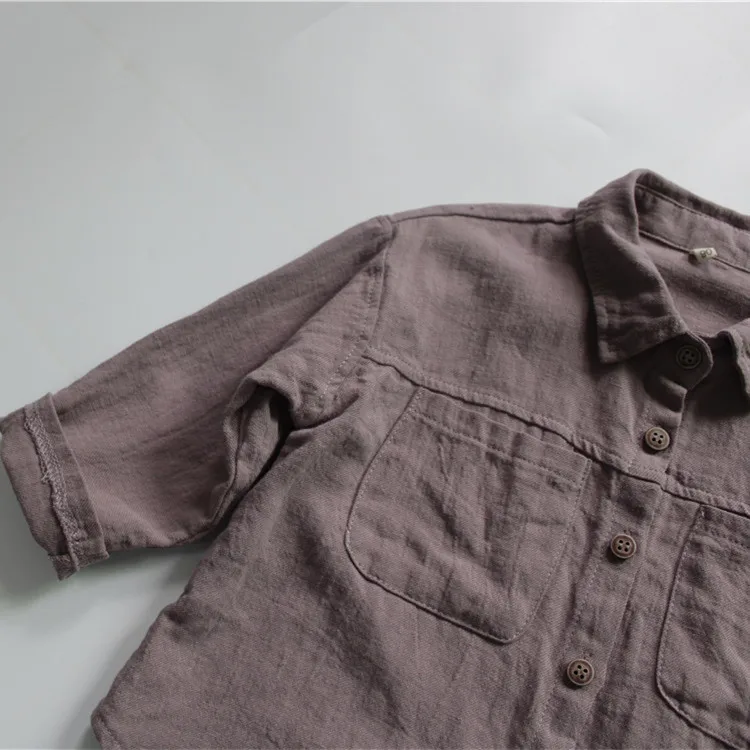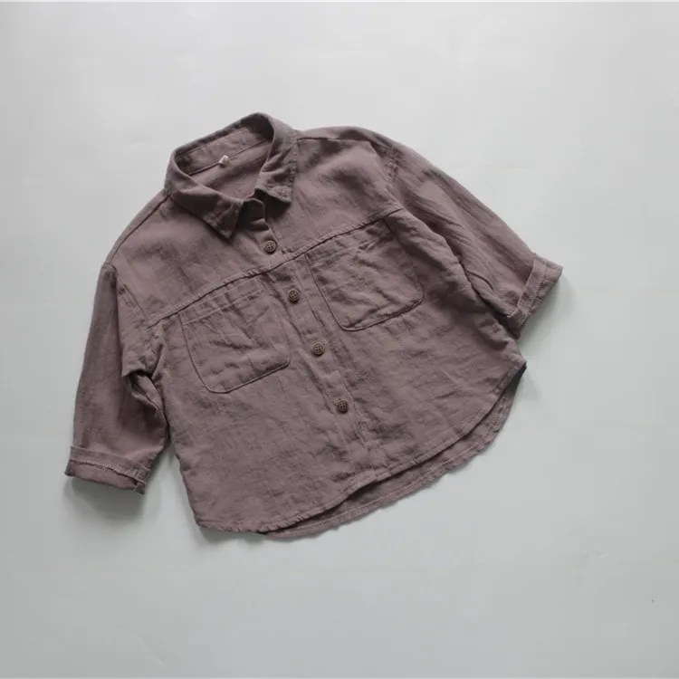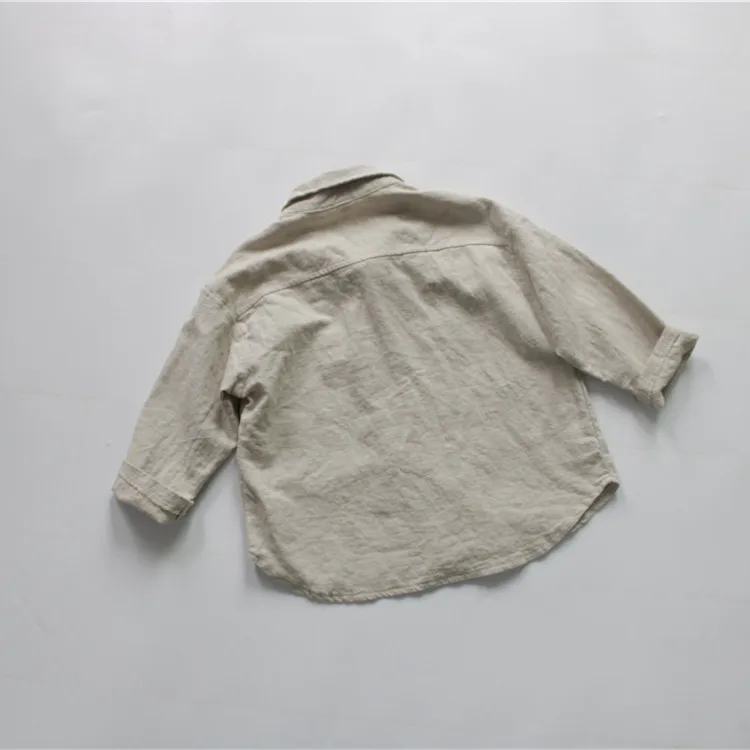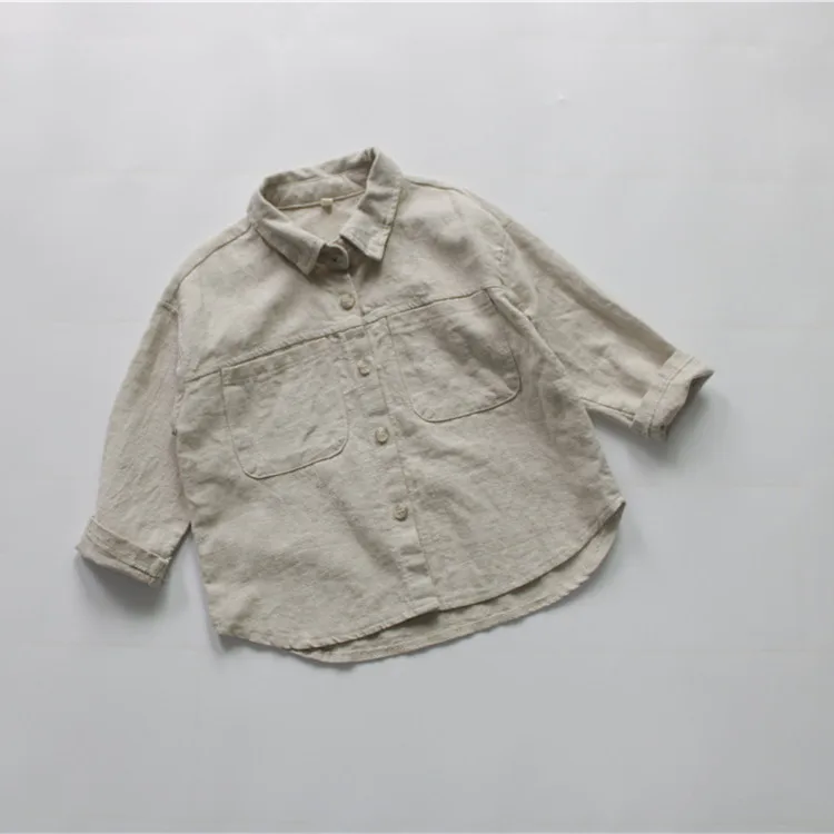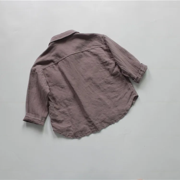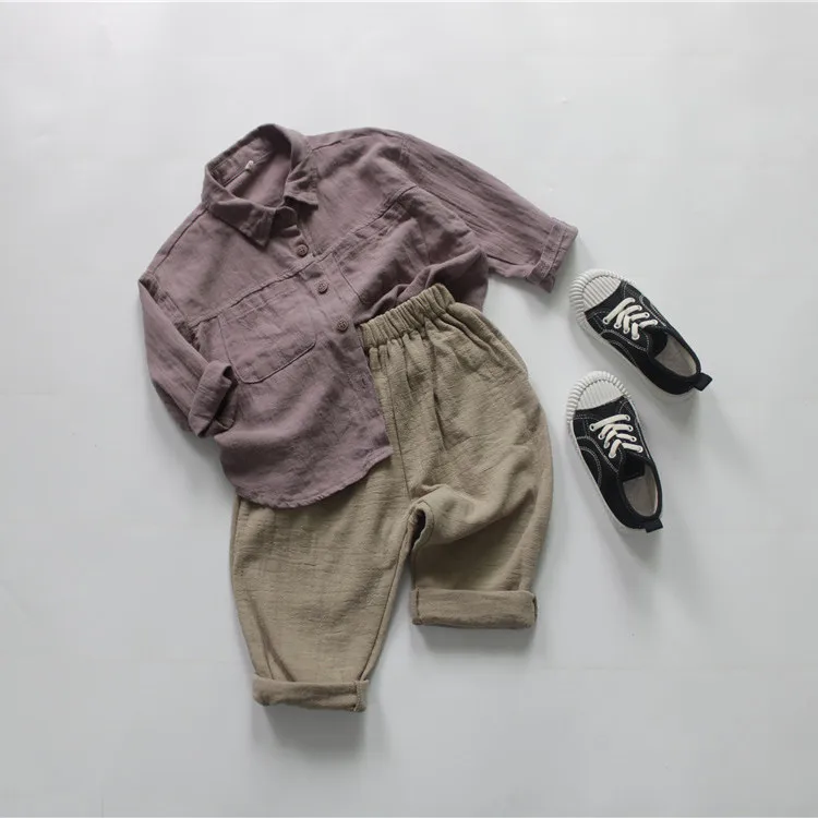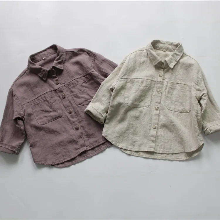 この子供用の長袖シャツは、リネンとコットンの生地でしっかりとした着心地と、ベージュ、紫、および無地なカラーバリエーションが特徴的なデザインです。さらに他との区別がつくシンプルなベーシックデザインなので、カジュアルならびにフォーマルな場面にマッチします。